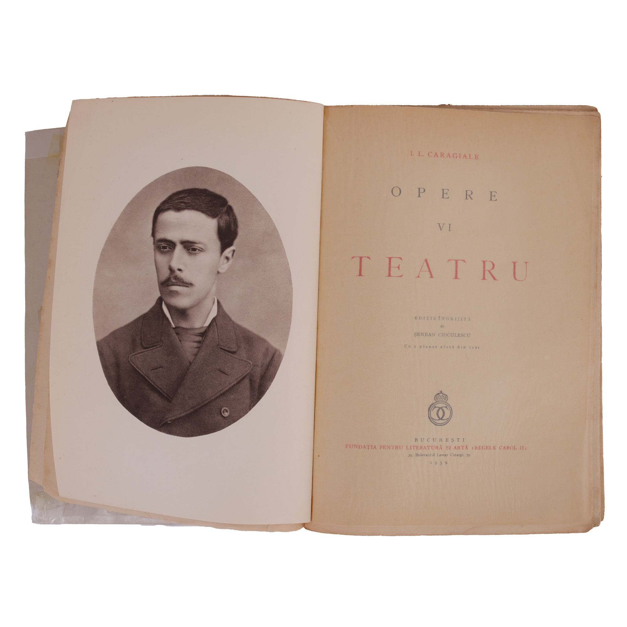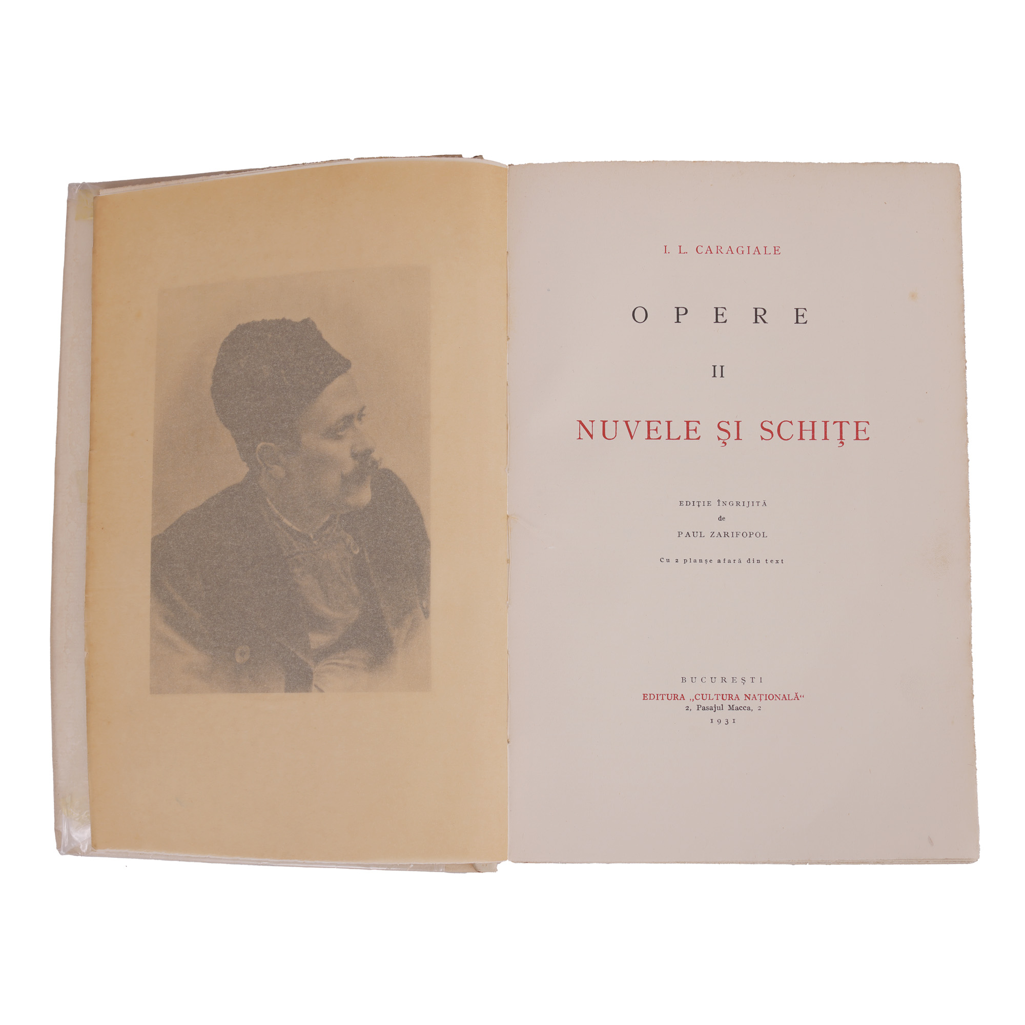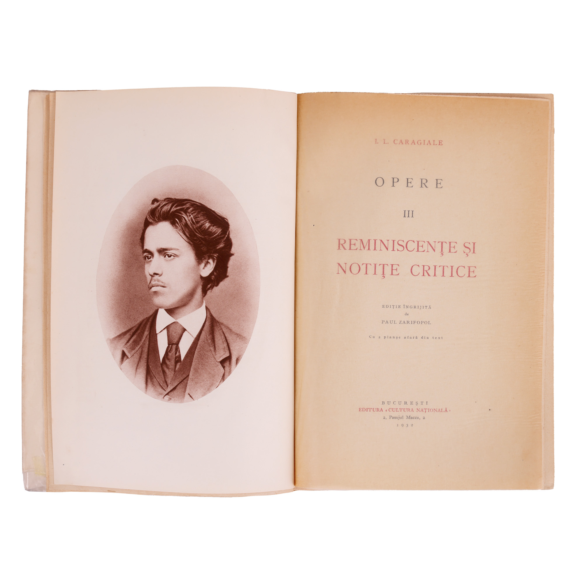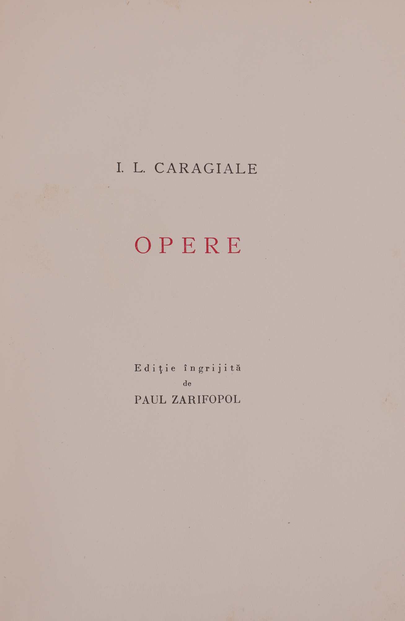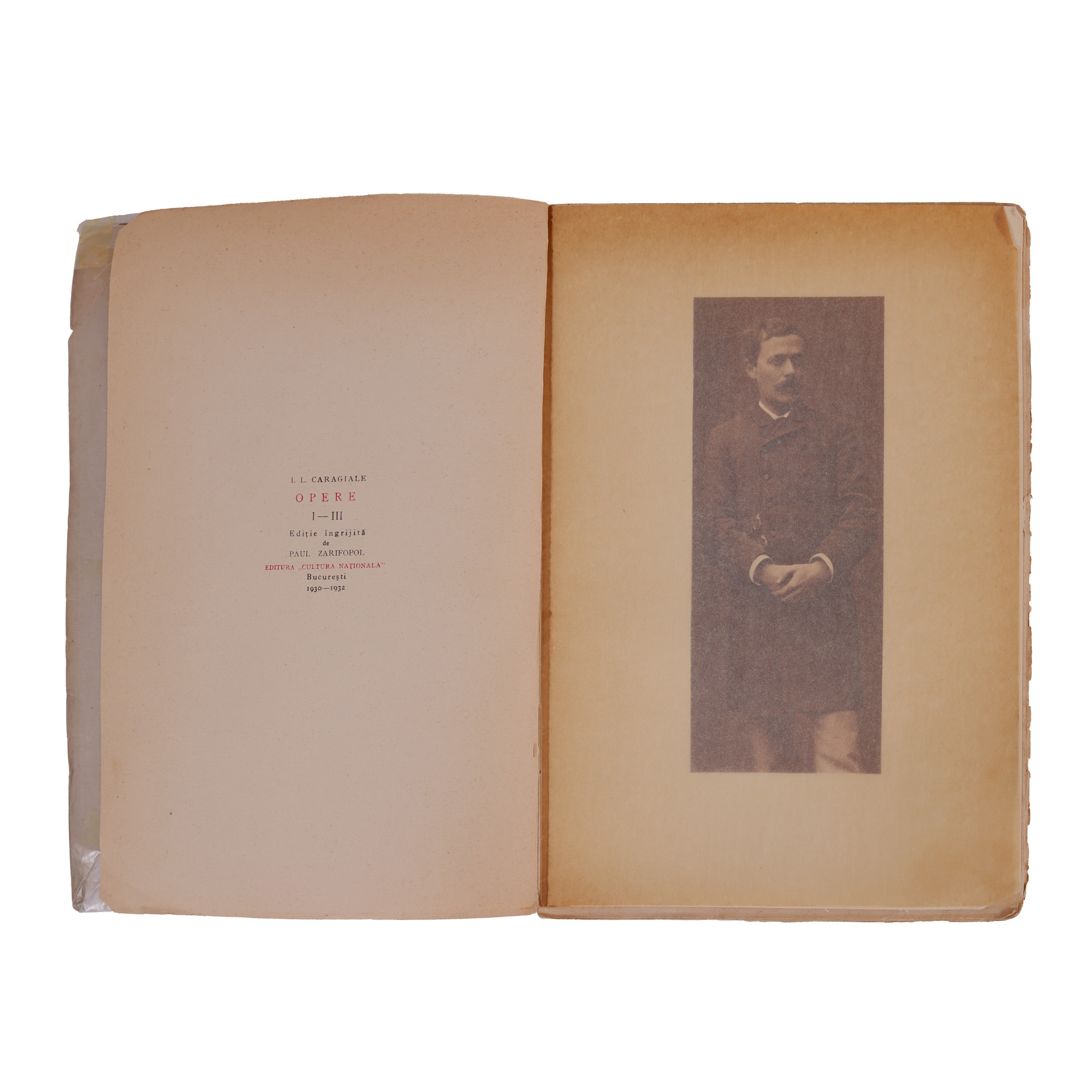 21. Lot format din ”Opere”, de Ion Luca Caragiale, șapte volume, ediție îngrijită de Paul Zarifopol și Șerban Cioculescu, București, 1930-1942, exemplare bibliofile, plus invitație la sărbătorirea centenarului nașterii lui Ion Luca Caragiale, București, 1952, plus fluturaș publicitar al Fundației Pentru Literatură Și Artă Regele ”Carol II”, provin din colecția scriitorului Pericle Martinescu