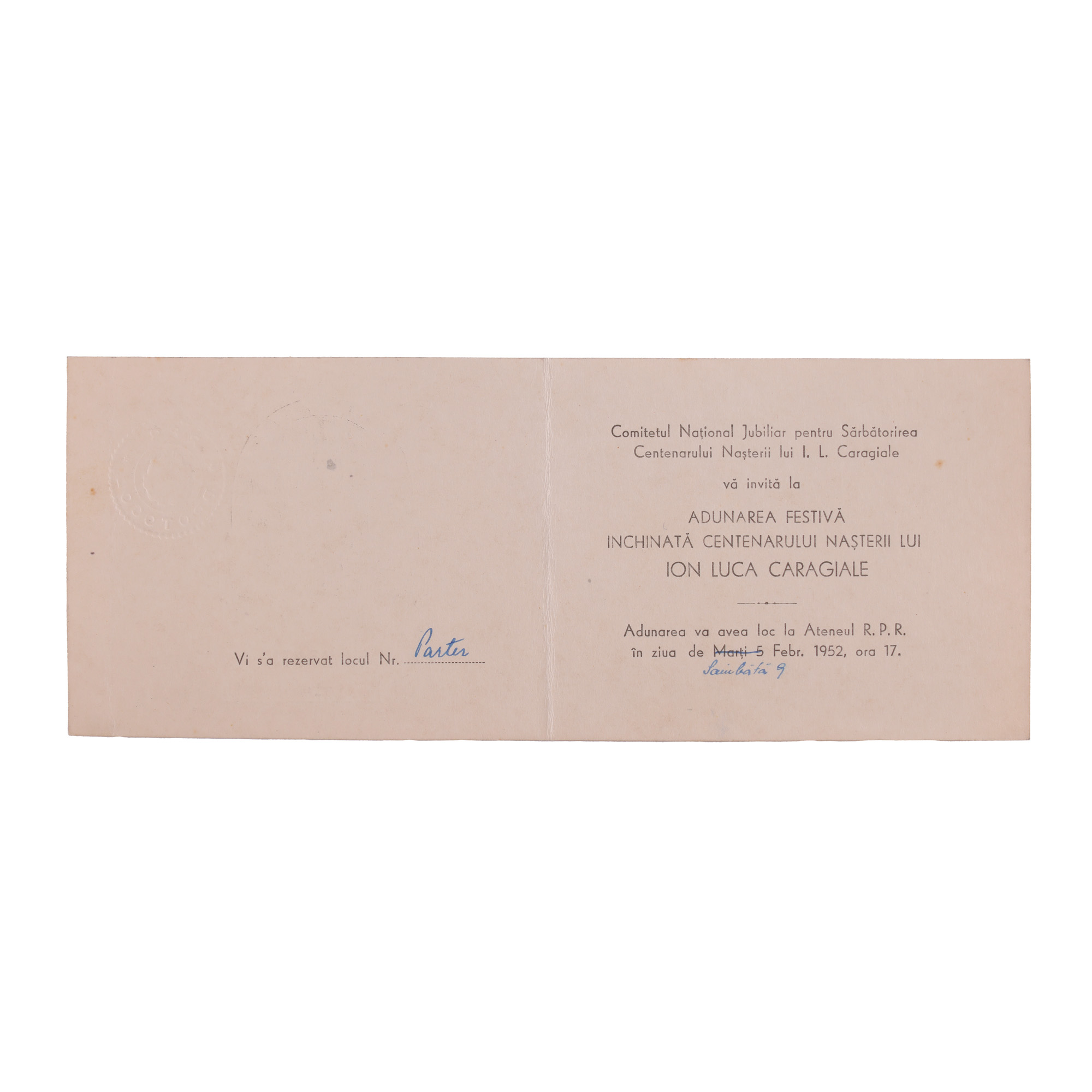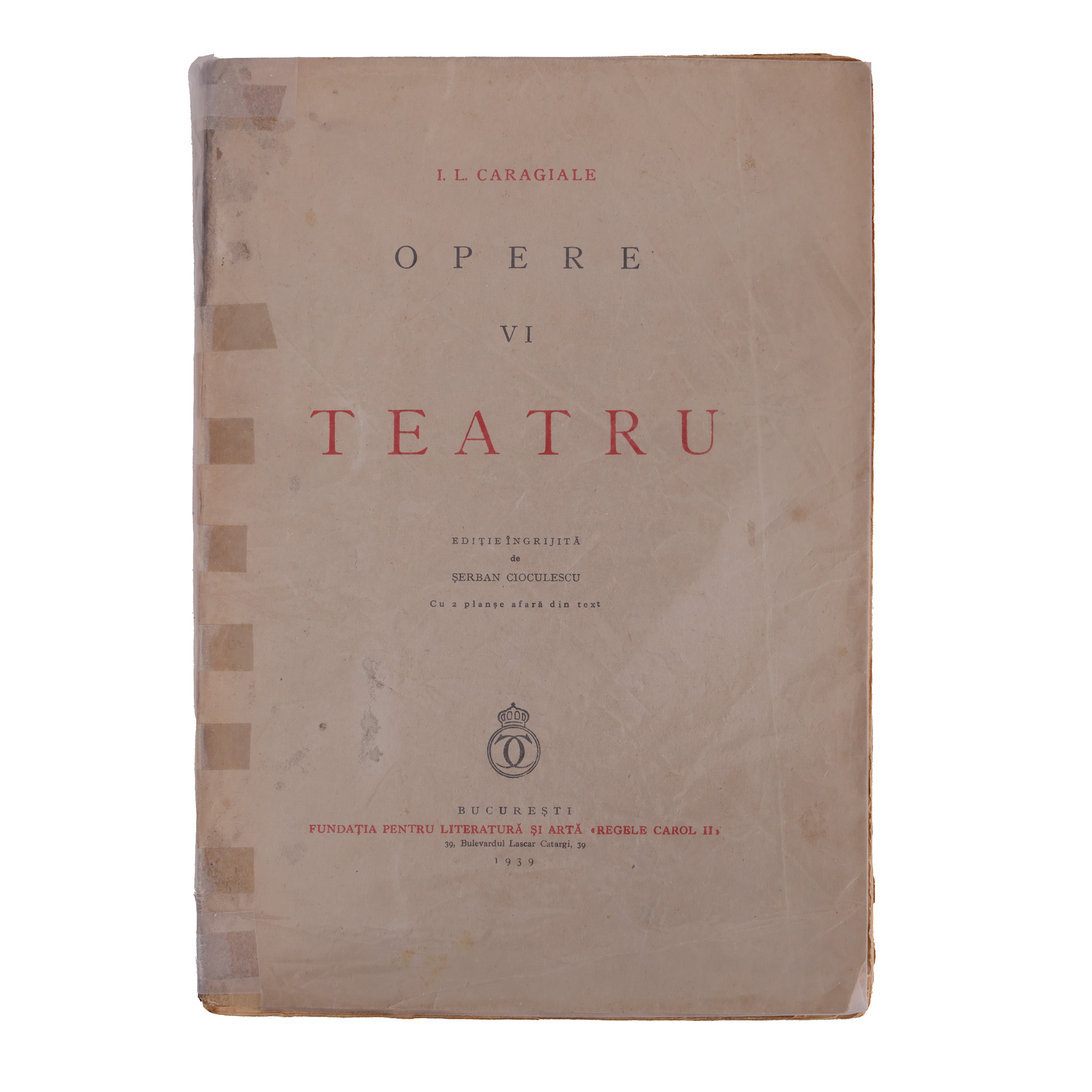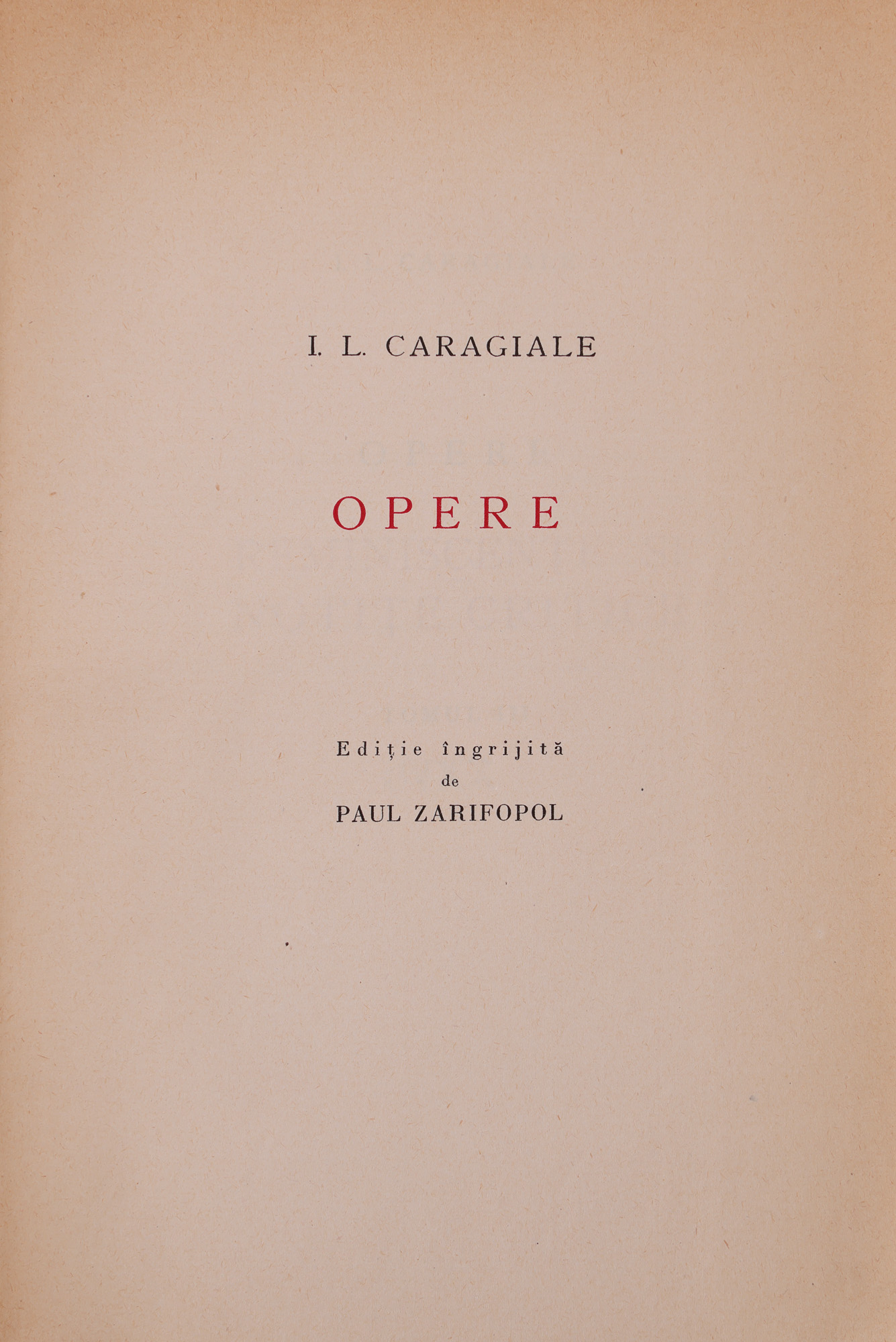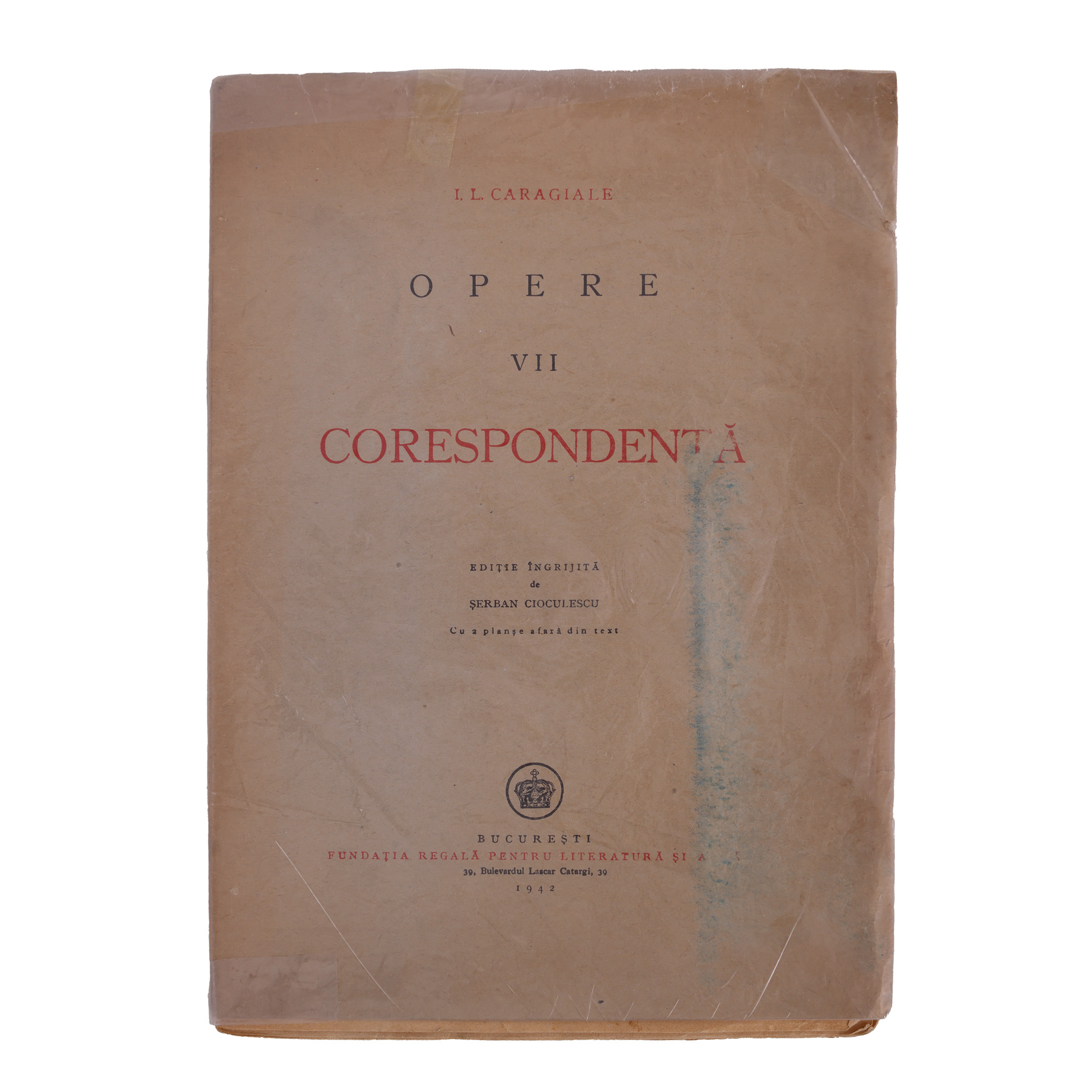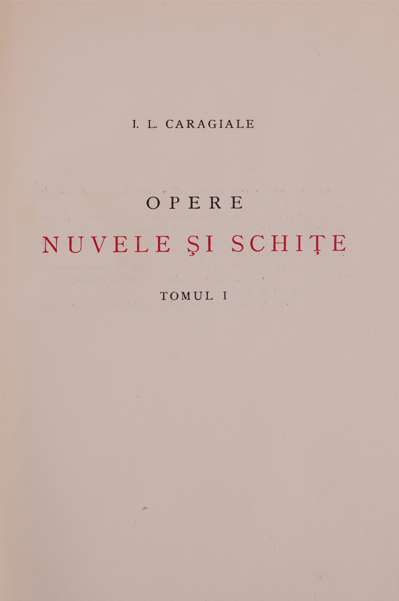 21. Lot format din ”Opere”, de Ion Luca Caragiale, șapte volume, ediție îngrijită de Paul Zarifopol și Șerban Cioculescu, București, 1930-1942, exemplare bibliofile, plus invitație la sărbătorirea centenarului nașterii lui Ion Luca Caragiale, București, 1952, plus fluturaș publicitar al Fundației Pentru Literatură Și Artă Regele ”Carol II”, provin din colecția scriitorului Pericle Martinescu