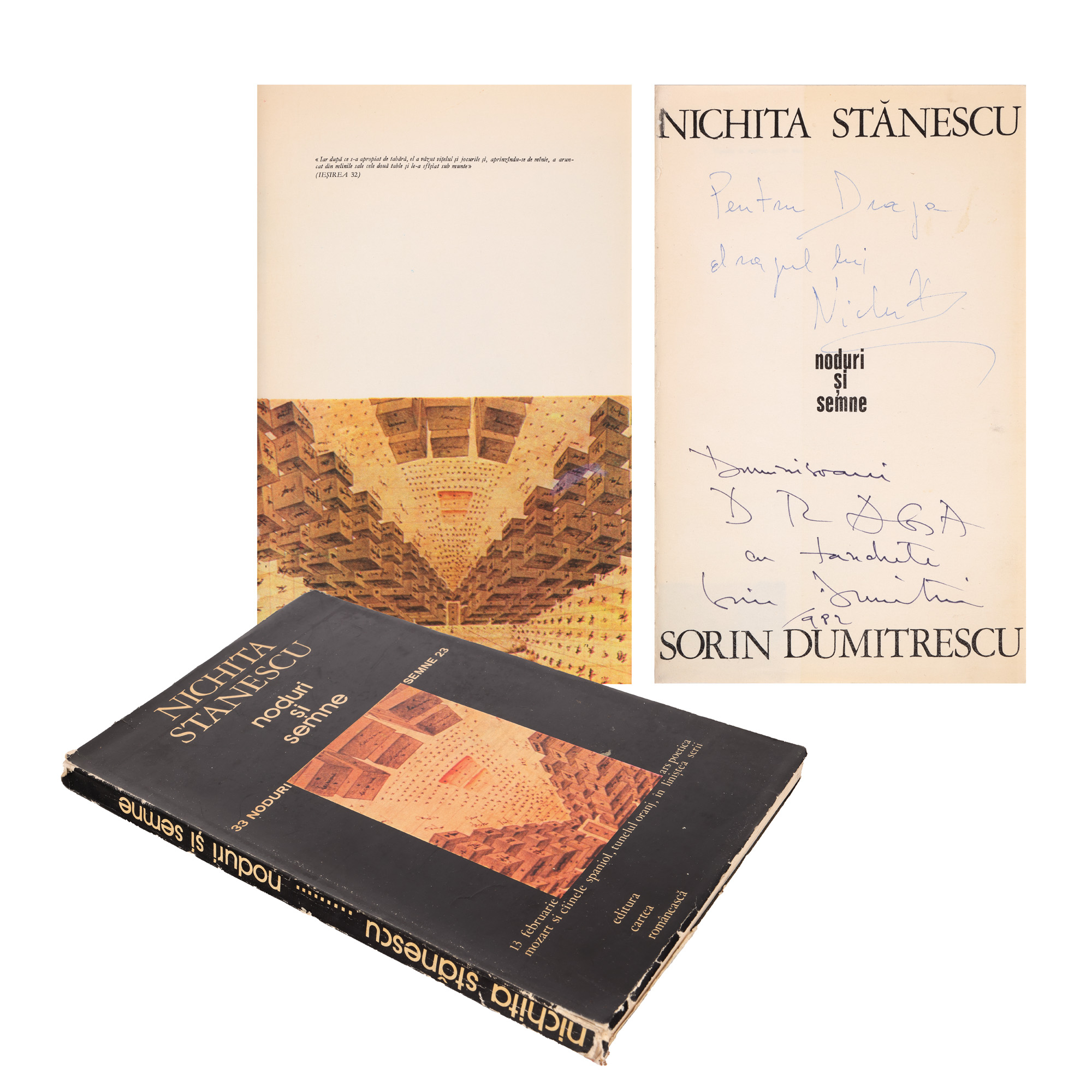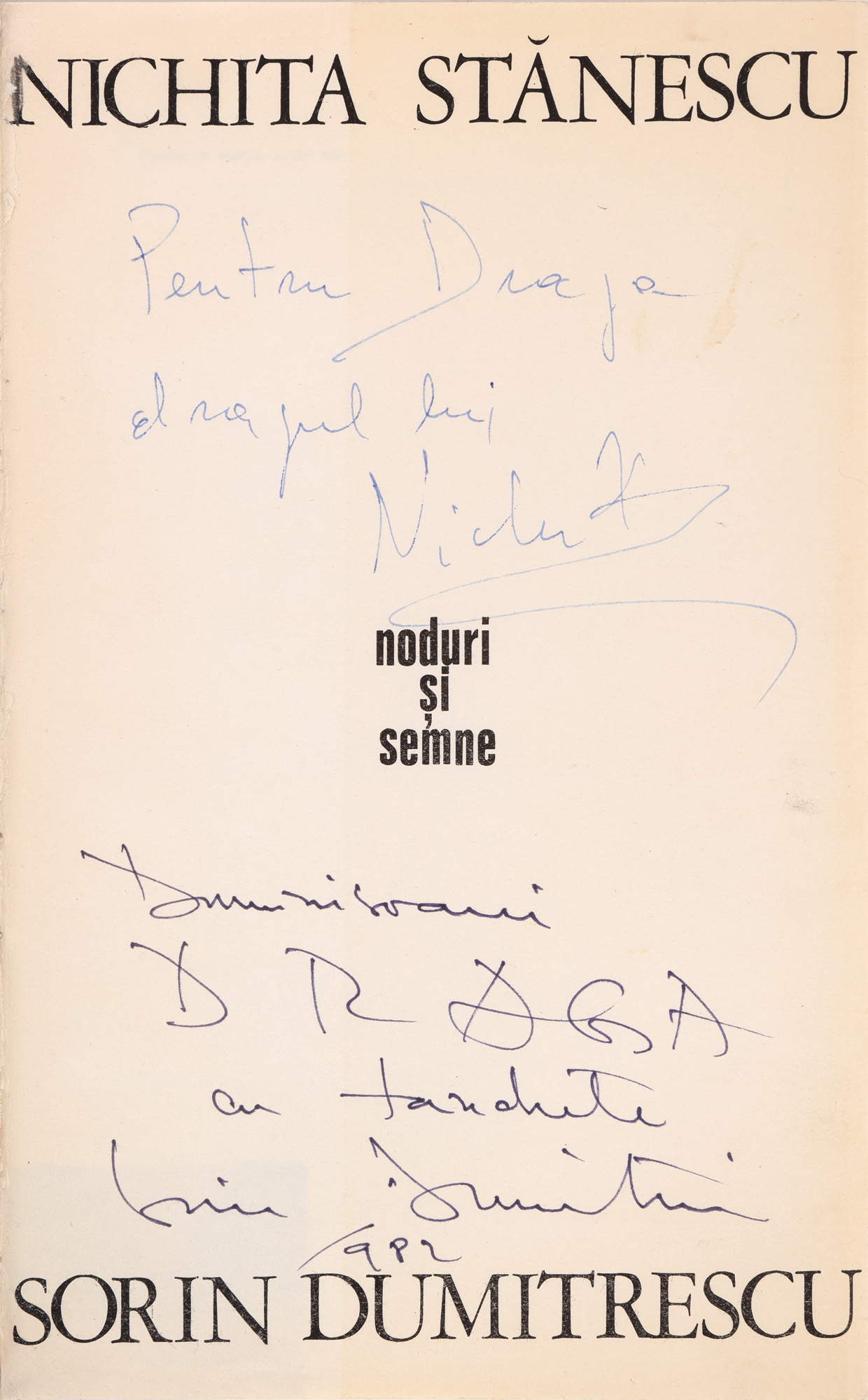 54. ”Noduri și semne”, de Nichita Stănescu și Sorin Dumitrescu, București, 1982, cu două dedicații și semnăturile olografe ale lui Stănescu și Dumitrescu