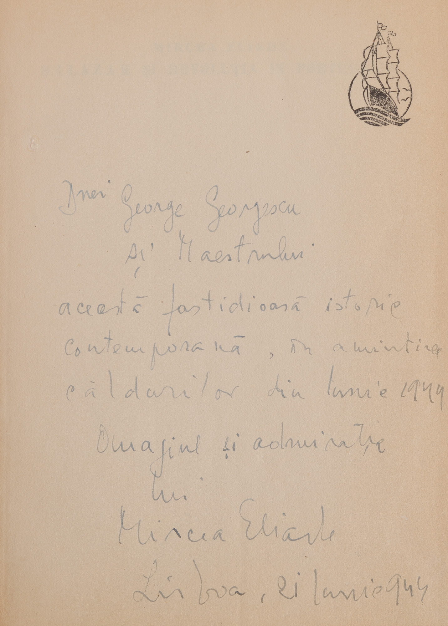 5IC. ”Salazar și revoluția în Portugalia”, de Mircea Eliade, ediție princeps, București, 1942, cu semnătura și dedicația autorului către marele dirijor român George Georgescu, exemplar cu legătură bibliofilă