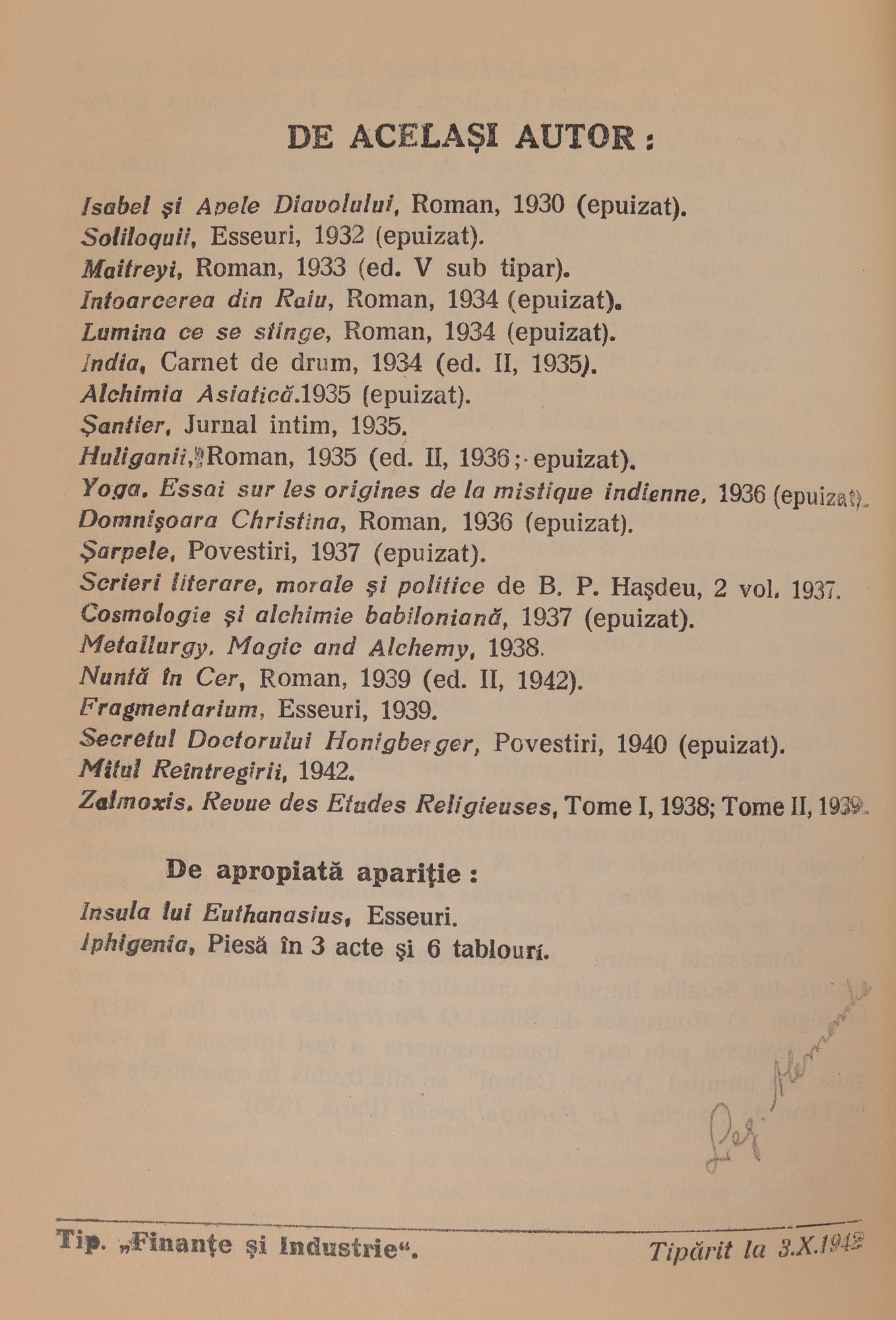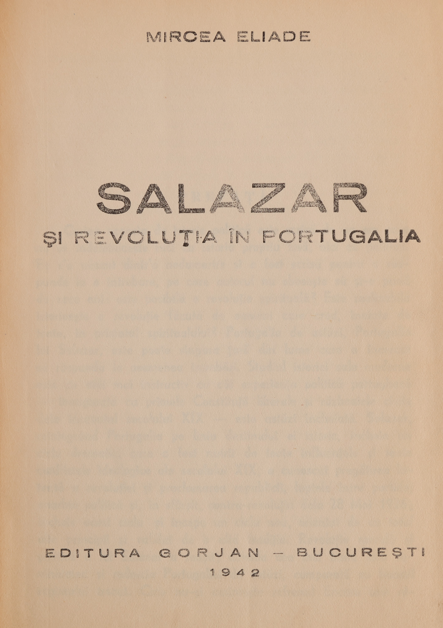 Între 1941 și 1945 Mircea Eliade a lucrat ca secretar diplomatic responsabil cu presa și partea culturală în cadrul reprezentanței diplomatice a României în Portugalia. Lucrarea reprezintă tratarea plină de admirație a lui față de regimul fascist al dictatorului portughez Antonio Salazar, publicată la București în 1942. Exemplarul se remarcă printr-o legătură bibliofilă, cu o elegantă legătură din piele și șnitul aurit. Exemplarul cuprinde o dedicație olografă, semnată în 1944 a autorului față de dirijorul George Georgescu și soția acestuia.