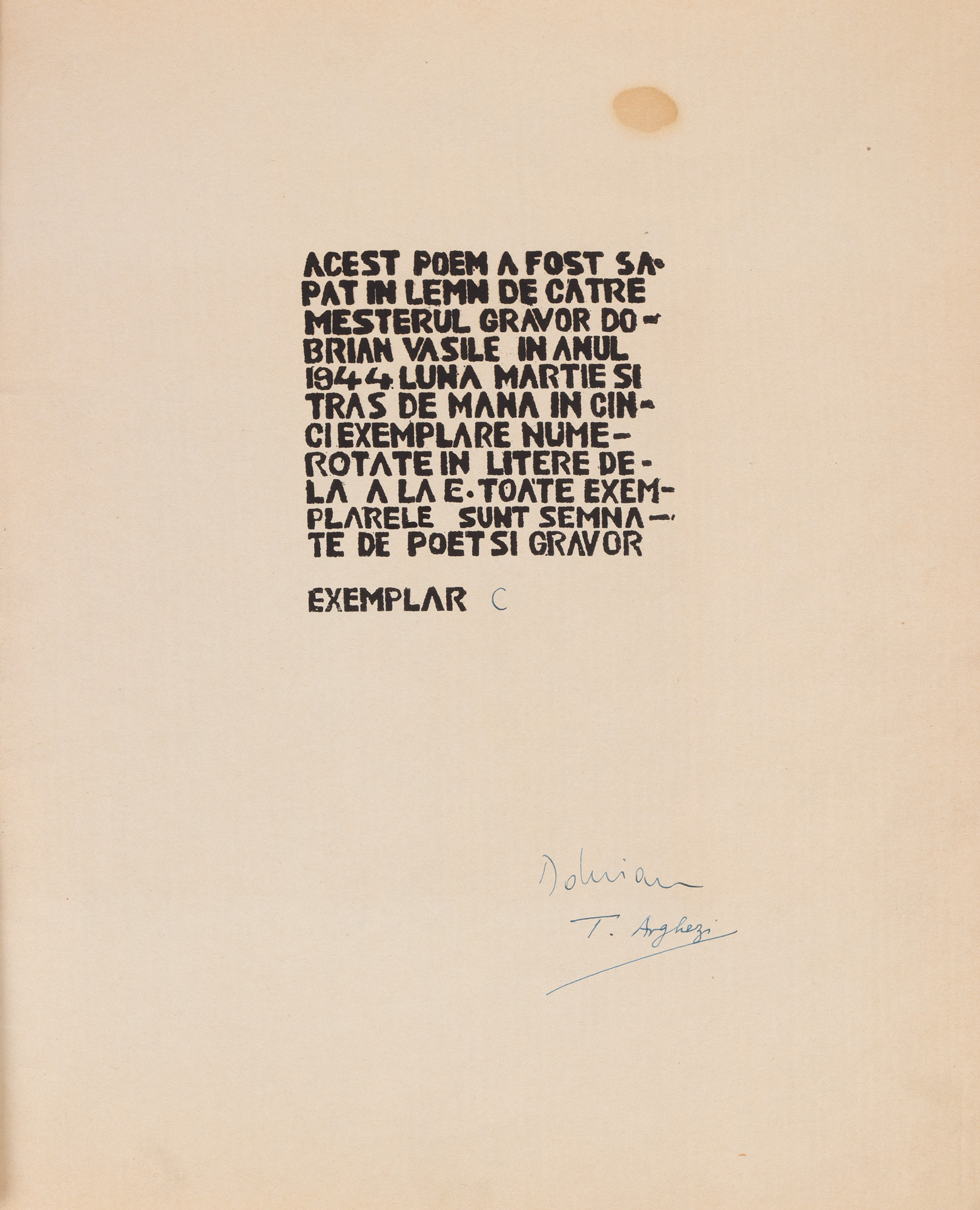 14. ”Transfigurare”, de Tudor Arghezi, București, 1944, exemplarul al treilea din cinci, numerotat ”C”, cu semnăturile olografe ale poetului Tudor Arghezi și gravorului Vasile Dobrian, piesă de colecție