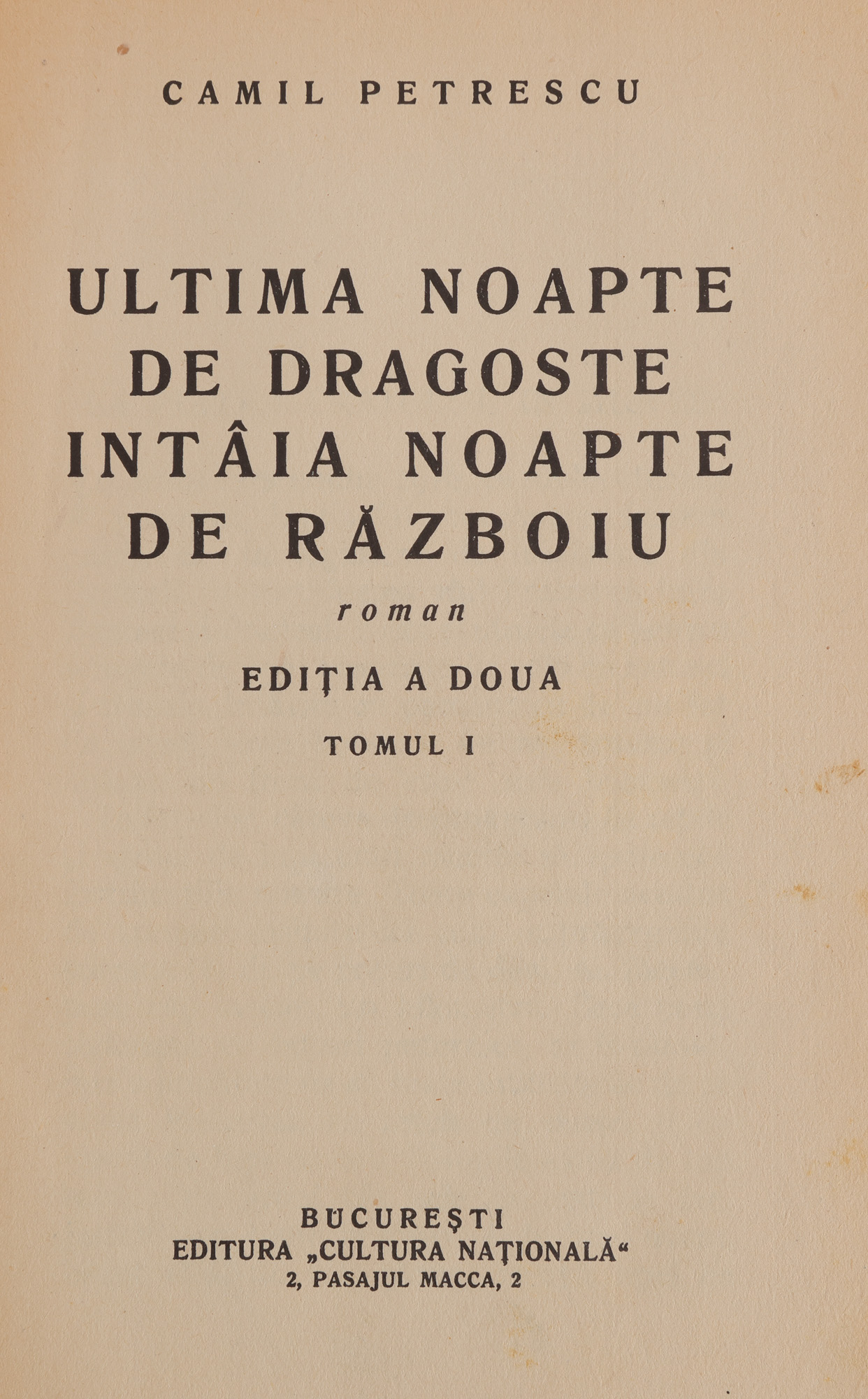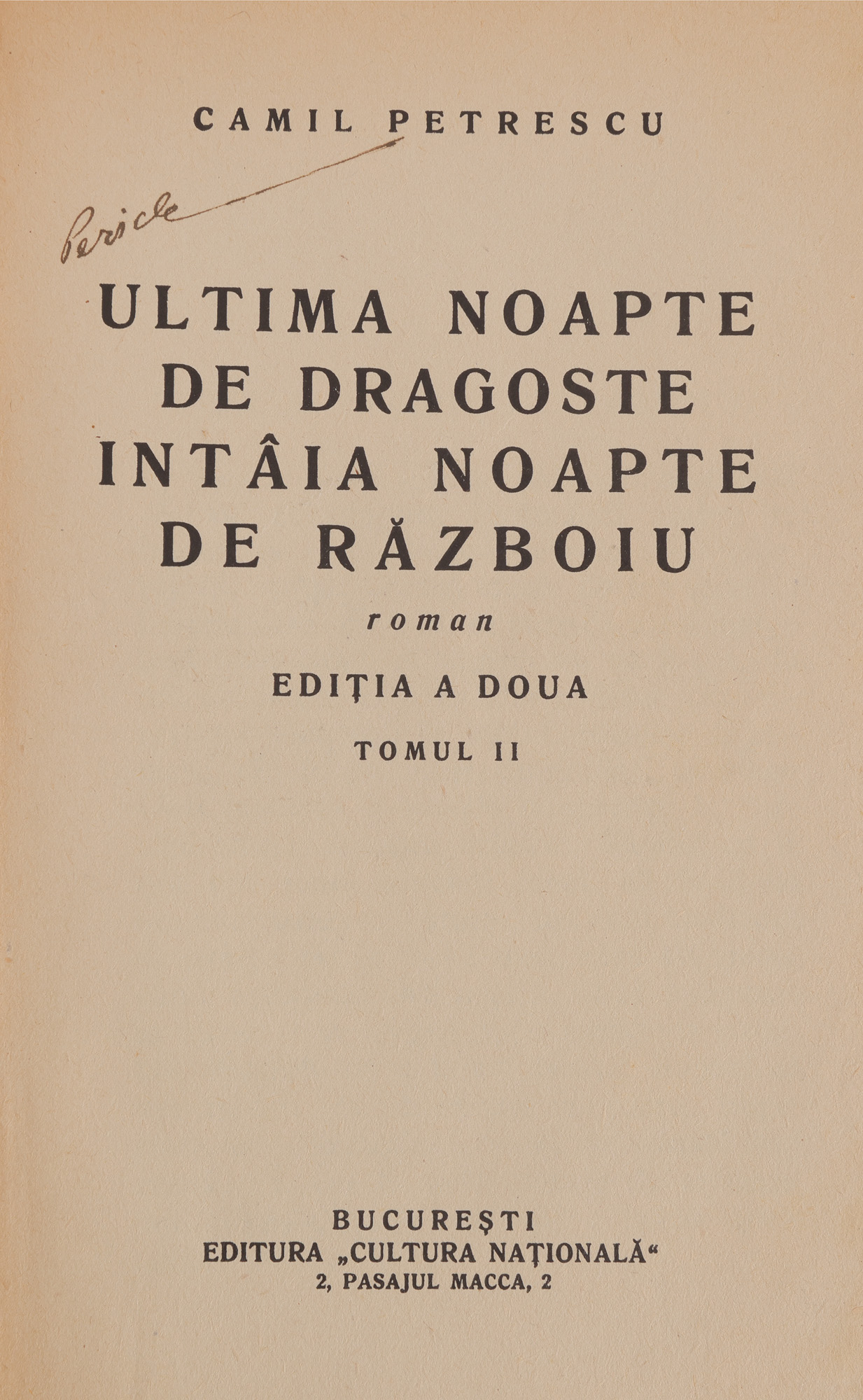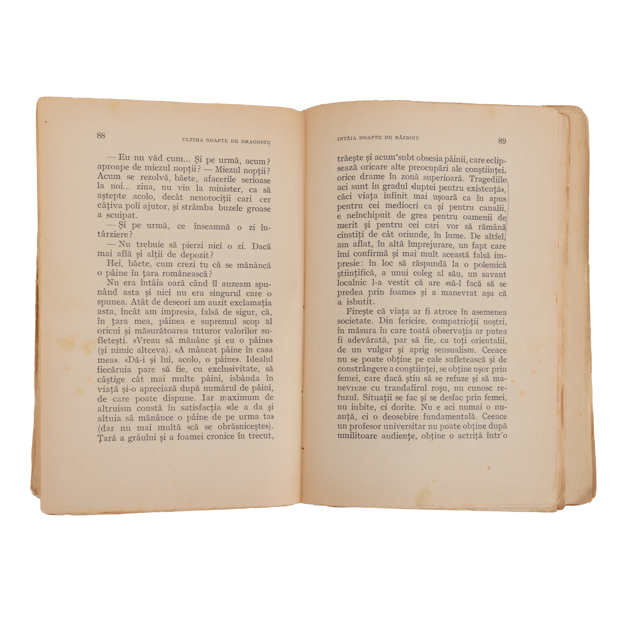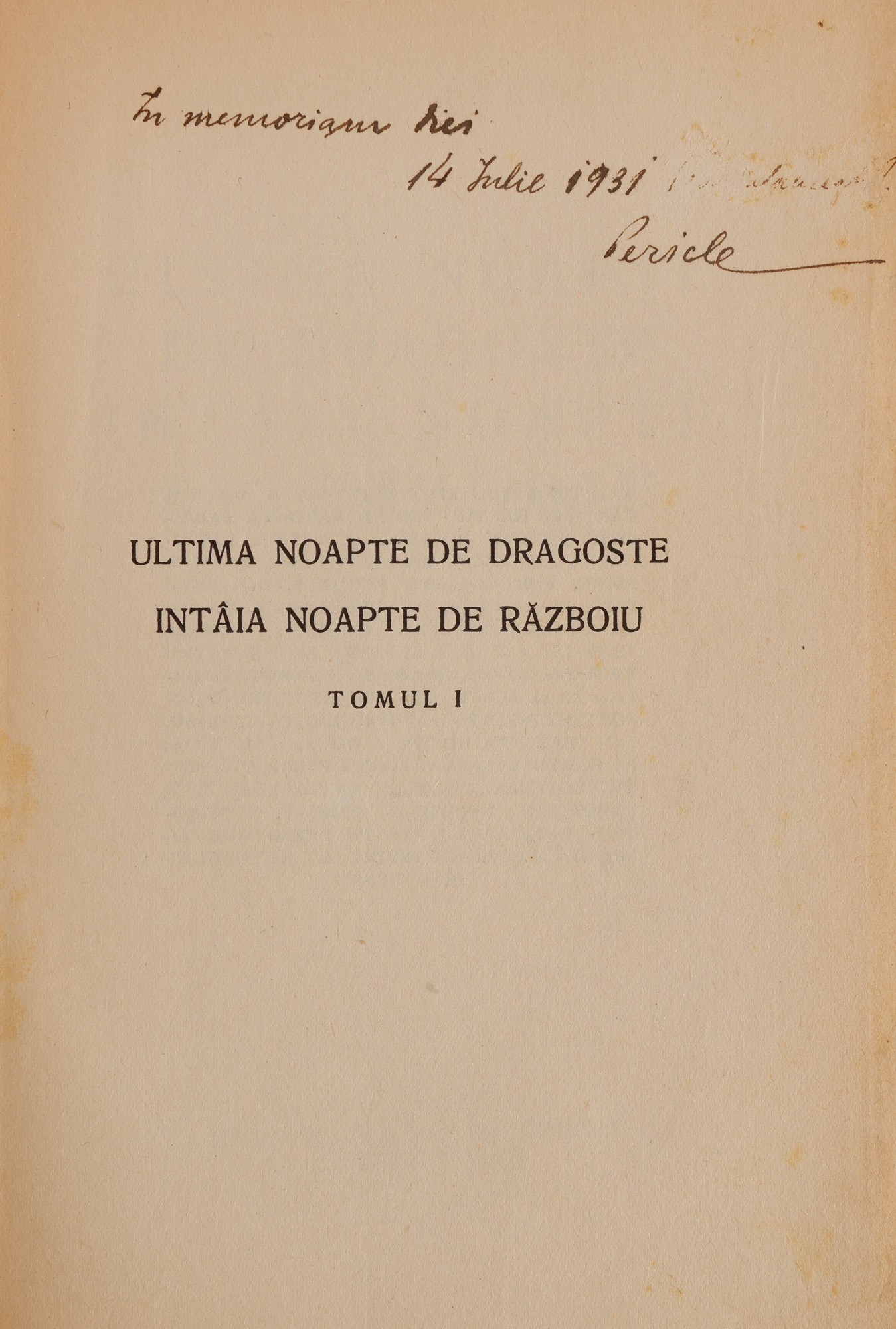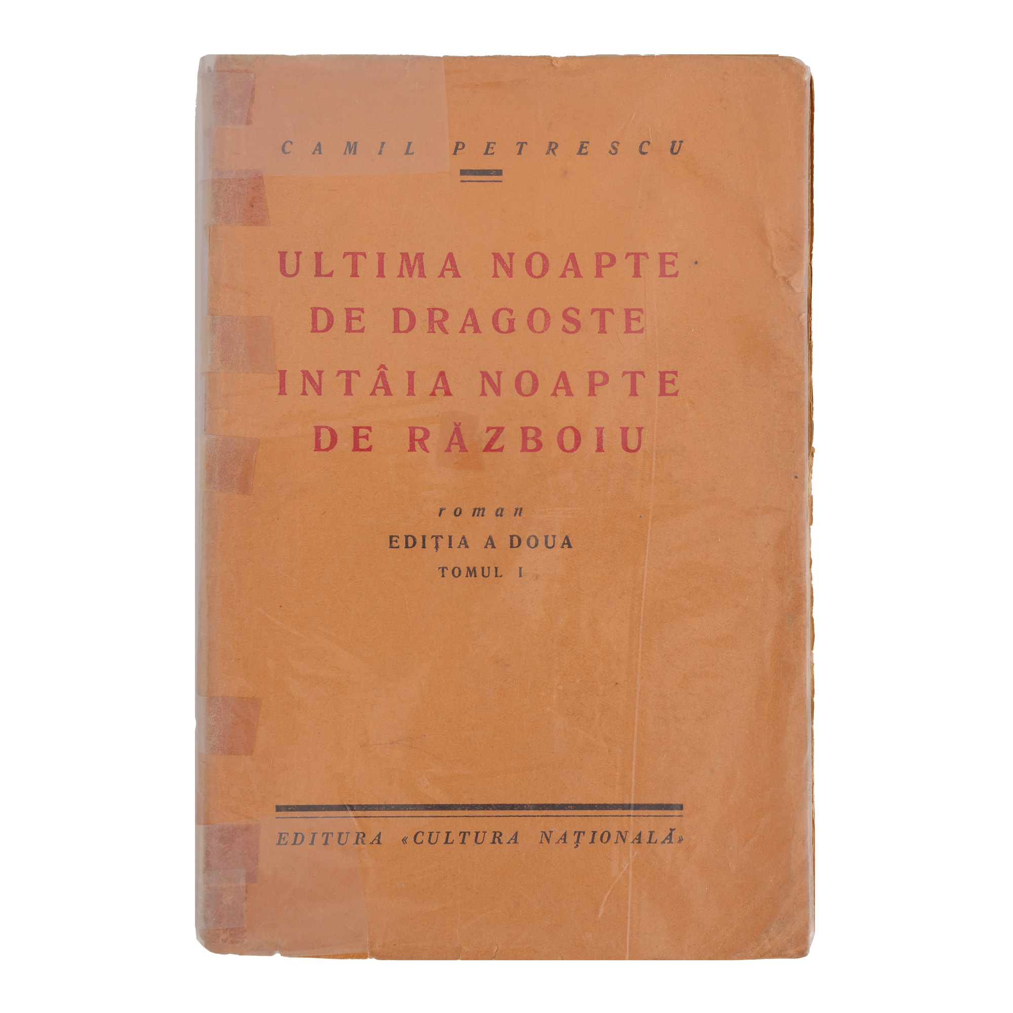 44. ”Ultima noapte de dragoste, întâia noapte de război”, de Camil Petrescu, două volume, București, 1931, cu ex-librisul scriitorului Pericle Martinescu, din a cărui colecție provine