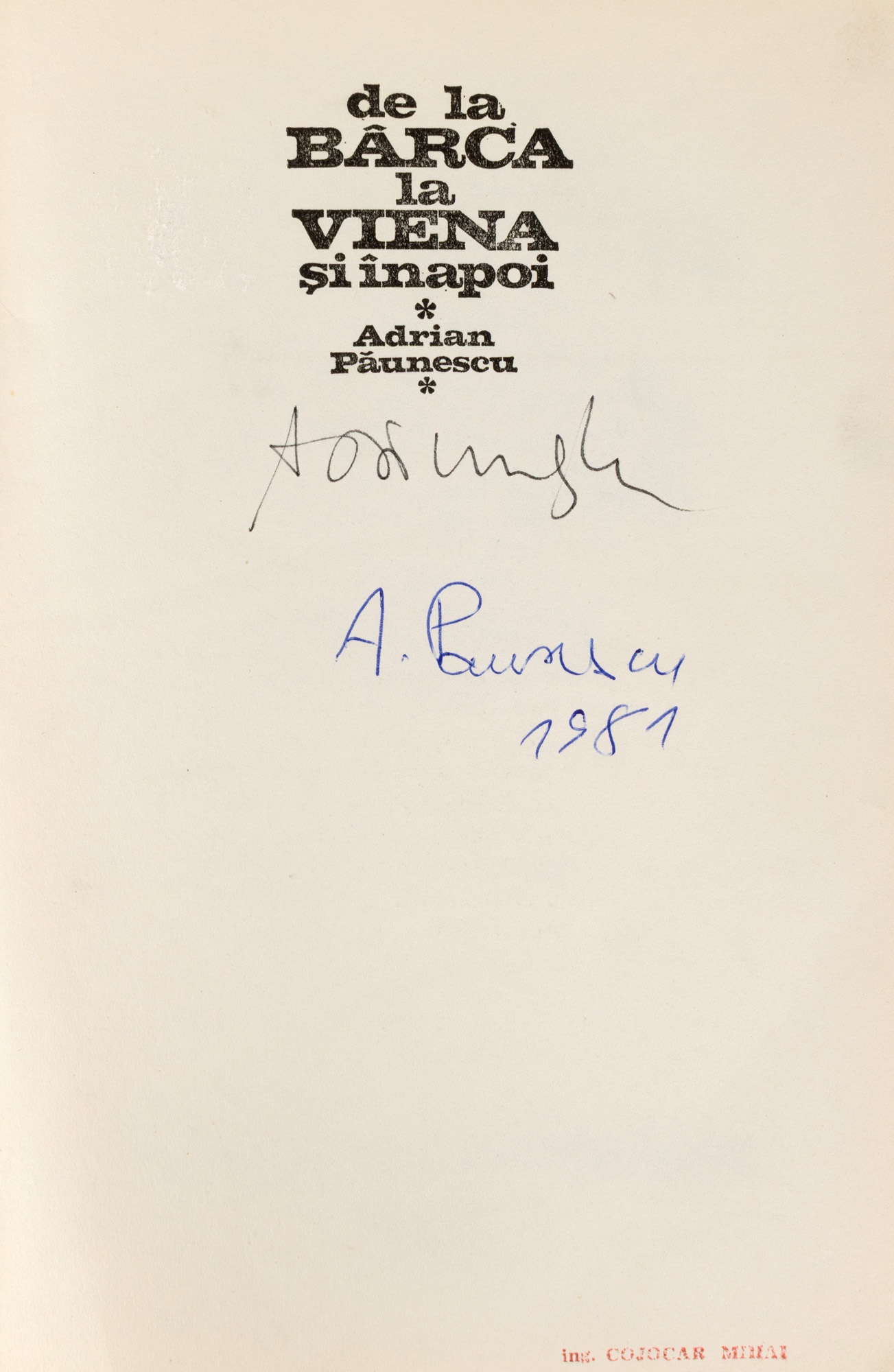 10. ”De la Bârca la Viena și înapoi”, de Adrian Păunescu, București, 1981, cu semnătura olografă a autorului