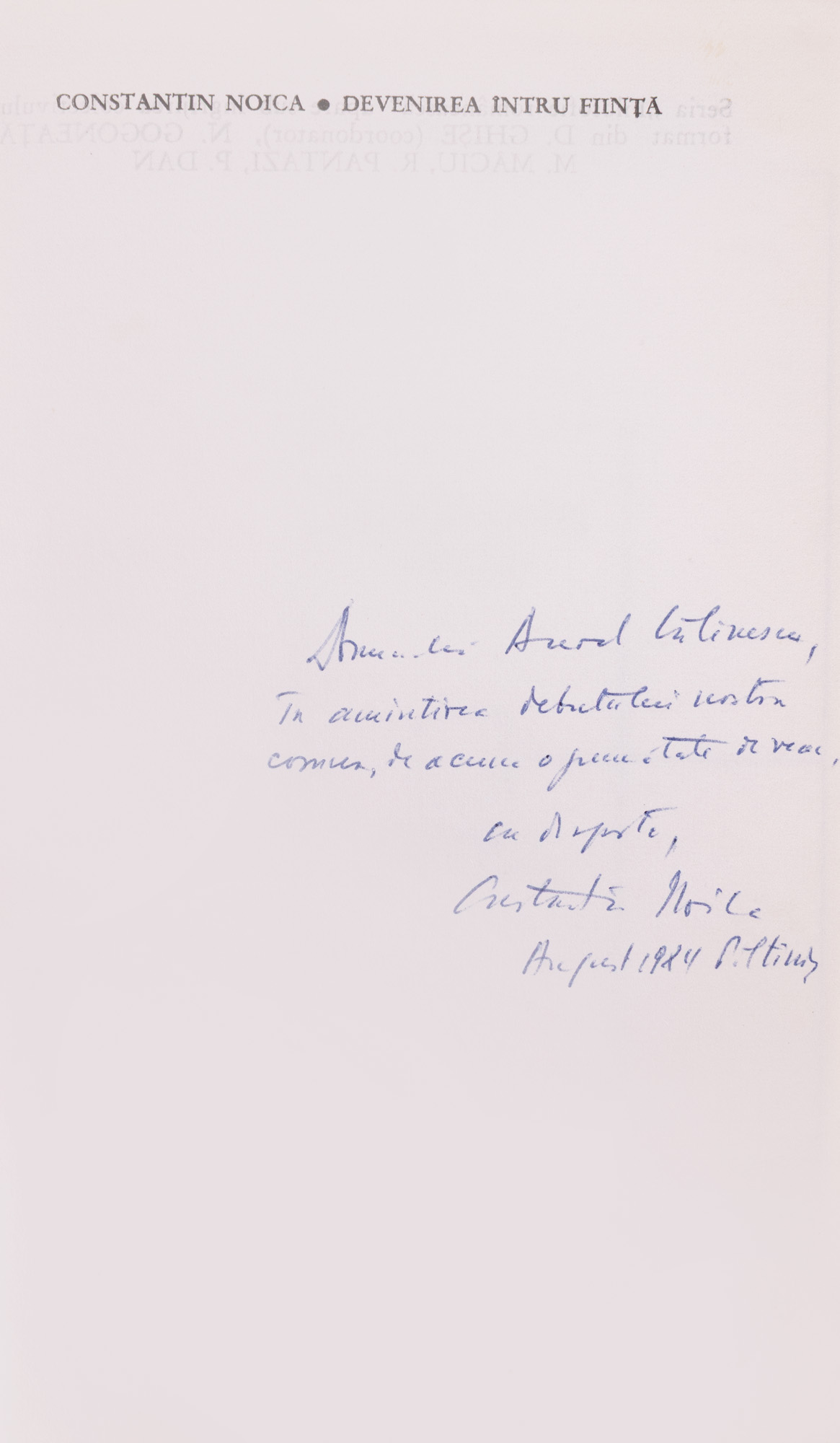 7. ”Devenirea întru ființă”, de Constantin Noica, București, 1981, cu semnătura și dedicația olografă a autorului