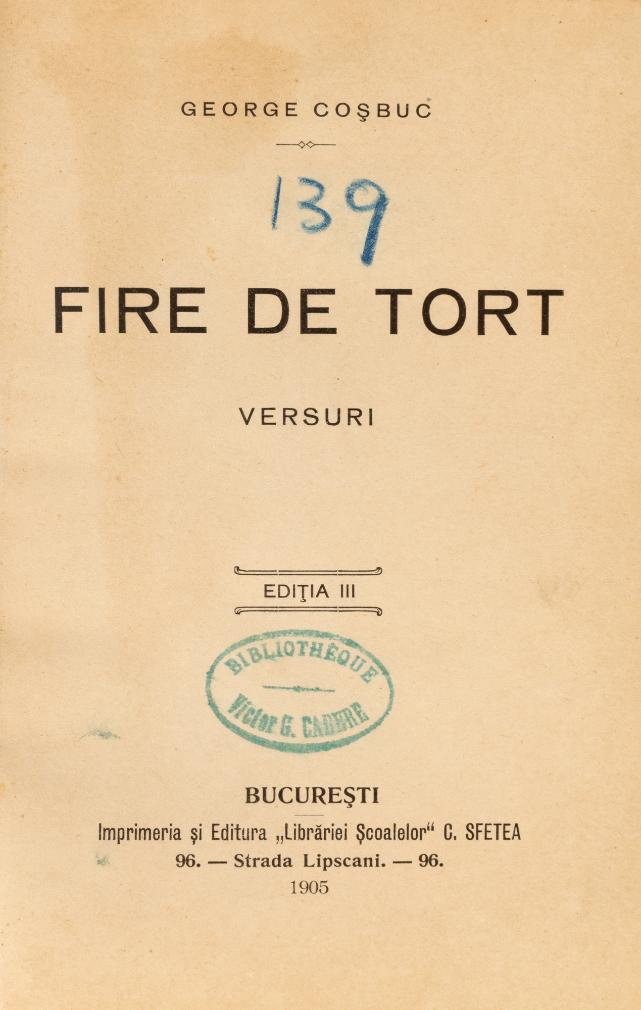 49. ”Fire de tort”, de George Coșbuc, București, 1905, cu un ex-libris al diplomatului Victor Cădere