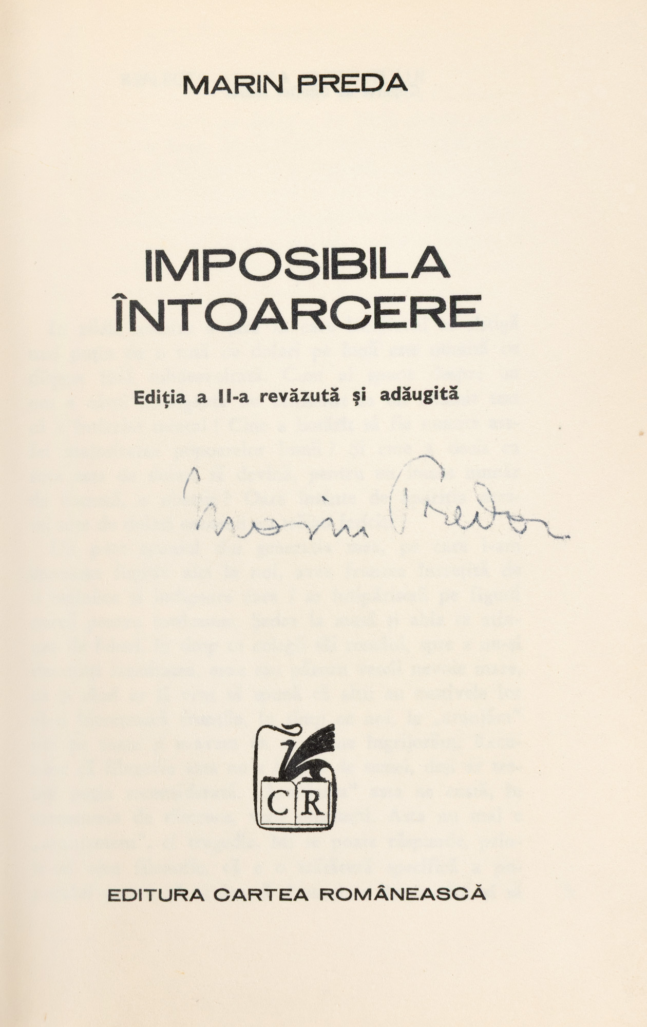5. ”Imposibila întoarcere”, de Marin Preda, București, 1971, ediție princeps, cu semnătura olografă a autorului