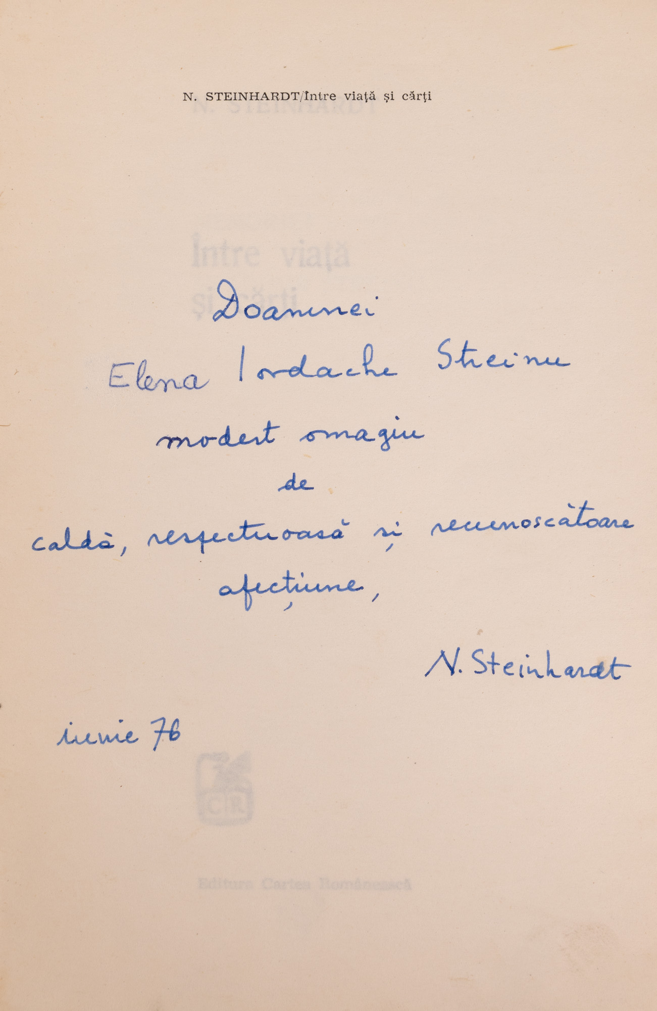 3. ”Între viață și cărți”, de Nicolae Steinhardt, București, 1976, cu dedicație și semnătura olografe ale autorului către scriitoarea Elena Iordache Streinu