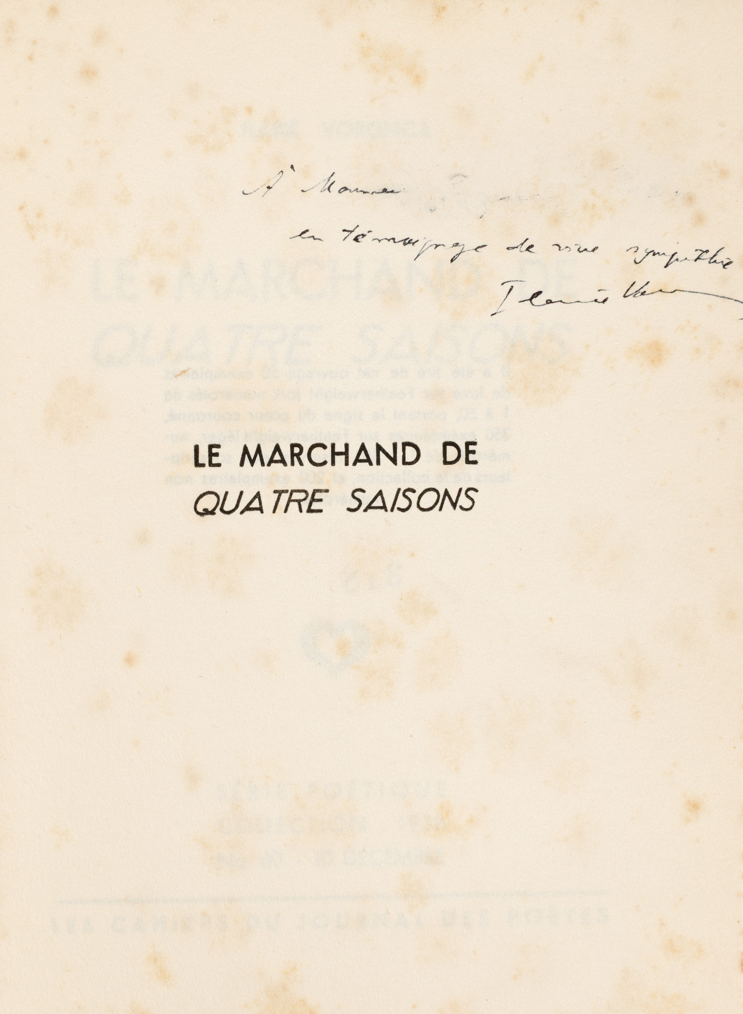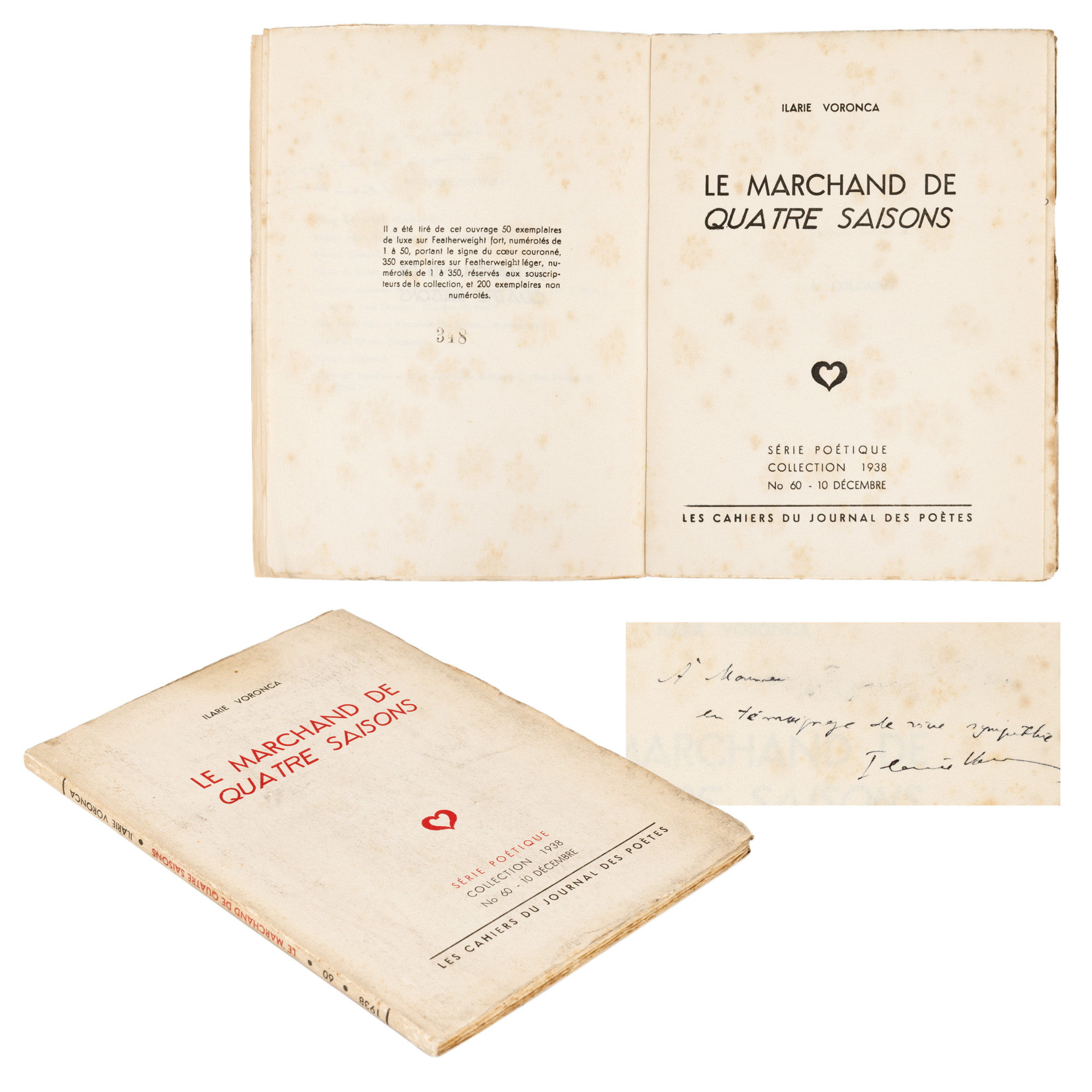 60. ”Le Marchand de Quatre Saisons”, de Ilarie Voronca, franceză, 1938, ediție princeps, exemplar netăiat, cu dedicația și semnătura olografă ale autorului