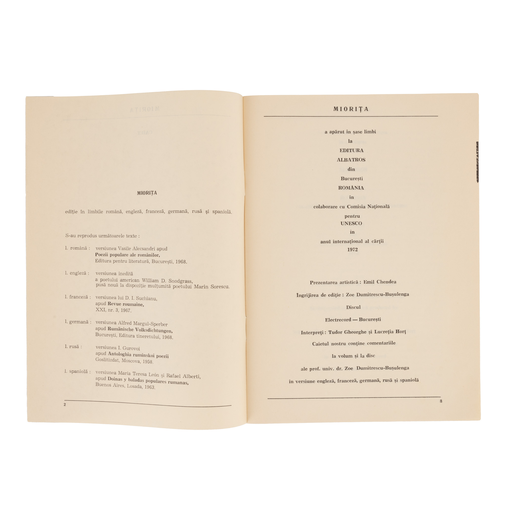 47. ”Miorița”, ediție bibliofilă și multilingvă, română, engleză, franceză, rusă și spaniolă, 1972, cu etui, vinil și ex-libris