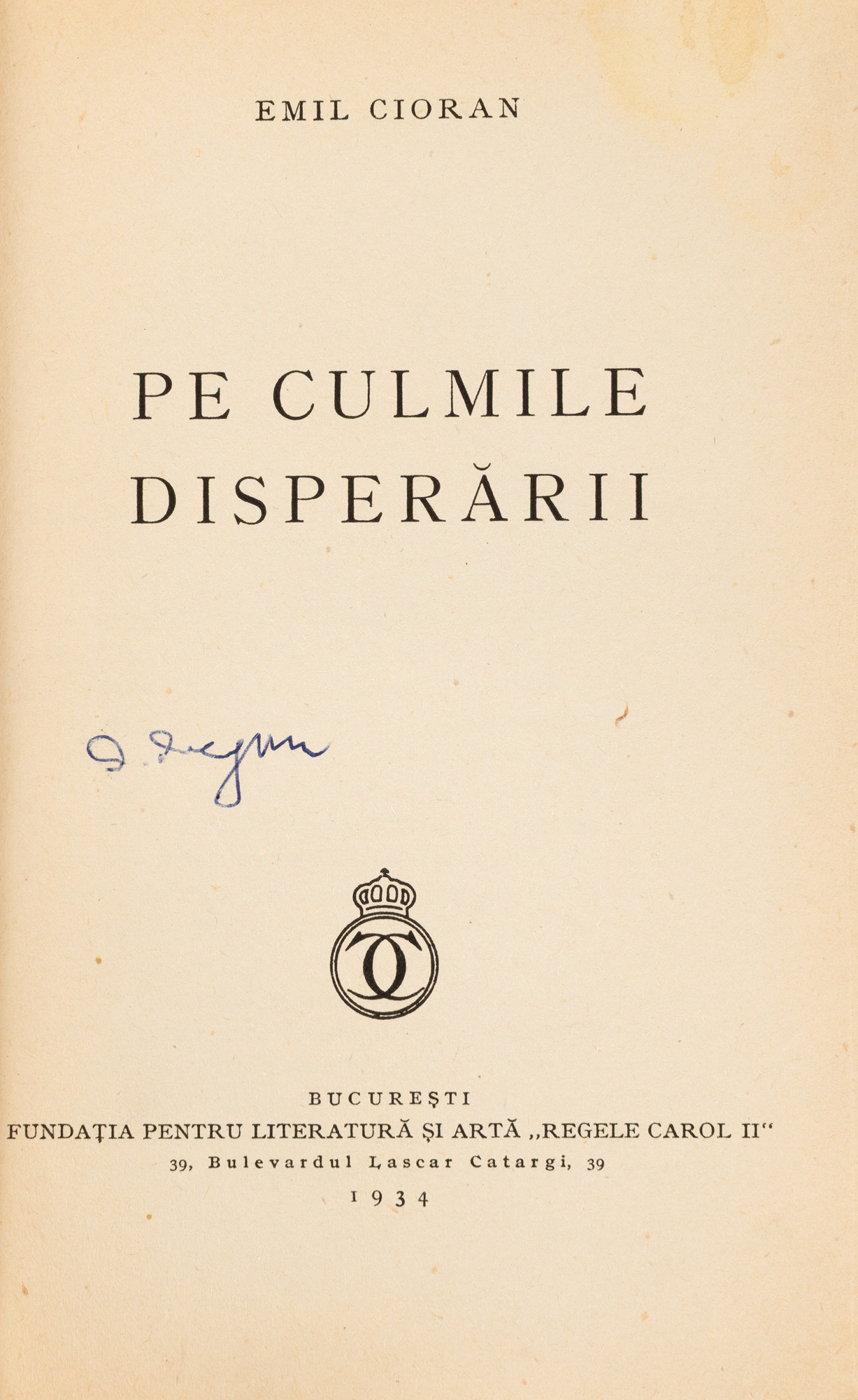 19. ”Pe culmile disperării”, de Emil Cioran, București, 1934, ediție princeps