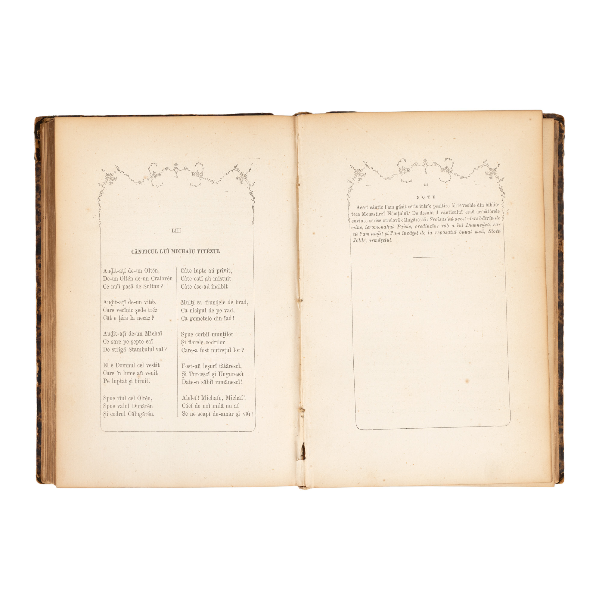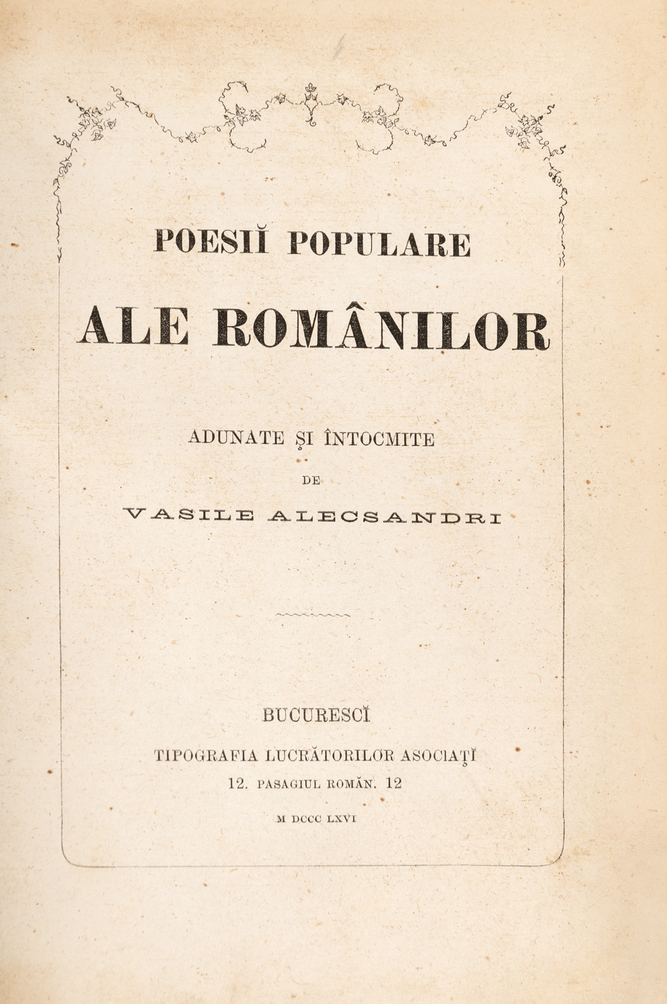 Vasile Alecsandri (1821-1890) publica prima ediție a acestei lucrări în 1866, ca ultimă parte dintr-o serie începută în 1852, dedicată punerii în valoare a creației literare populare românești. Exemplarul nu cuprinde portretul în heliogravură al autorului. Pe interiorul copertei principale se află o dedicație olografă din 1872 a generalului Grigore P. Cantili (1839-1906), unul din comandanții trupelor române care au luptat în Războiul de Independență, către nepotul său George P. Filiti, viitor procuror general al României la sfârșitul secolului al XIX-lea.