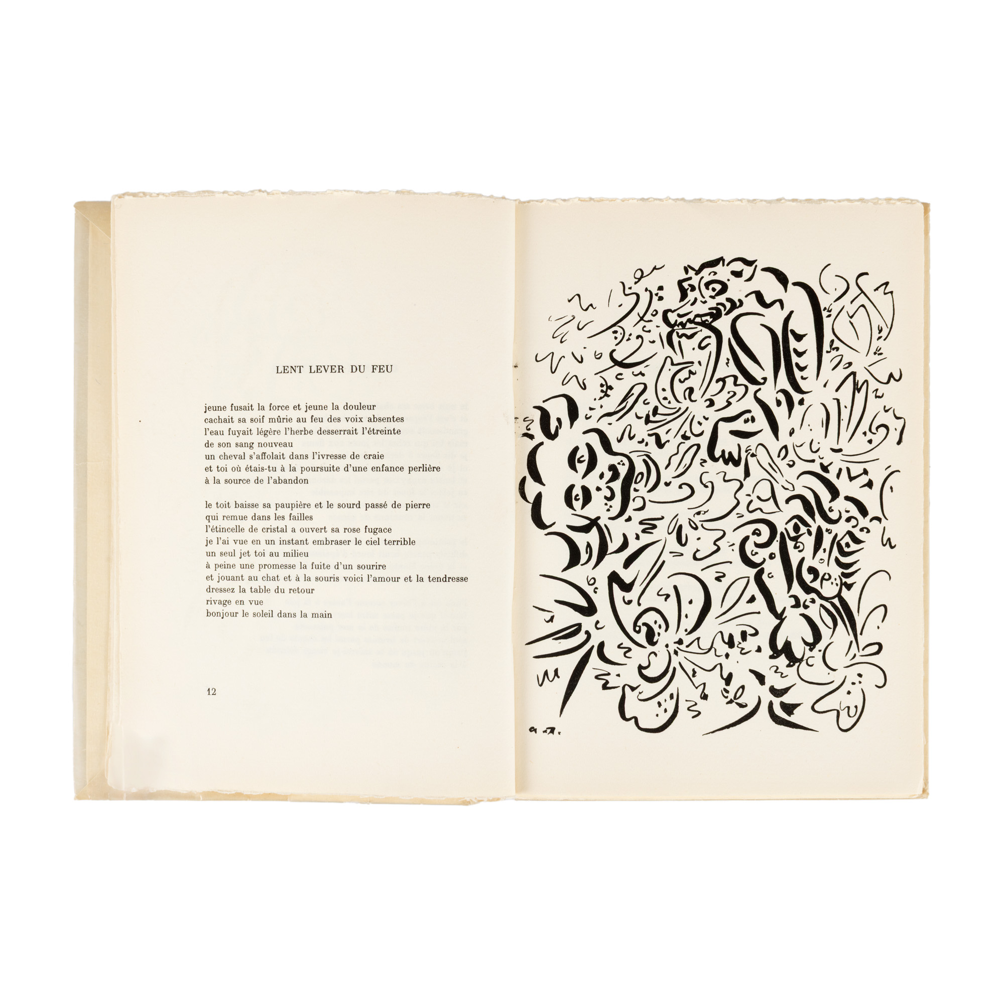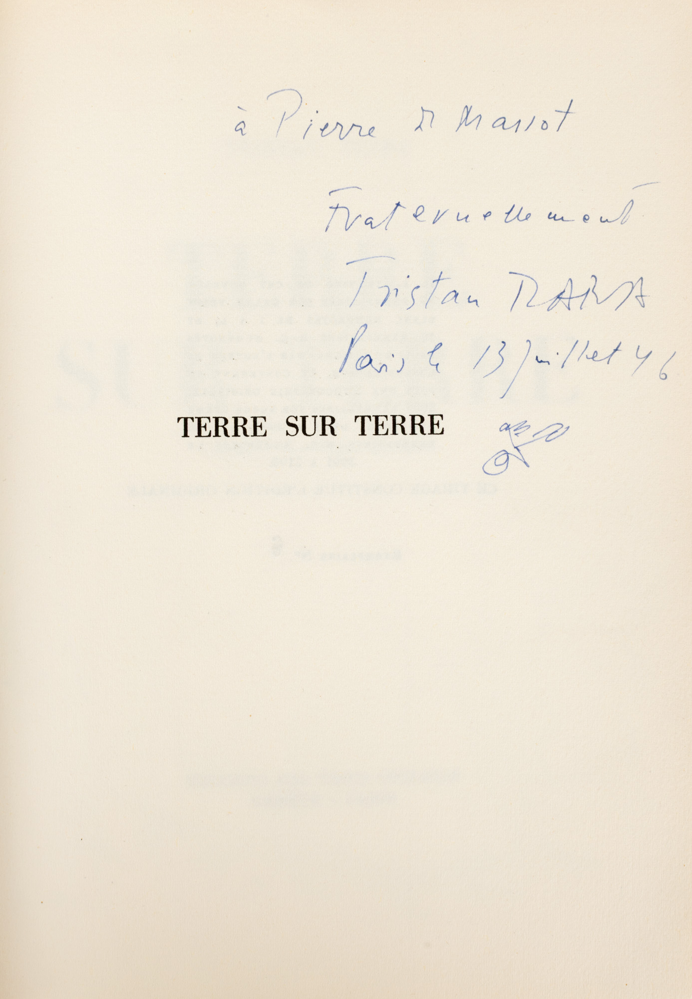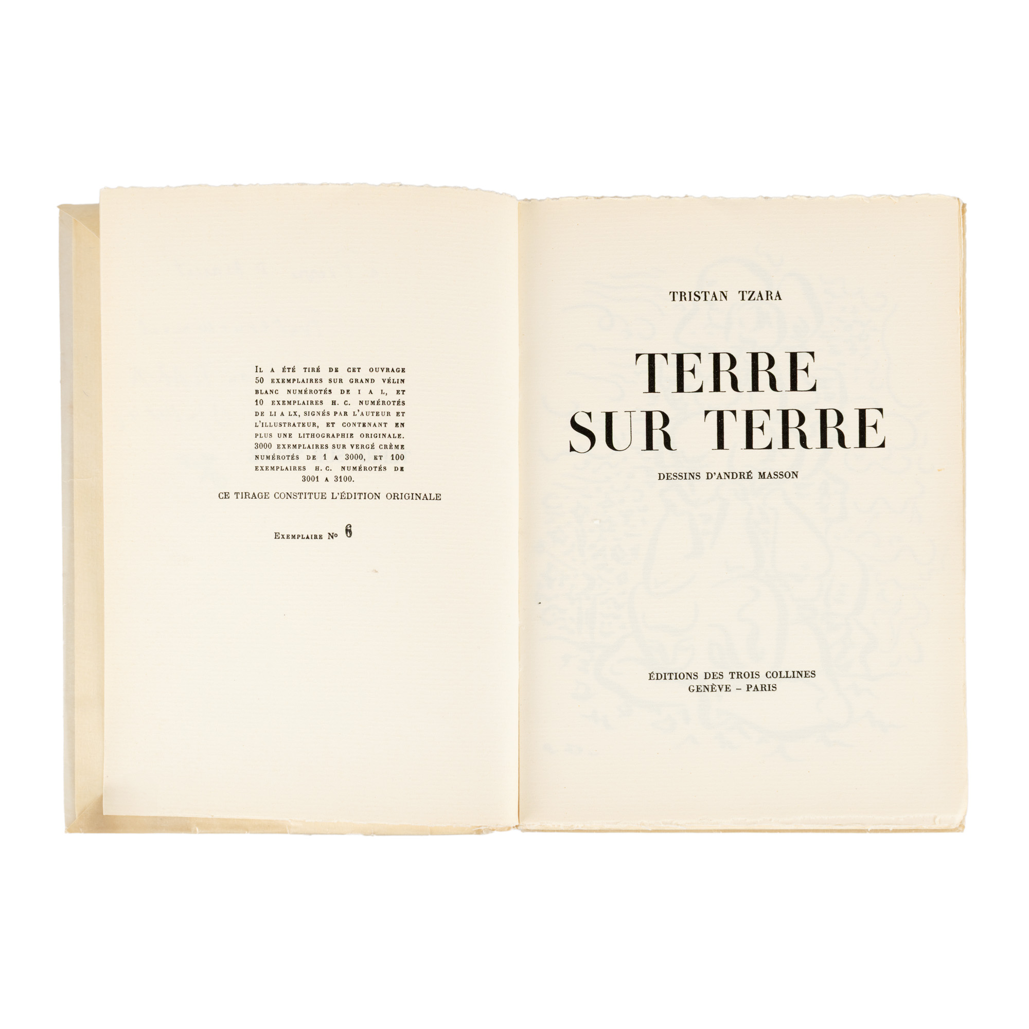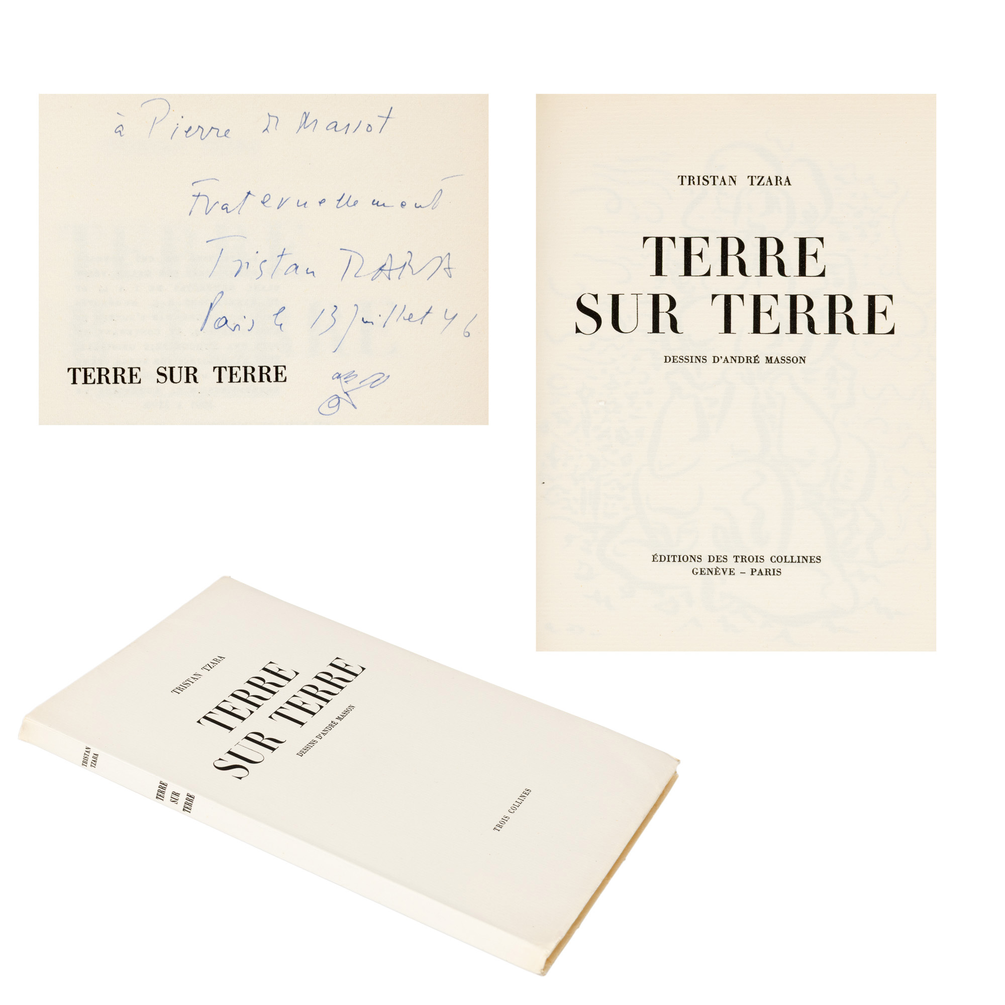 57. ”Terre sur terre”, de Tristan Tzara, franceză, Paris, 1946, exemplar 6/3000, cu desene de André Masson și dedicația cu semnătura olografă a autorului