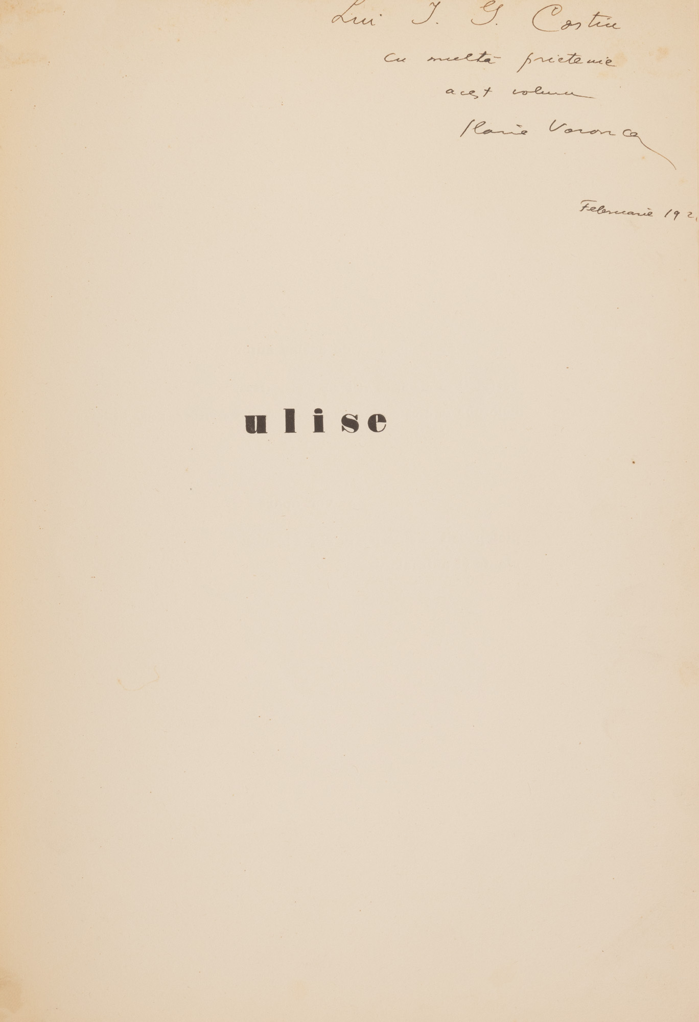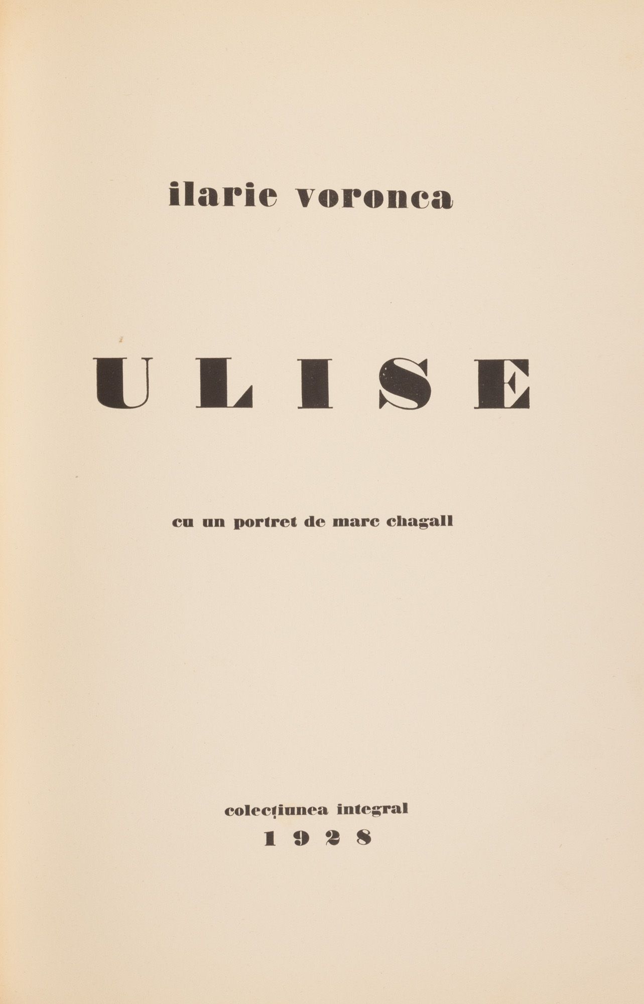 58. ”Ulise”, de Ilarie Voronca, cu un portret al autorului de Marc Chagall, 1928, exemplar 65/200, colecția Integral, cu dedicația și semnătura olografe ale autorului, , provine din colecția criticului literar și editorului Magdalena Popescu-Bedrosian