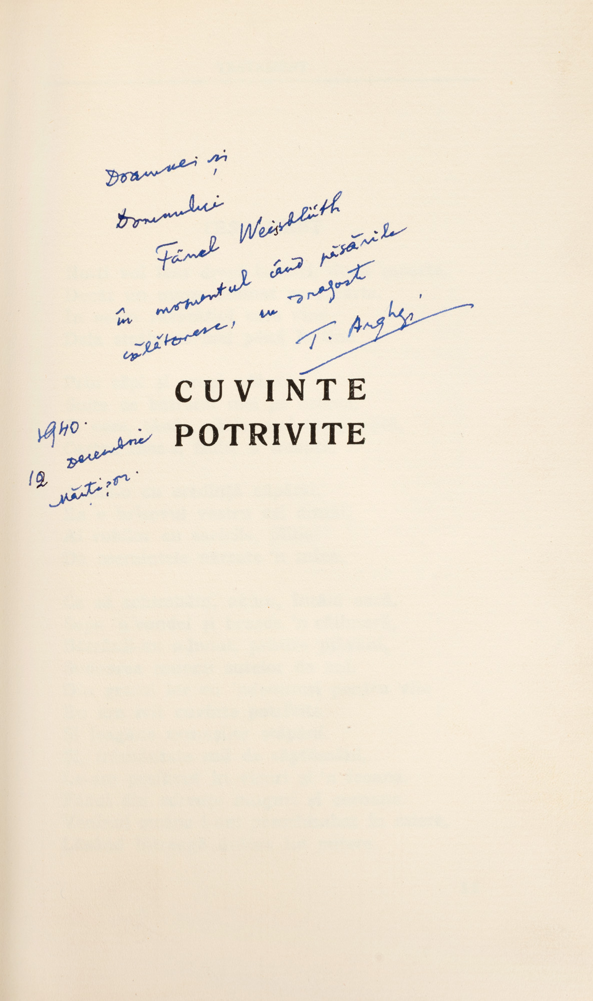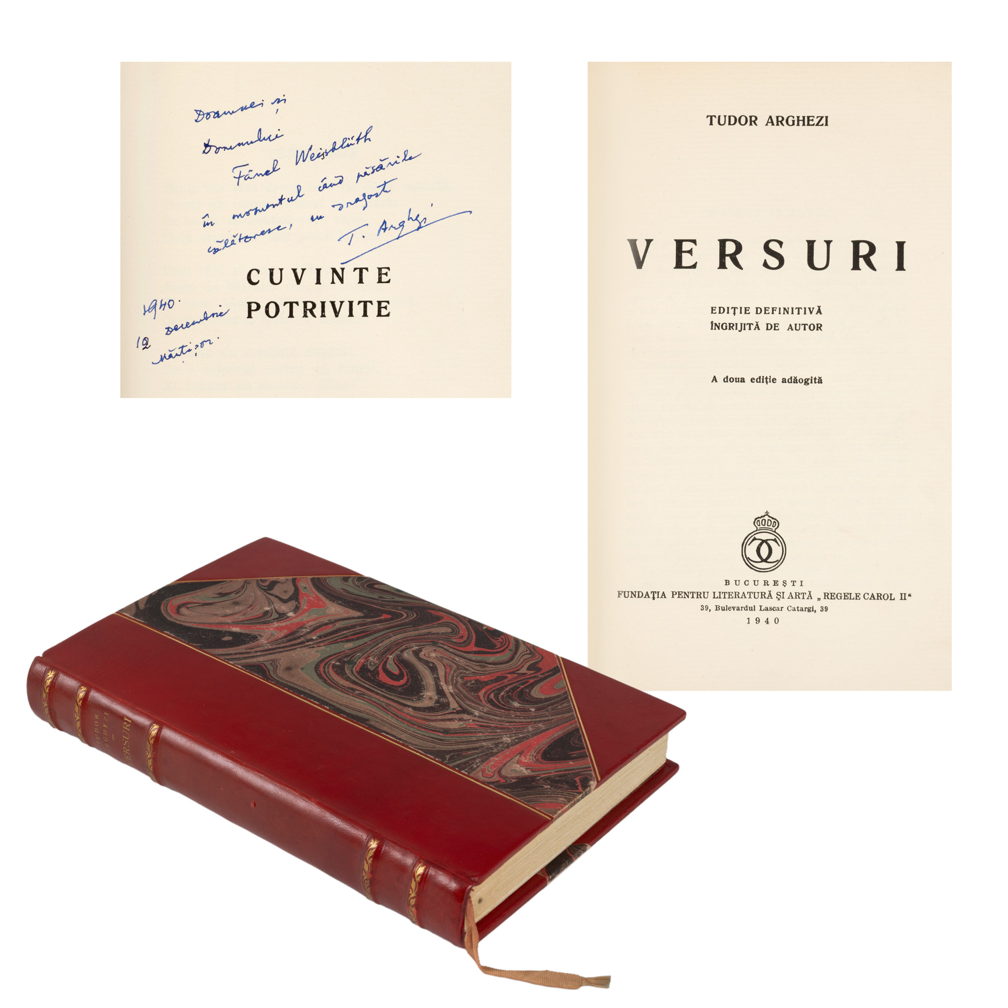 38. ”Versuri”, de Tudor Arghezi, București, 1940, ediție definitivă, exemplar 1923/2225, cu etui și dedicația olografă a autorului