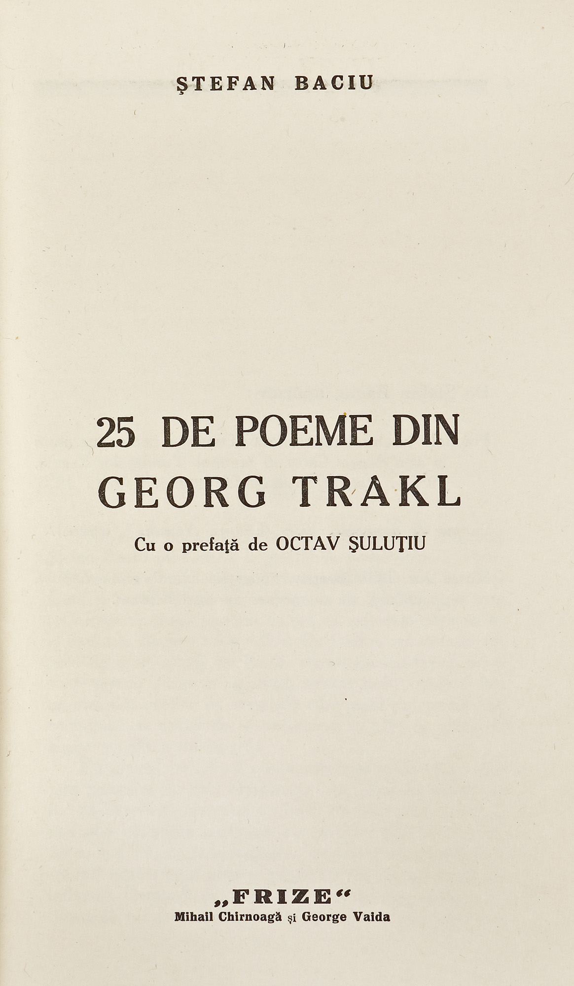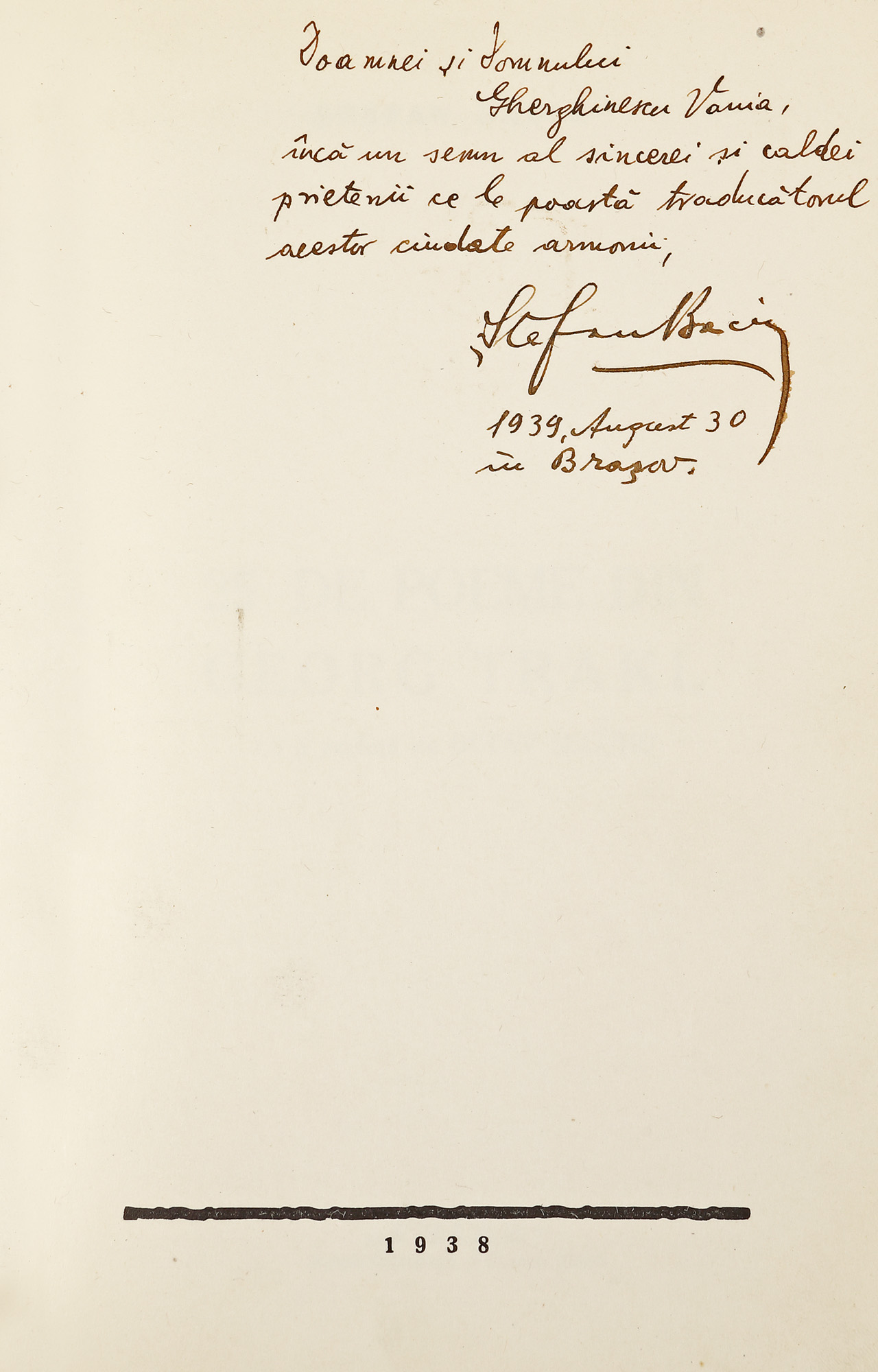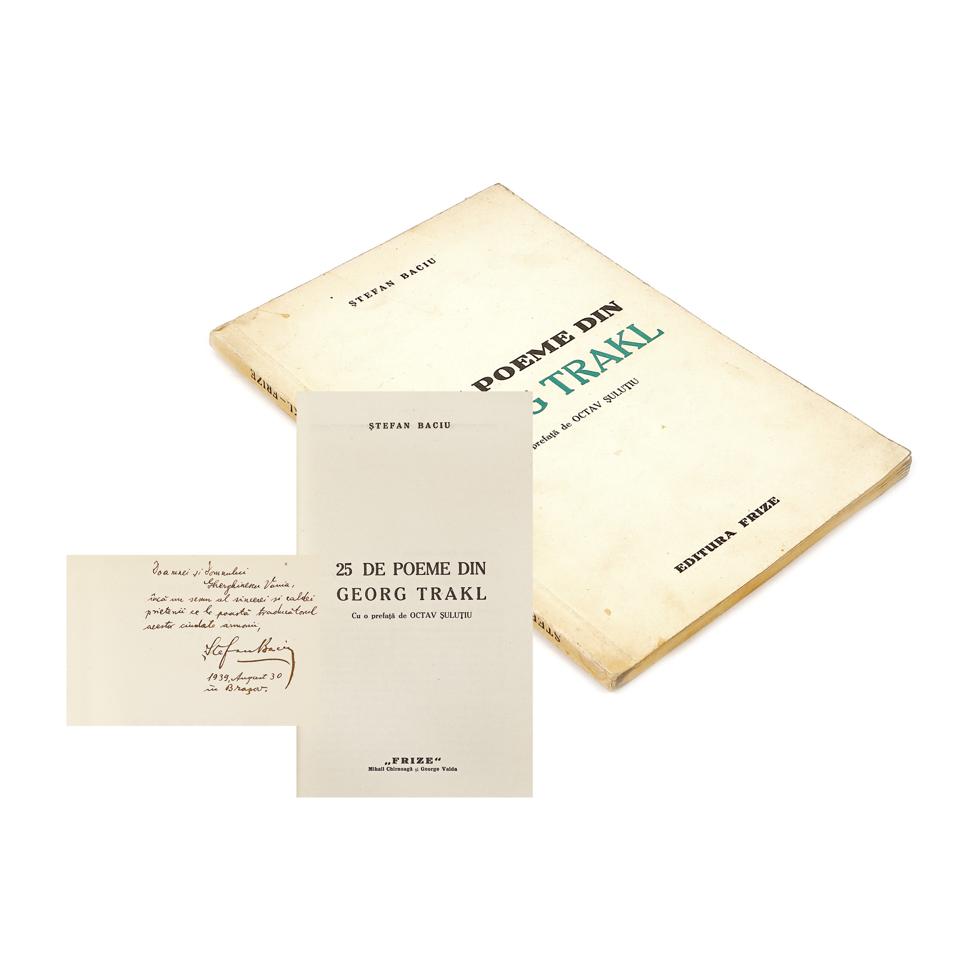 82. ”25 de poeme din Georg Trakl”, de Ștefan Baciu, ediție princeps, Iași, 1938, cu dedicația și semnătura olografă a traducătorului, provine din colecția scriitorului Vania Gherghinescu