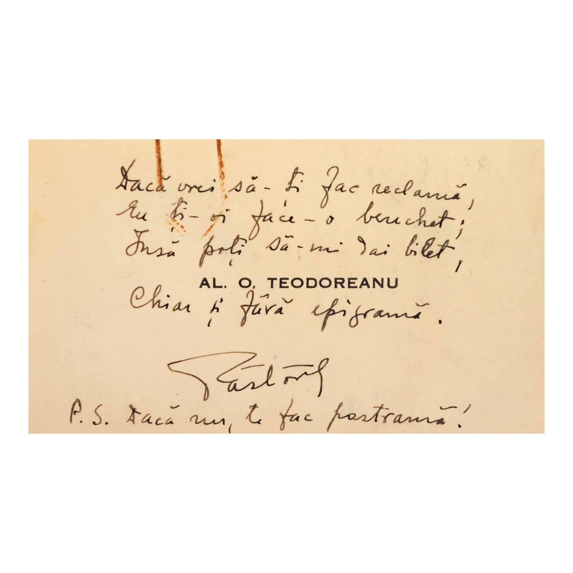 61. Carte de vizită a lui Păstorel Teodoreanu, cuprinzând o epigramă și semnătura olografă a epigramistului, piesă rară, de colecție