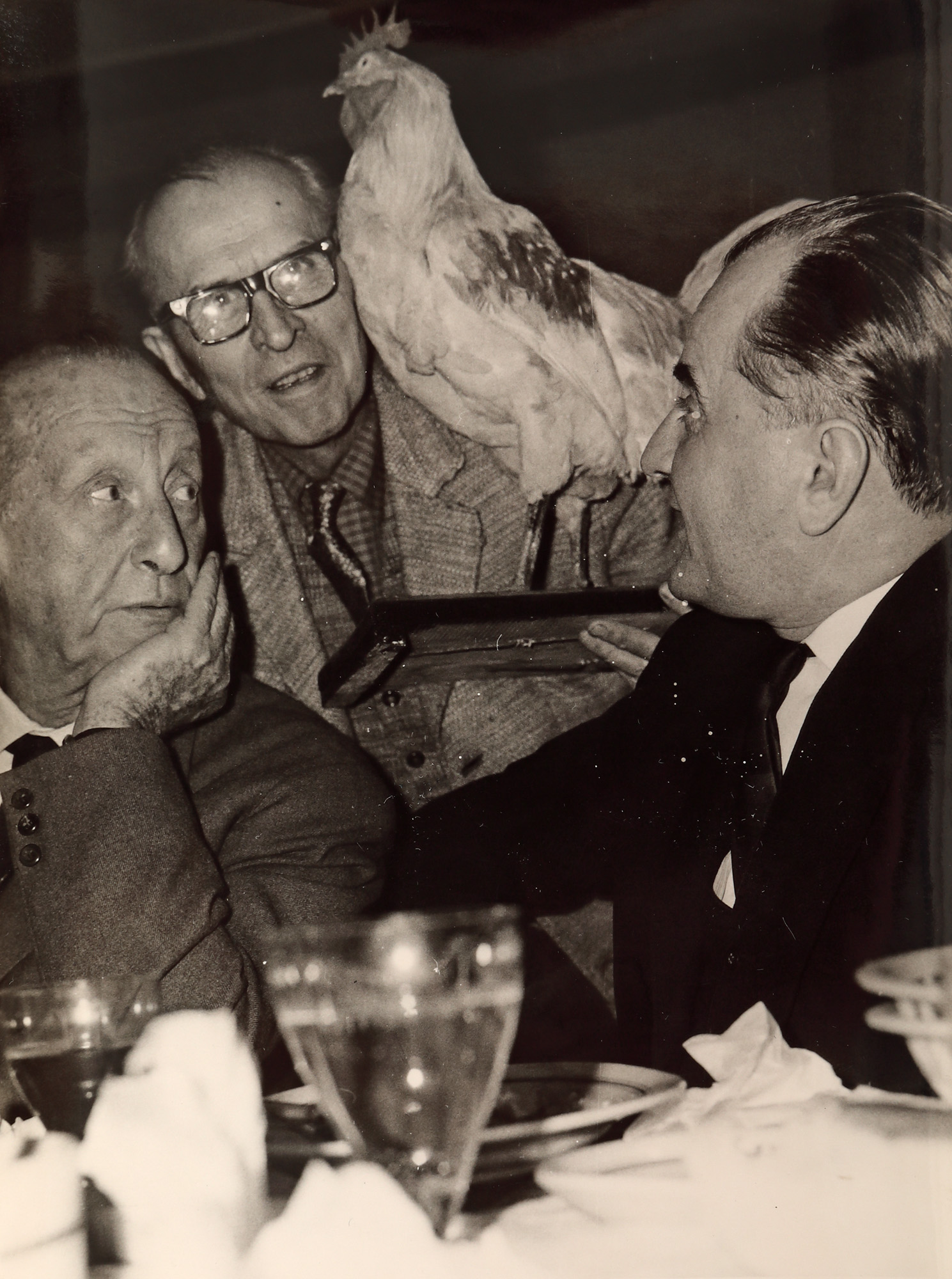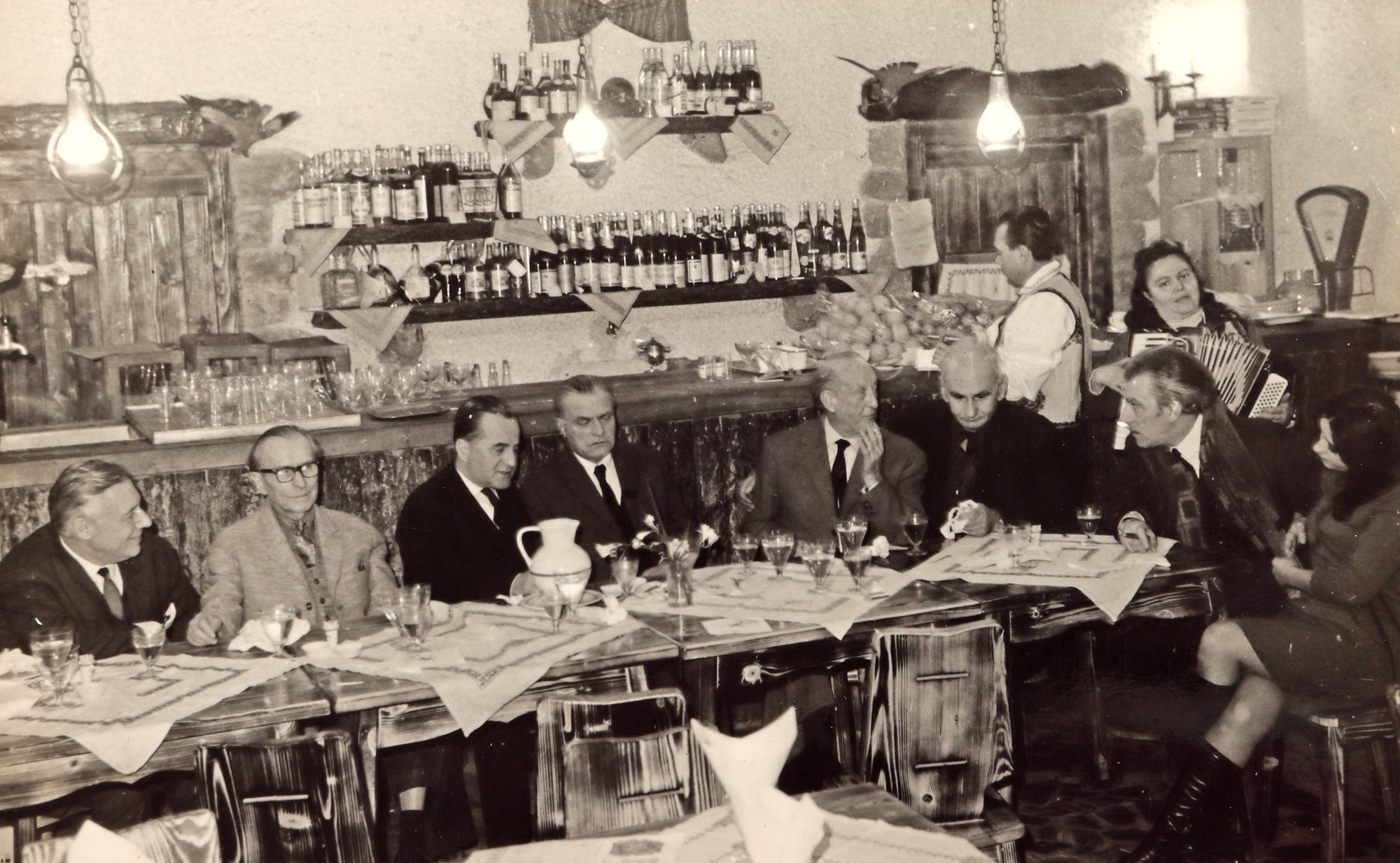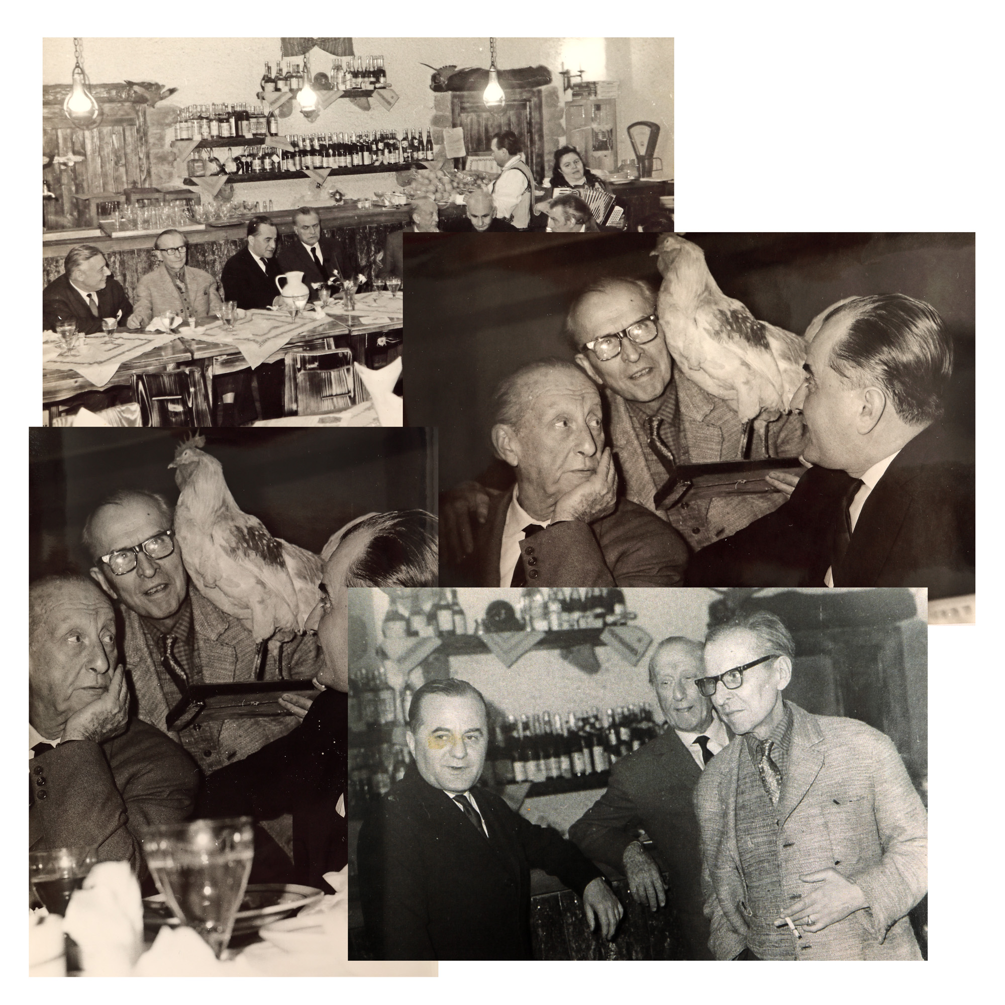 74. Lot format din patru fotografii de la aniversarea de 70 de ani a jurnalistului Felix Brunea-Fox, alături de Gheorghe Dinu (Ștefan Roll), Geo Bogza, Georghe Macovescu, Zaharia Stancu, Eugen Jebeleanu, în restaurantul ”La Doi Cocoși”, ianuarie 1968, provine din colecția fostului ministru de externe George Macovescu