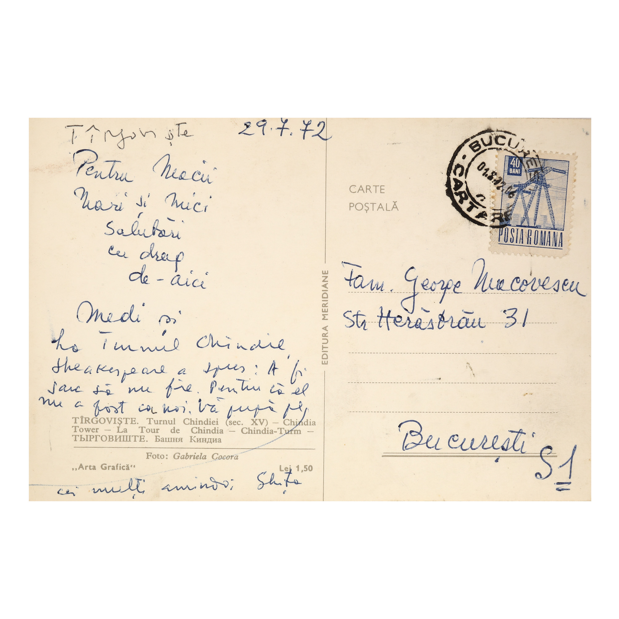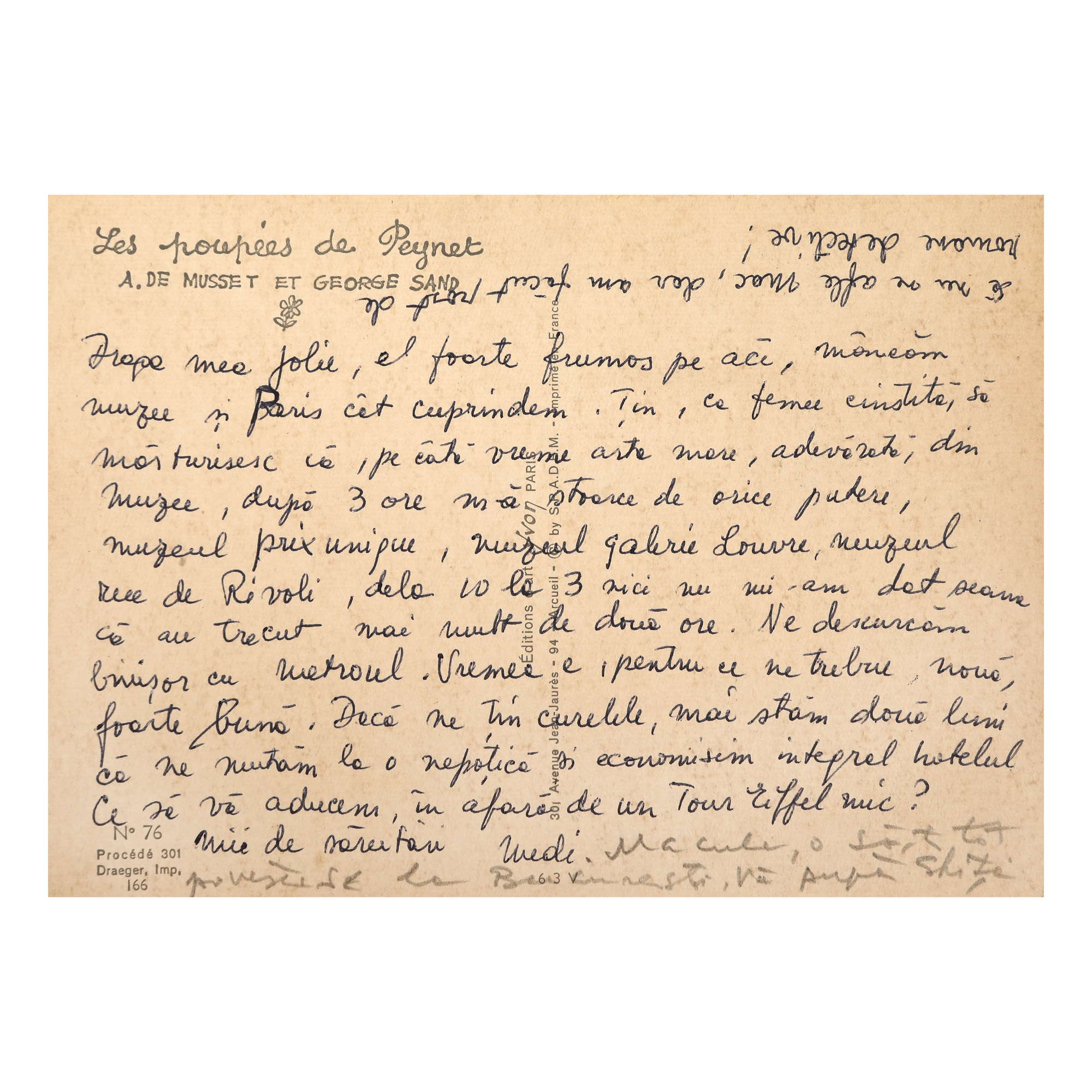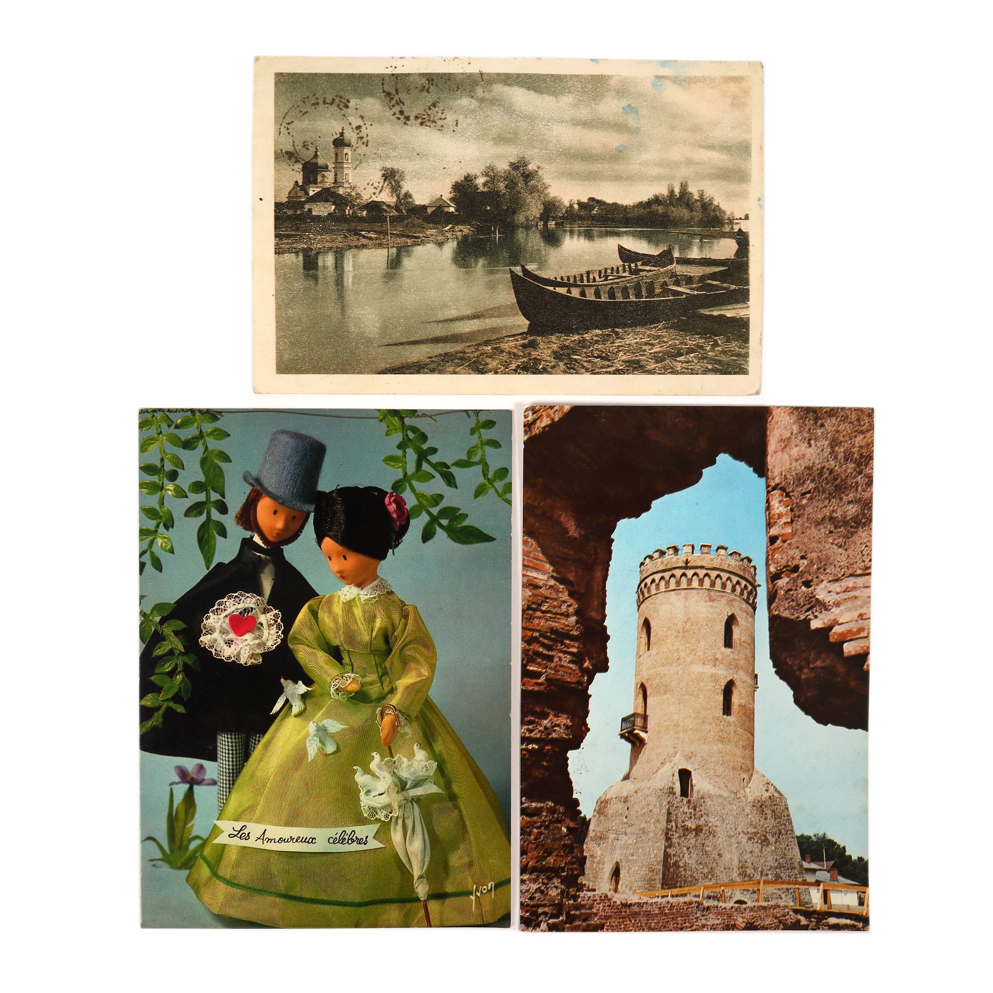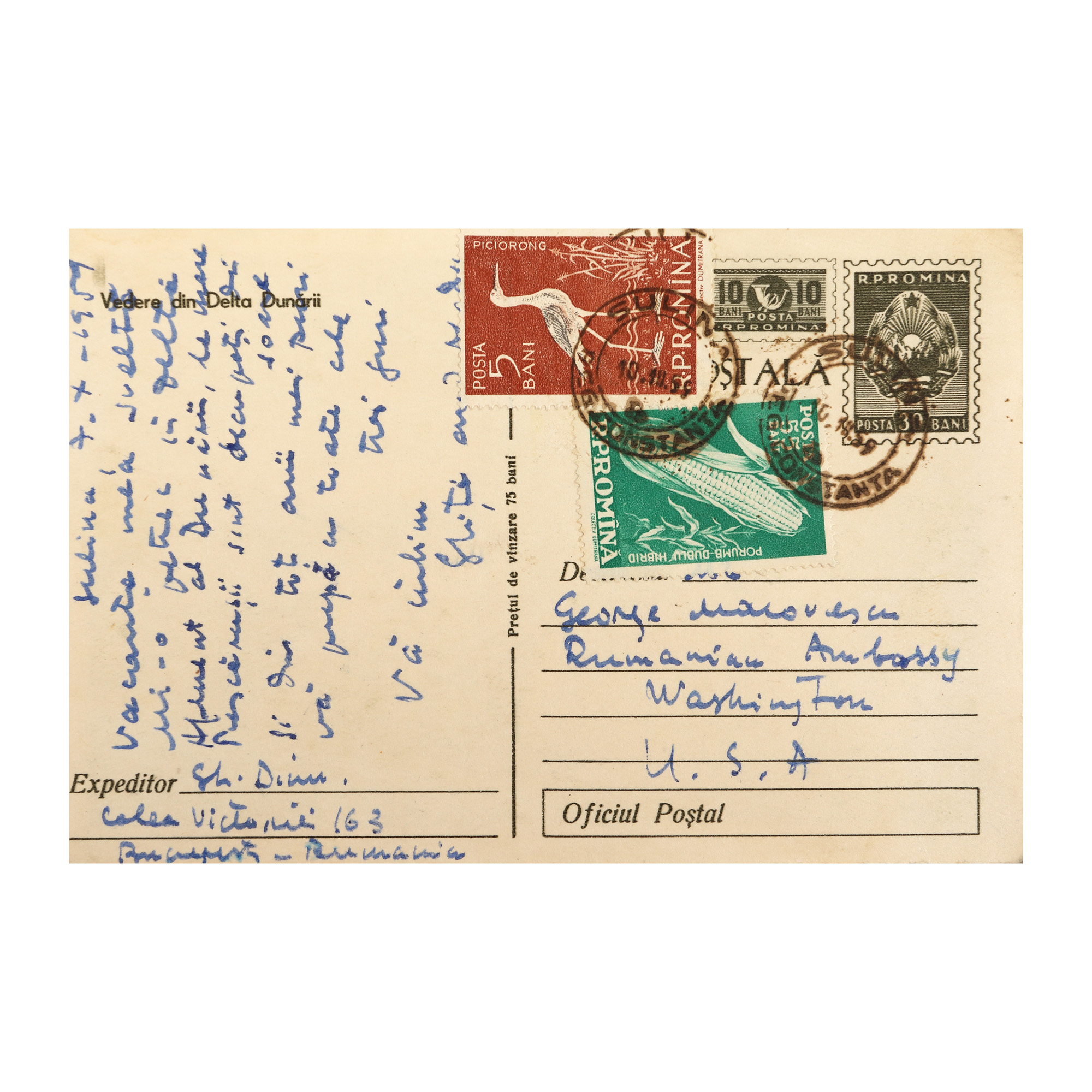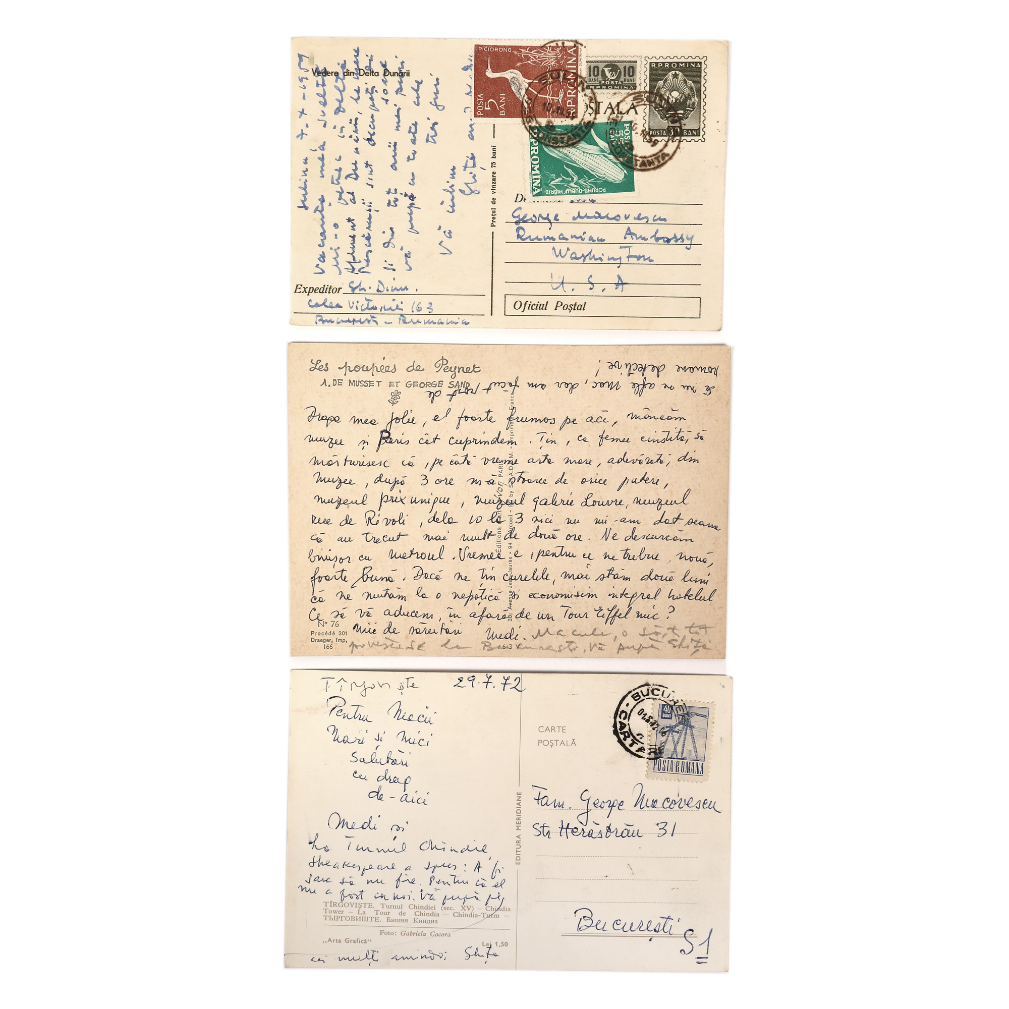 73. Lot format din trei cărți poștale trimise de către Ștefan Roll (Gheorghe) și Medi Dinu către George Macovescu și soția acestuia, cca. 1959-1972, Târgoviște, Sulina și Paris