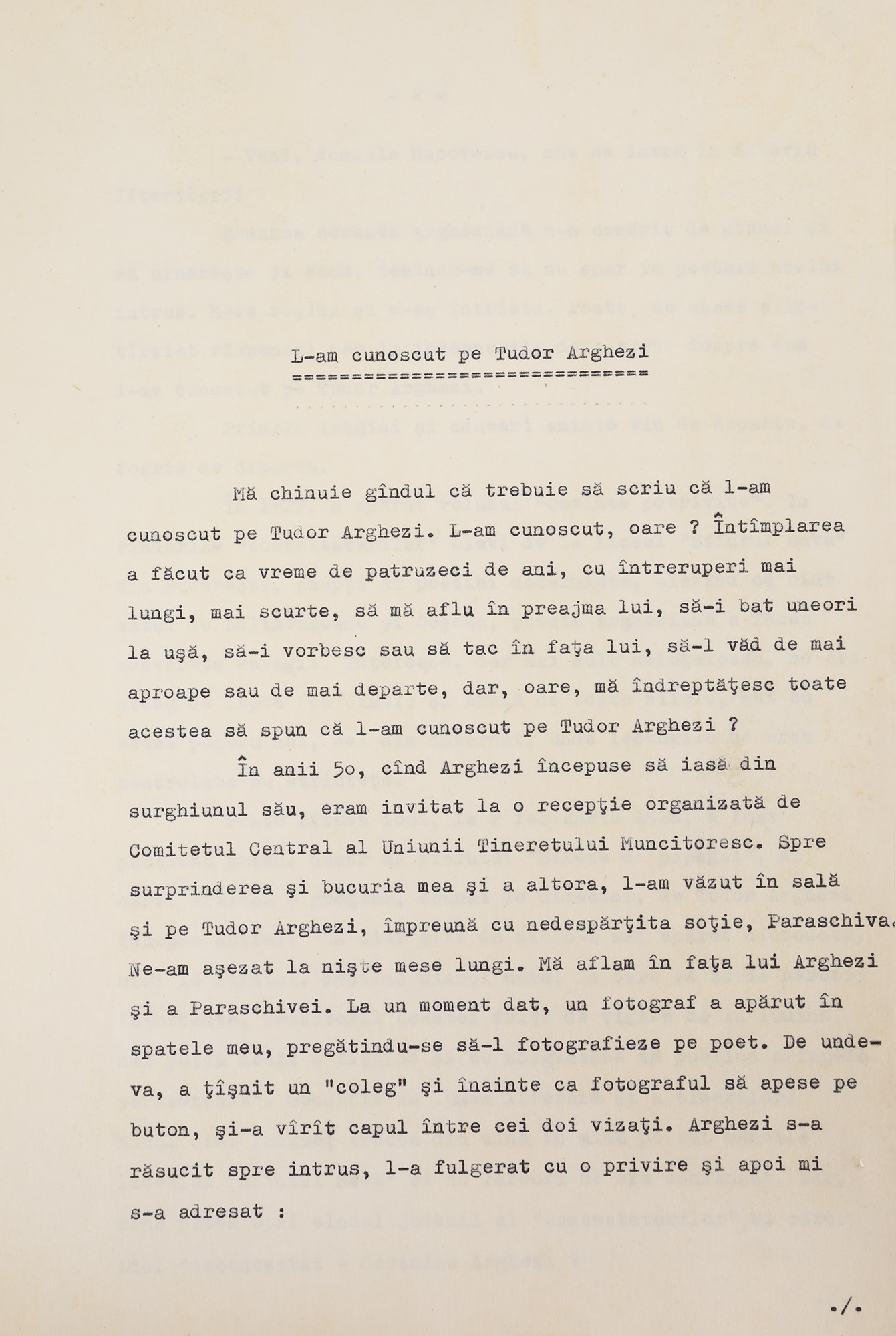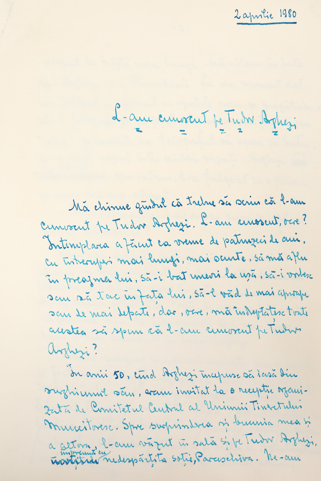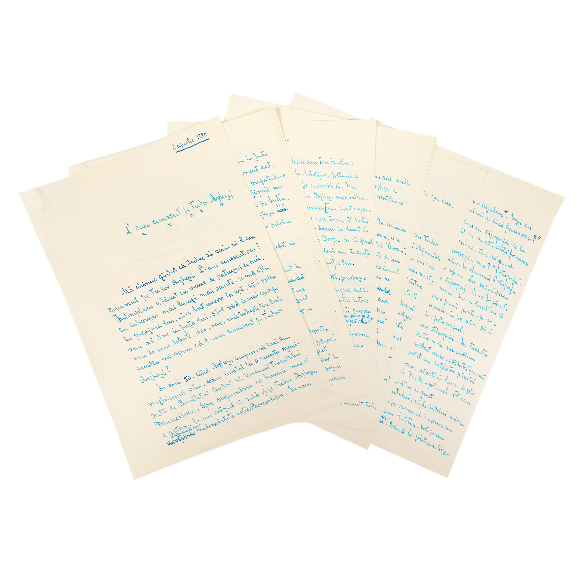 96. Manuscris ”L-am cunoscut pe Tudor Arghezi”, de George Macovescu, 2 aprilie 1980, însoțit de dactilogramă, provine din colecția fostului ministru de externe George Macovescu (23 file)