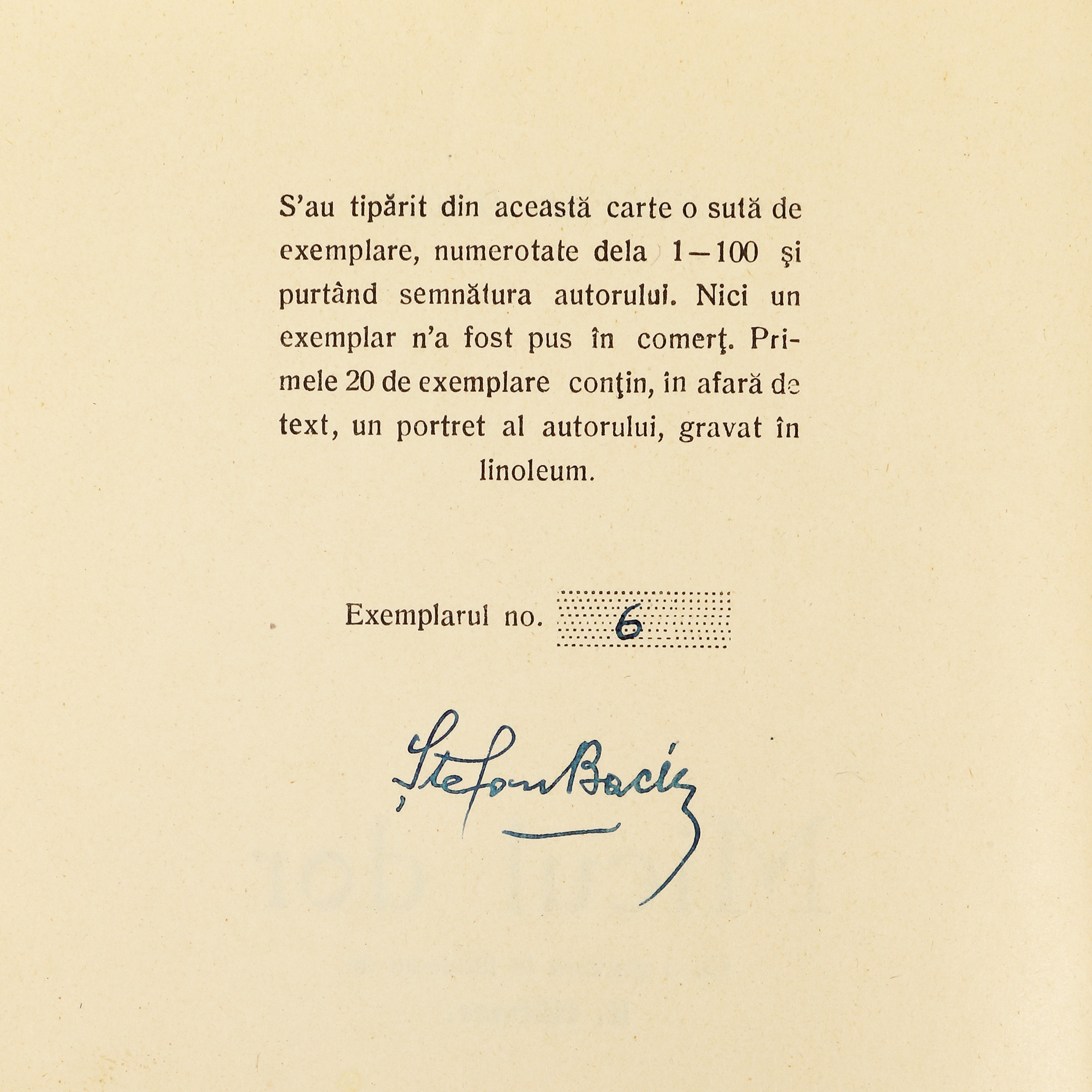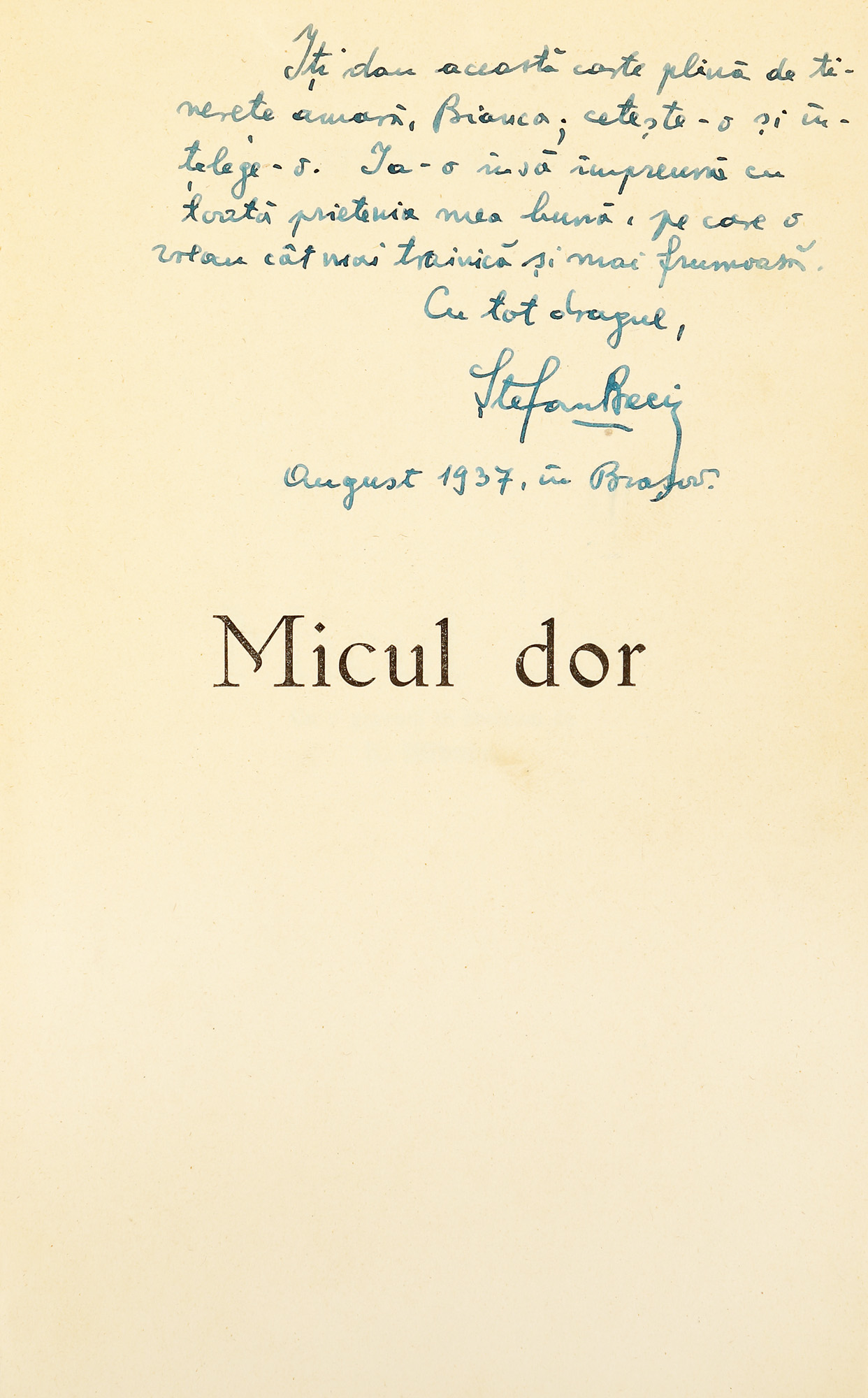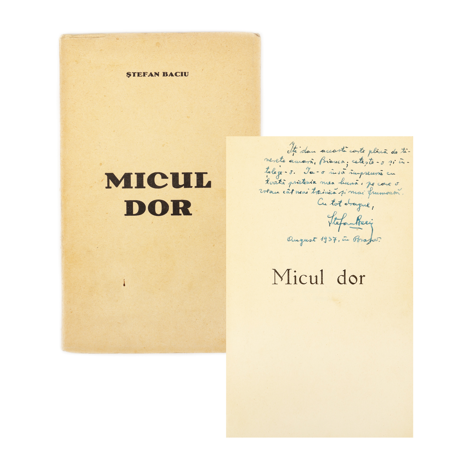 98. ”Micul dor”, de Ștefan Baciu, Brașov, 1937, cu dedicația și semnătura olografă a autorului, exemplar nedestinat comerțului, 6/100, cu o gravură de Karl Hübner, provine din colecția scriitorului Vania Gherghinescu