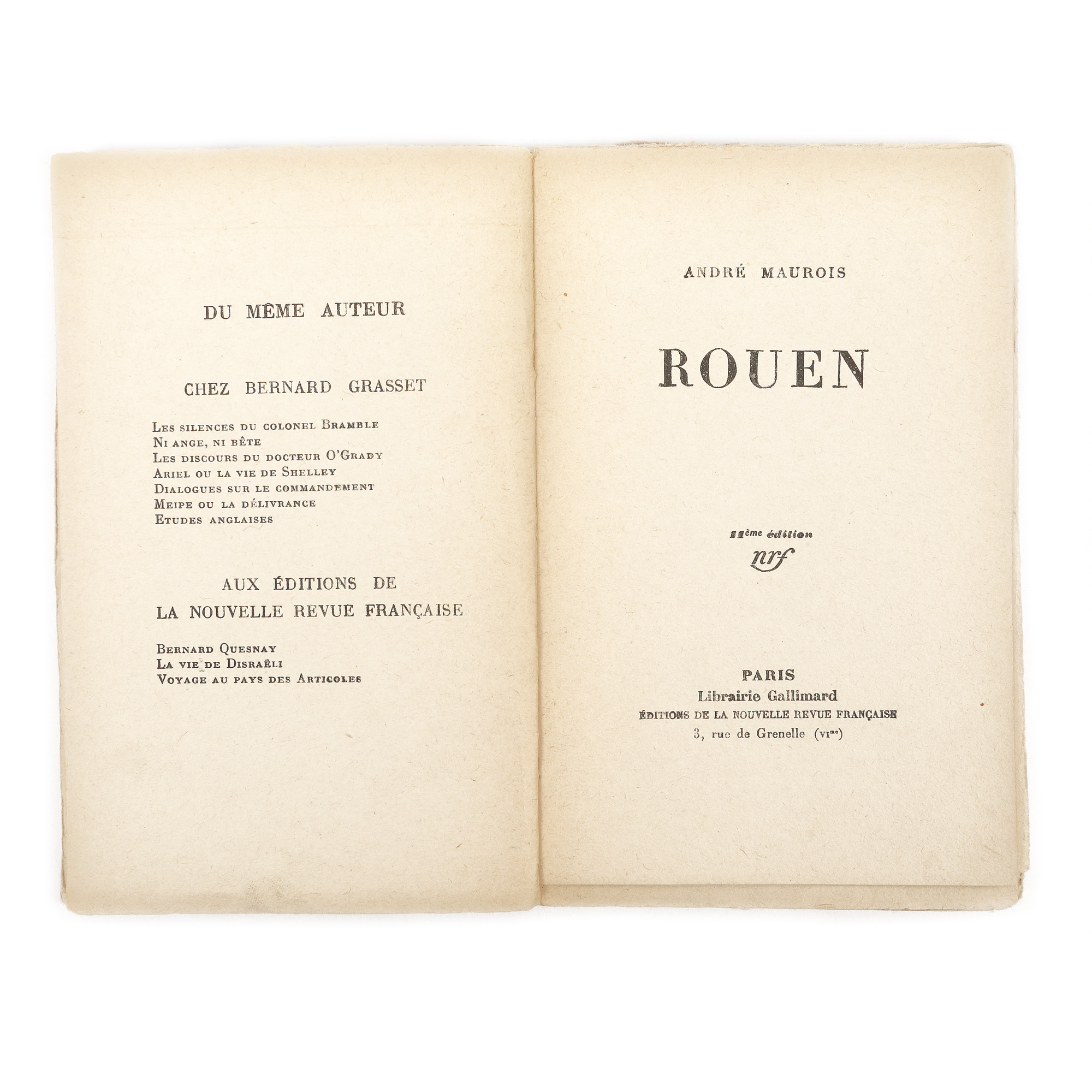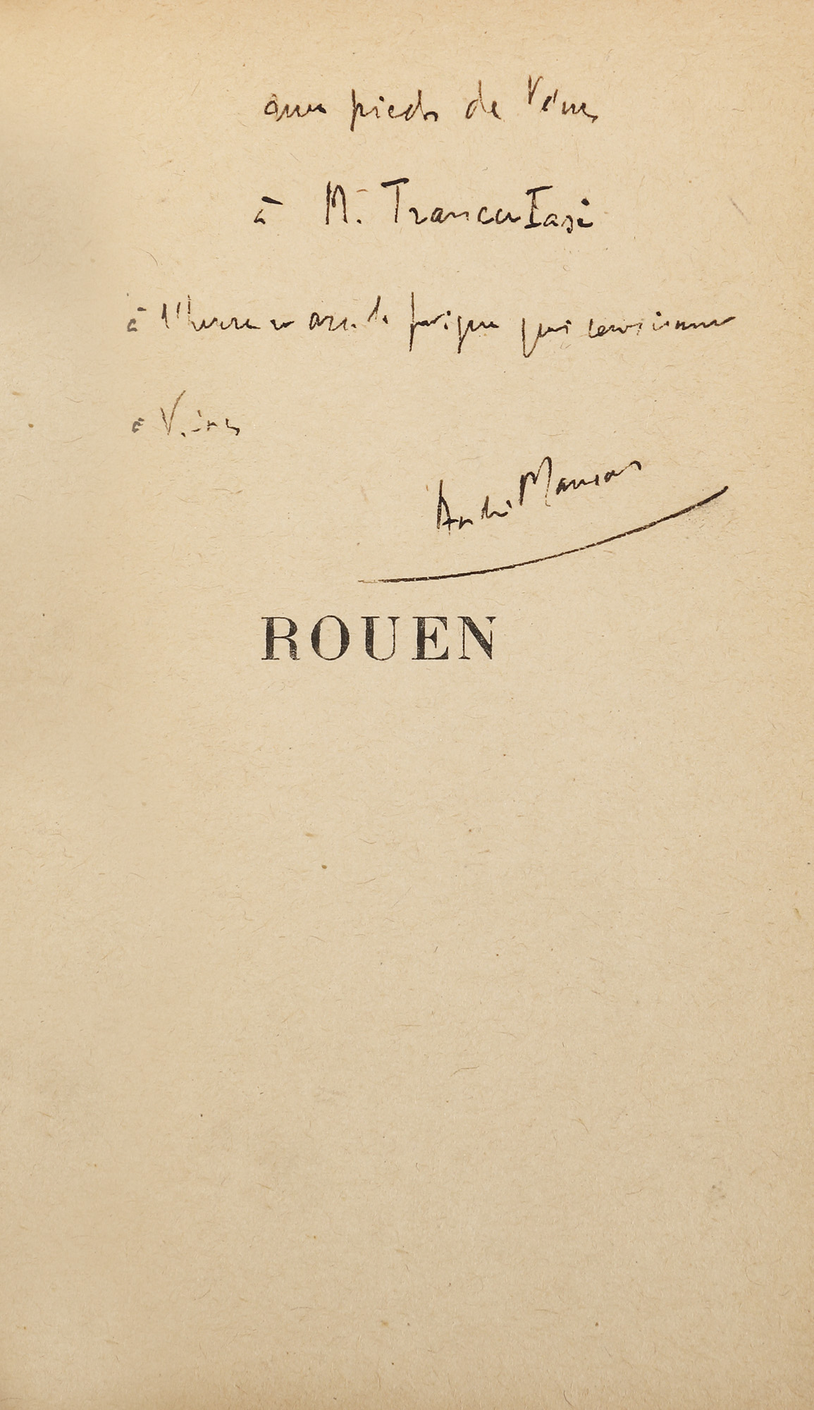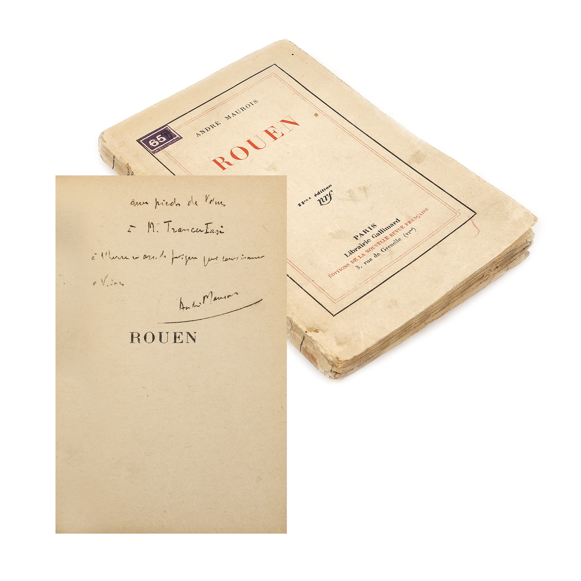90. ”Rouen”, de André Maurois, franceză, Paris, 1929, cu dedicația autorului către Grigore Trancu-Iași