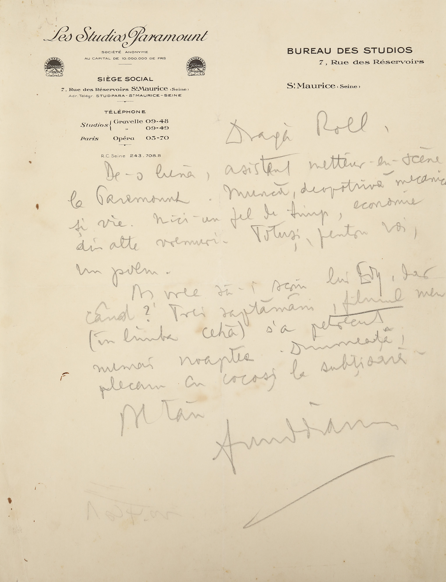 71. Scrisoare trimisă de Benjamin Fundoianu către Ștefan Roll, cu semnătura olografă, provine din colecția poetului avangardist Sașa Pană (1 filă)