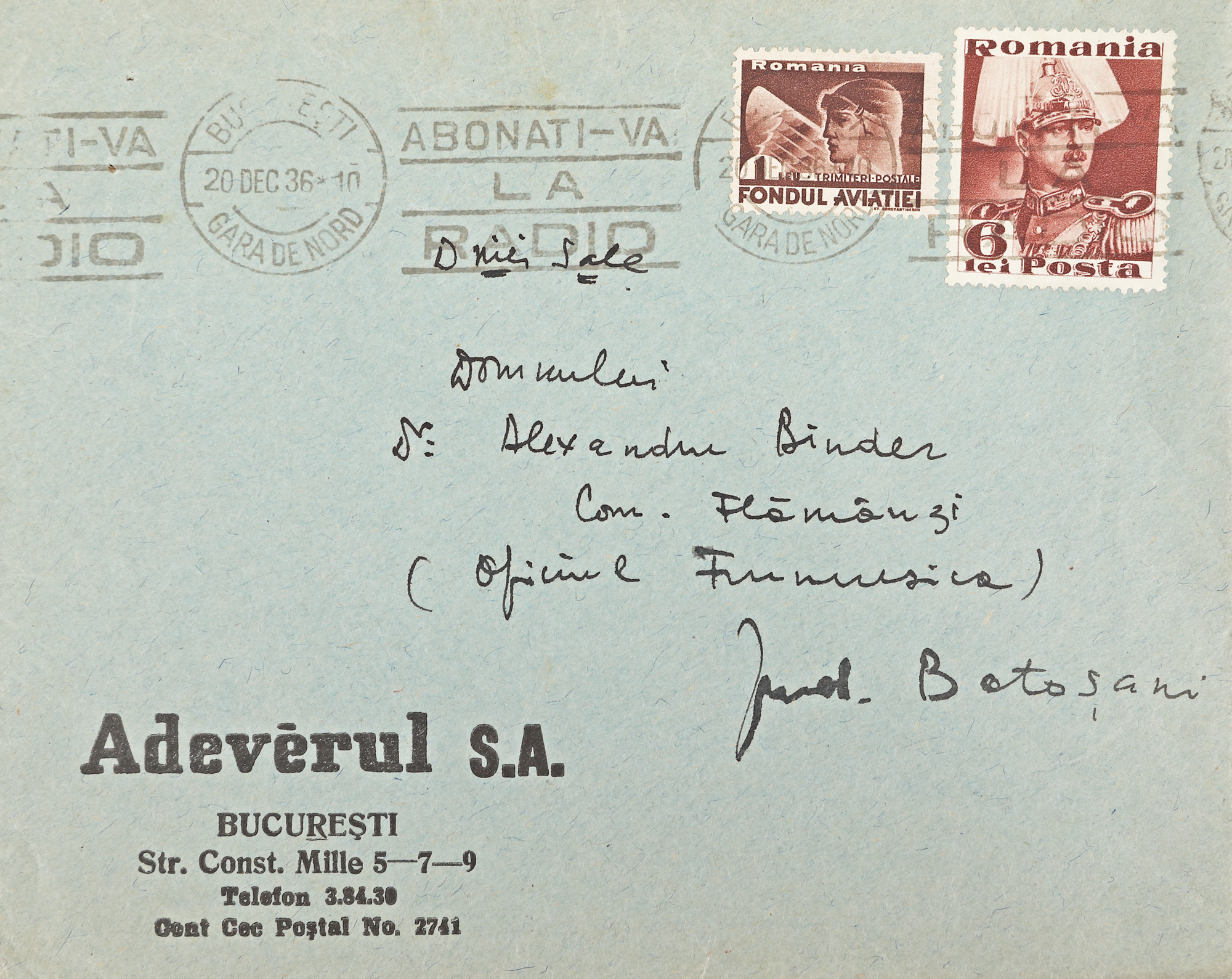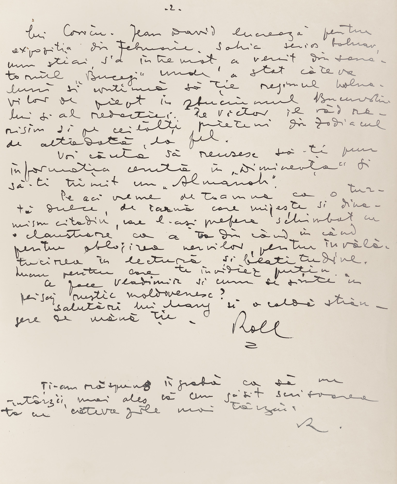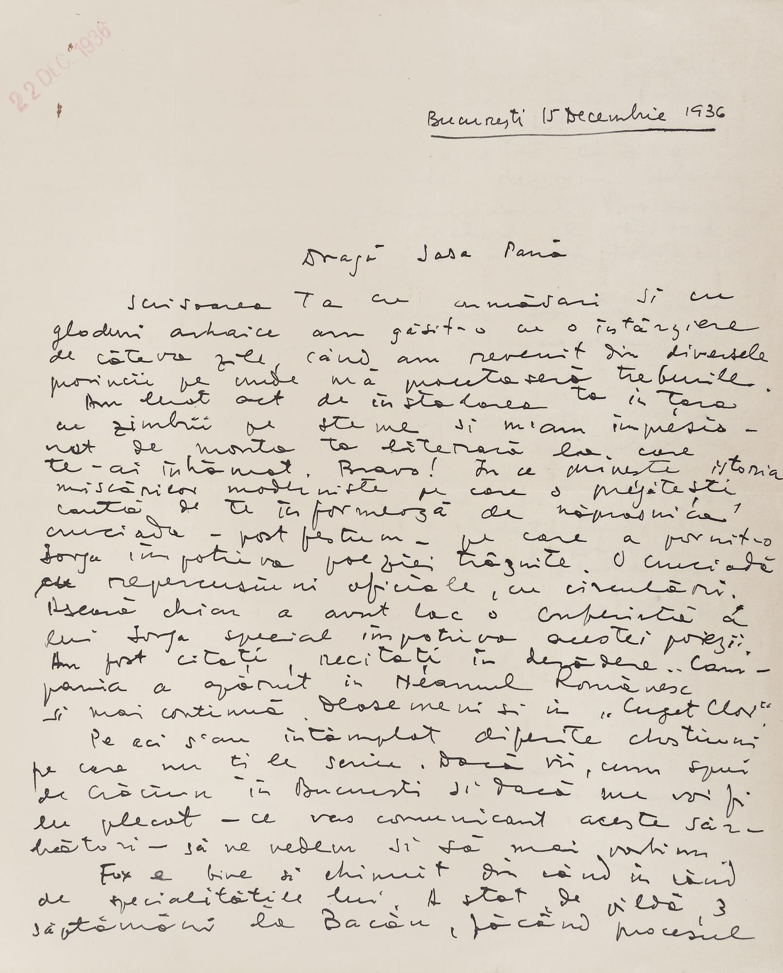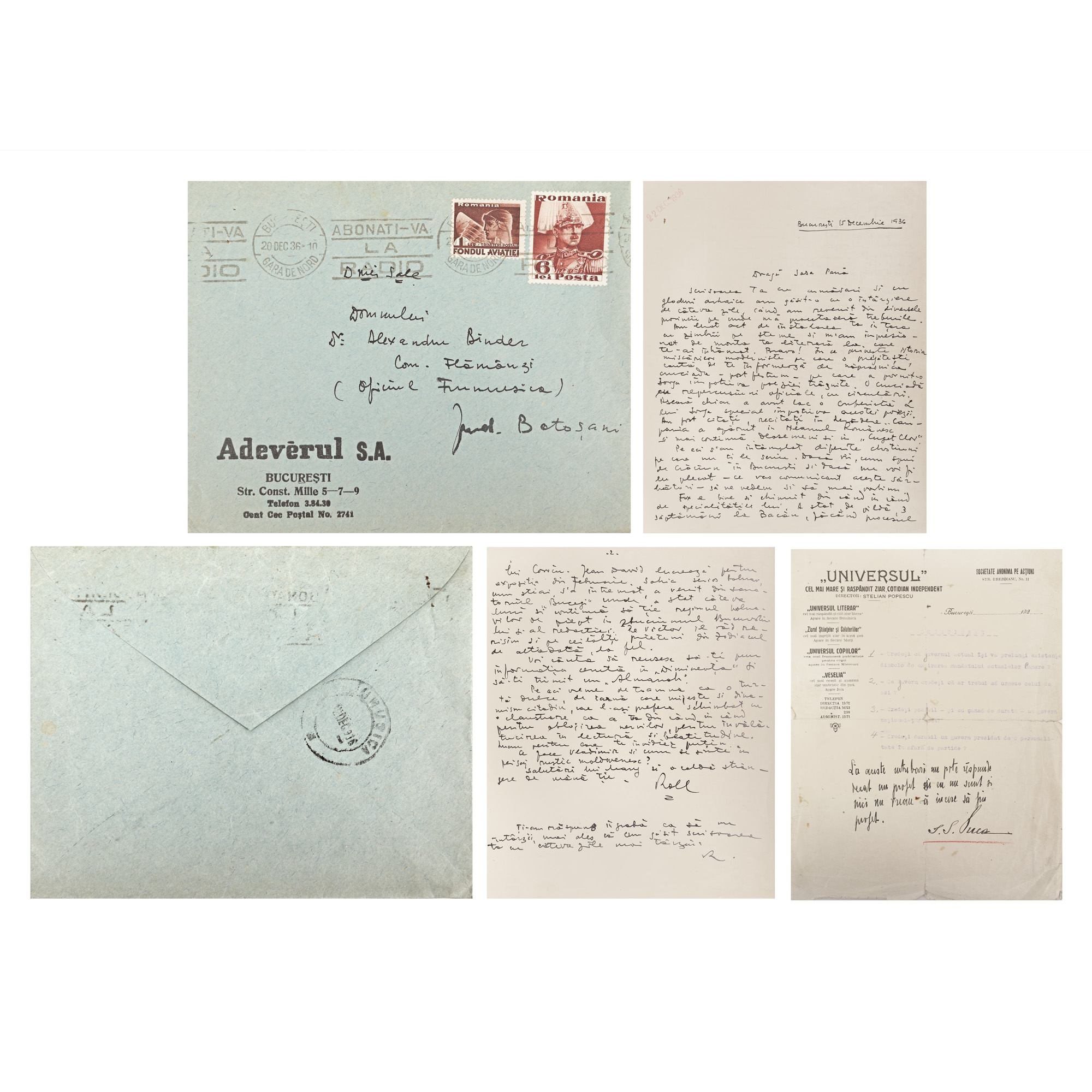 72. Scrisoare trimisă de Ștefan Roll către Sașa Pană, București, 15 decembrie 1936, cu plicul original și semnătura olografă (2 file)