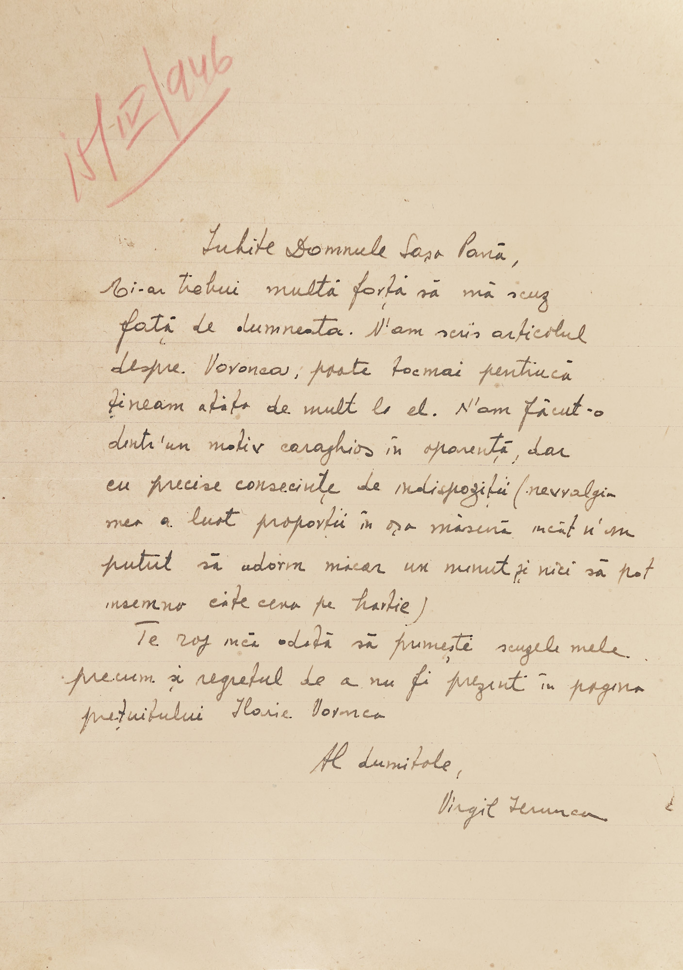 75. Scrisoare trimisă de Virgil Ierunca către Sașa Pană, 15 aprilie 1946, cu semnătura olografă (1 filă)