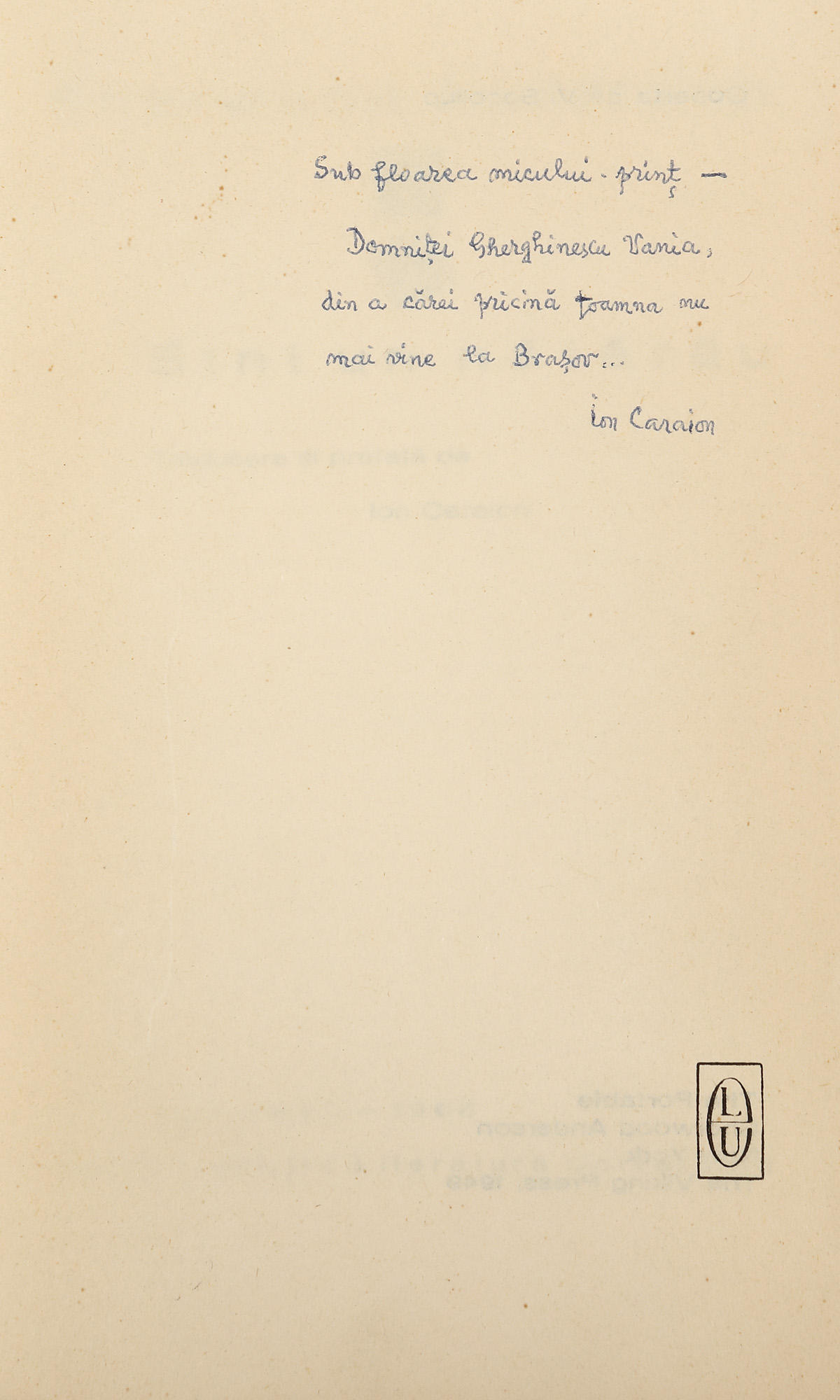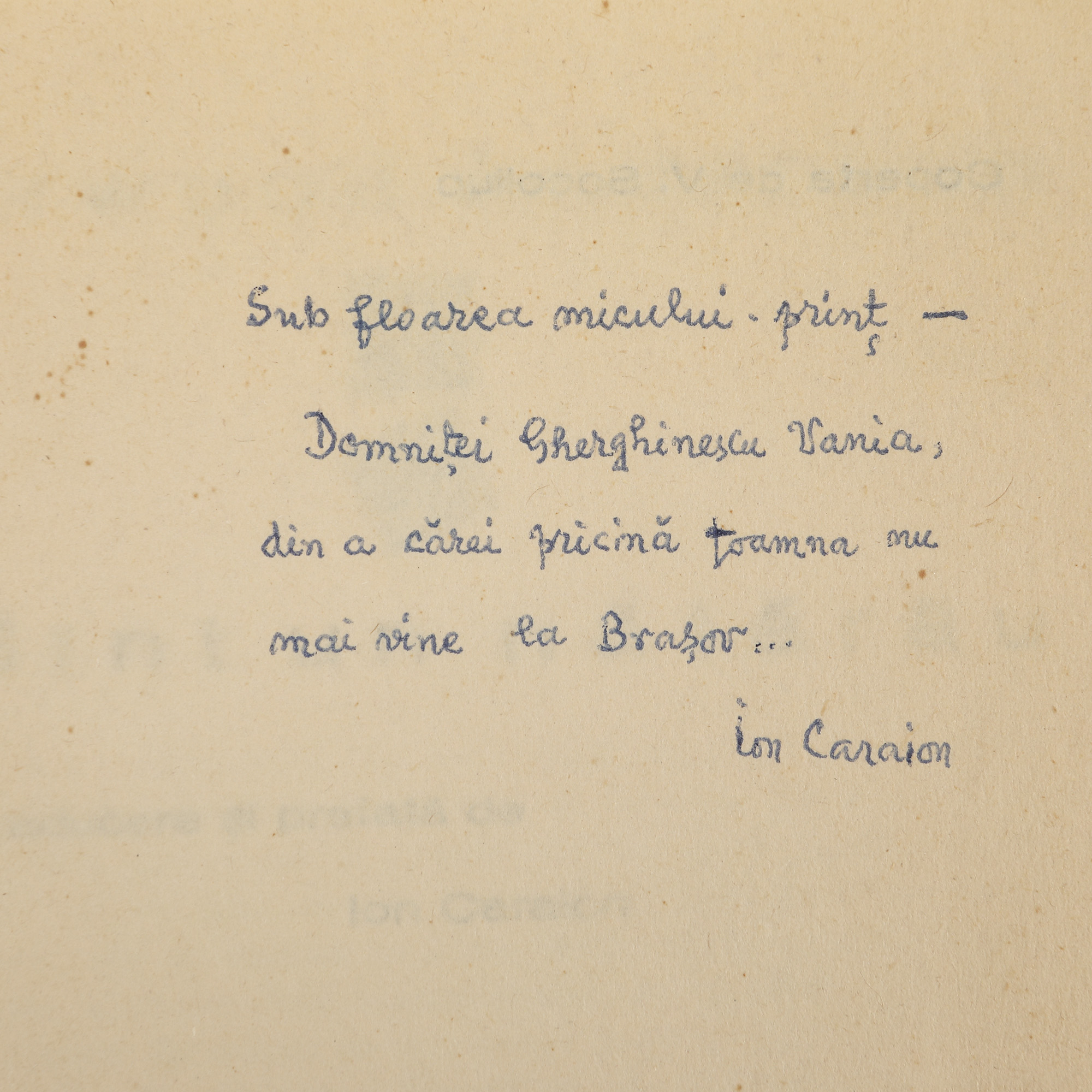 91. ”Sunt un nătărău”, de Sherwood Anderson, cu prefață și traducere de Ion Caraion, București 1966, cu dedicația ”sub floarea micului prinț...” și semnătura lui Caraion, provine din colecția scriitorului Vania Gherghinescu