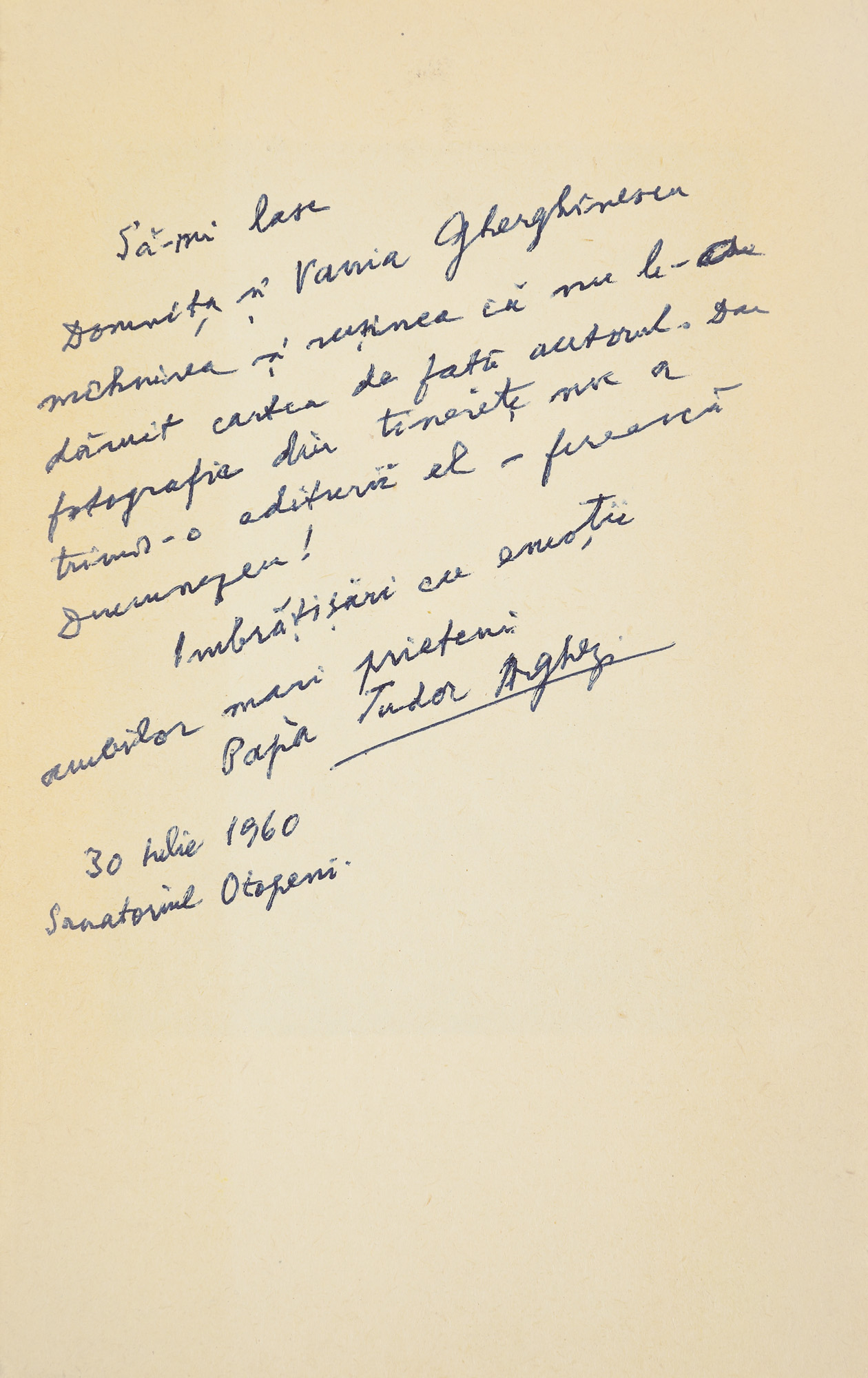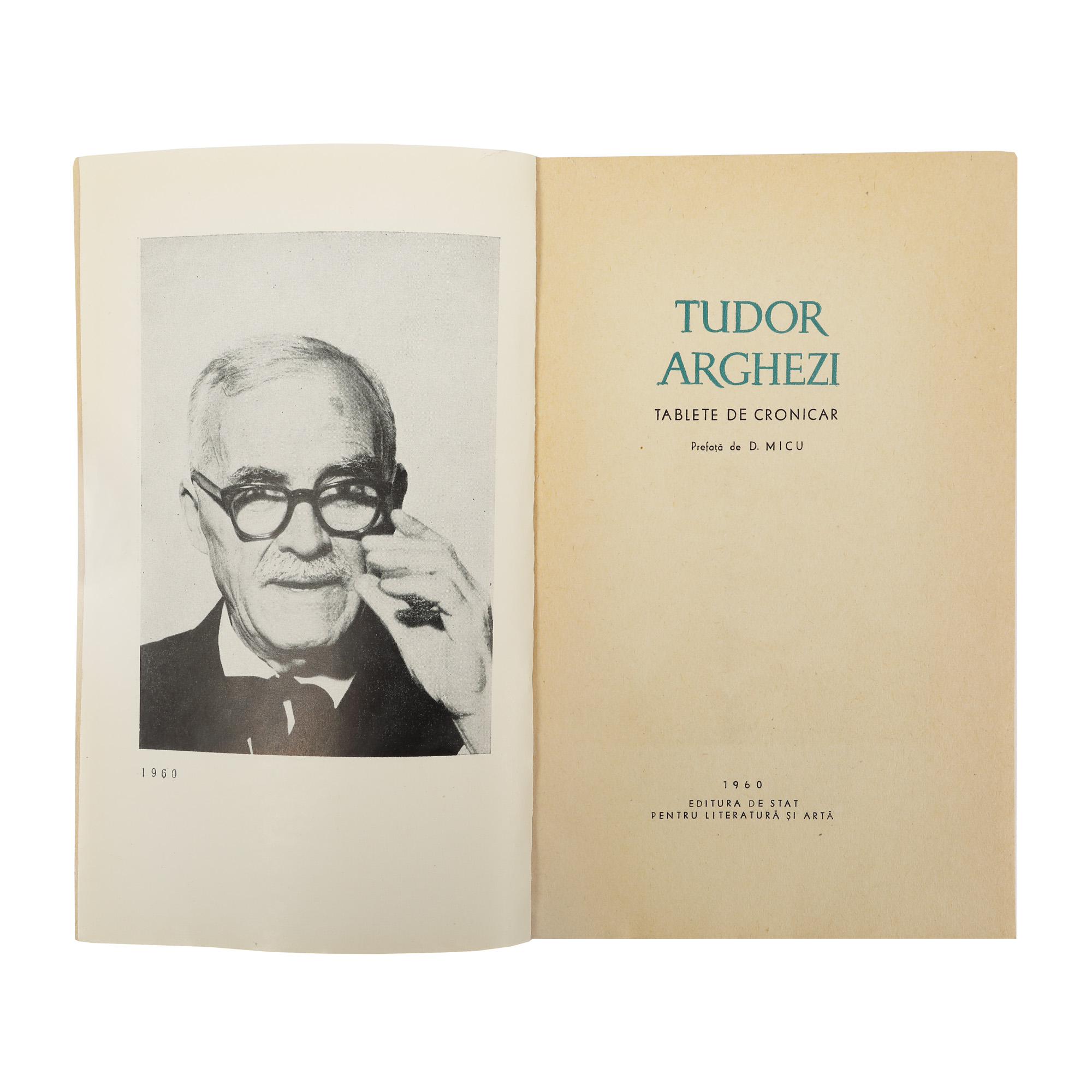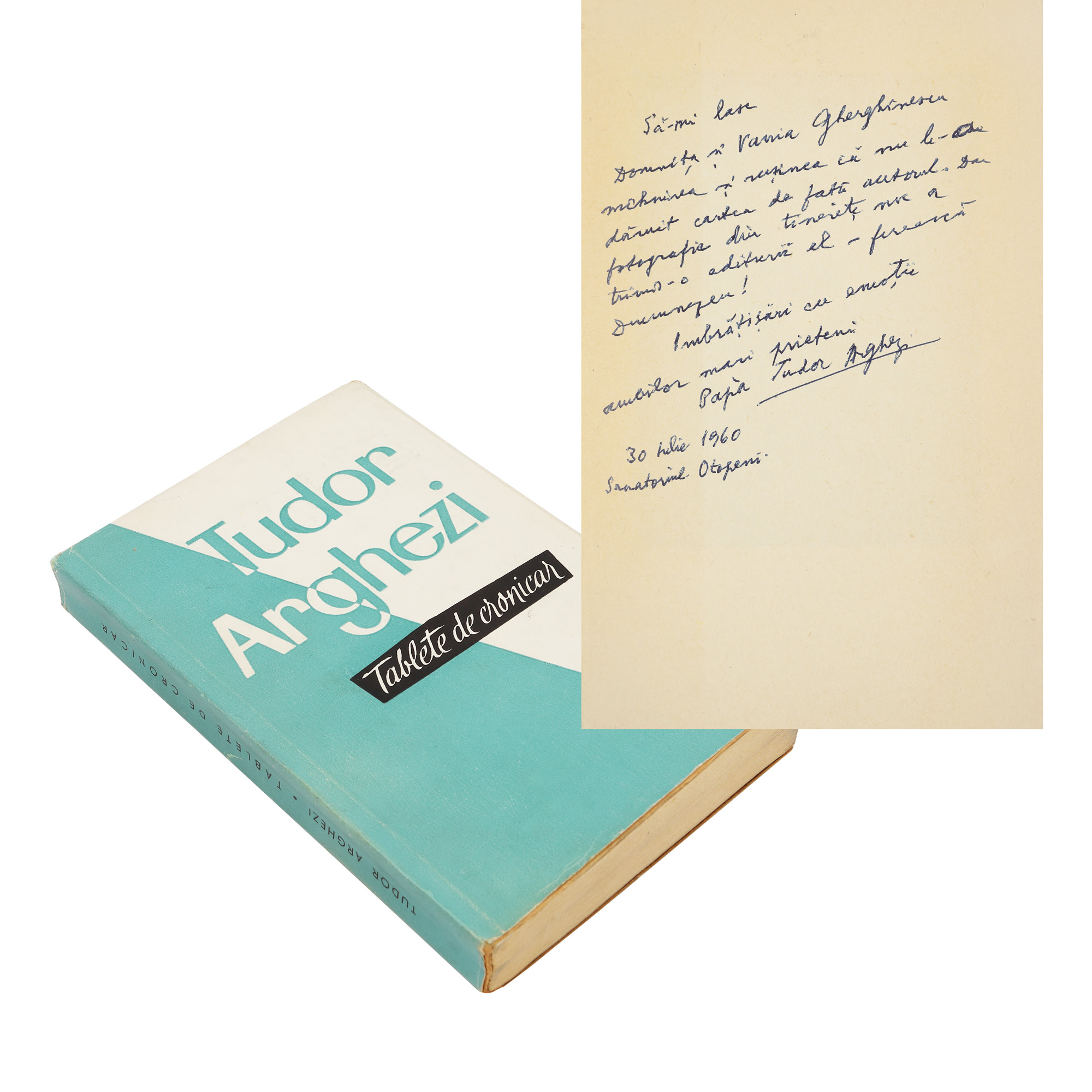 94. ”Tablete de cronicar”, de Tudor Arghezi, București, 1960, cu dedicația și semnătura olografă a autorului, provine din colecția scriitorului Vania Gherghinescu