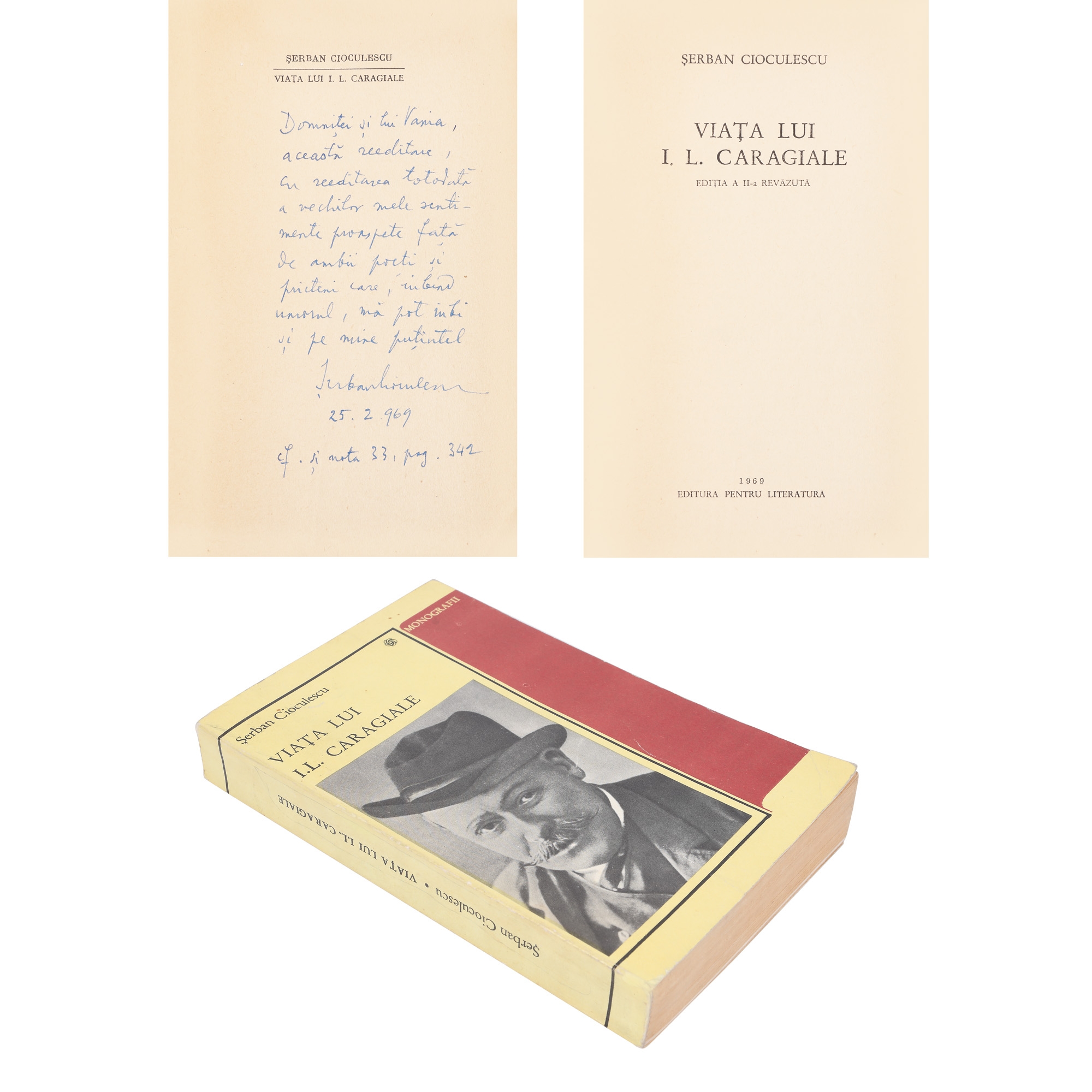 100. ”Viața lui I.L. Caragiale”, de Șerban Cioculescu, București, 1969, cu dedicația și semnătura olografă a autorului, provine din colecția scriitorului Vania Gherghinescu