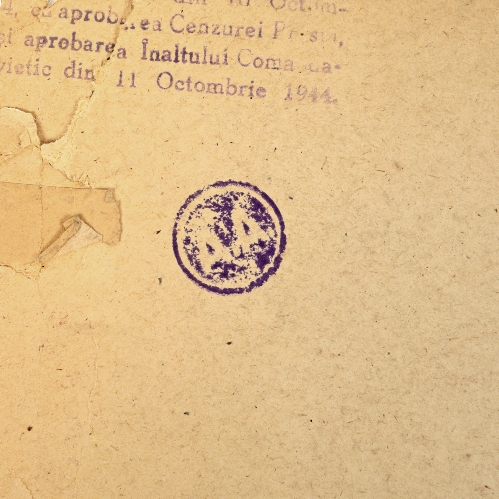 122. Afiș ”Victoria Națiunilor Unite”, de Ary Murnu, semnat olograf, cu ștampila Cenzurii Presei datată 11 octombire 1944, provine din colecția familiei de artiști Murnu