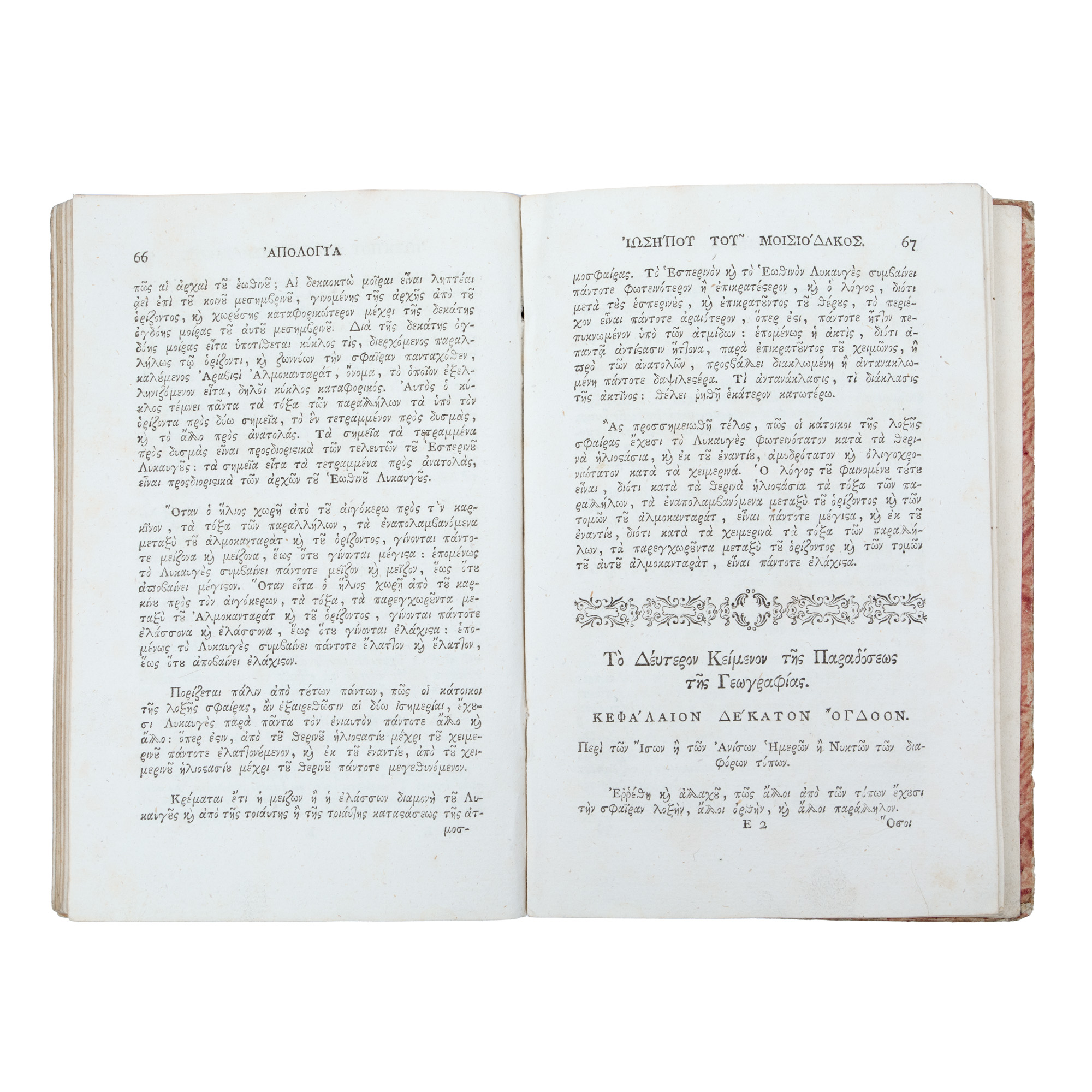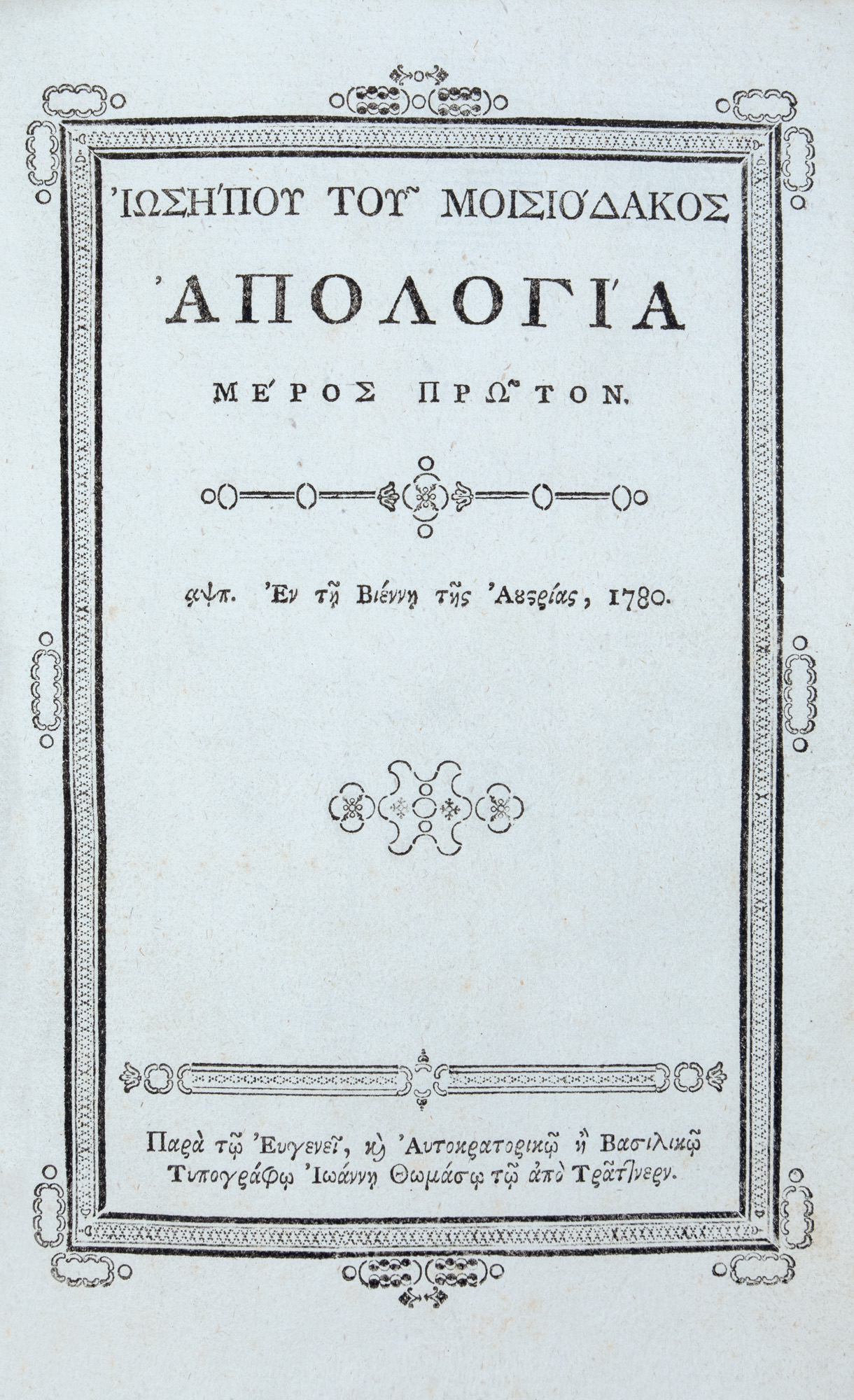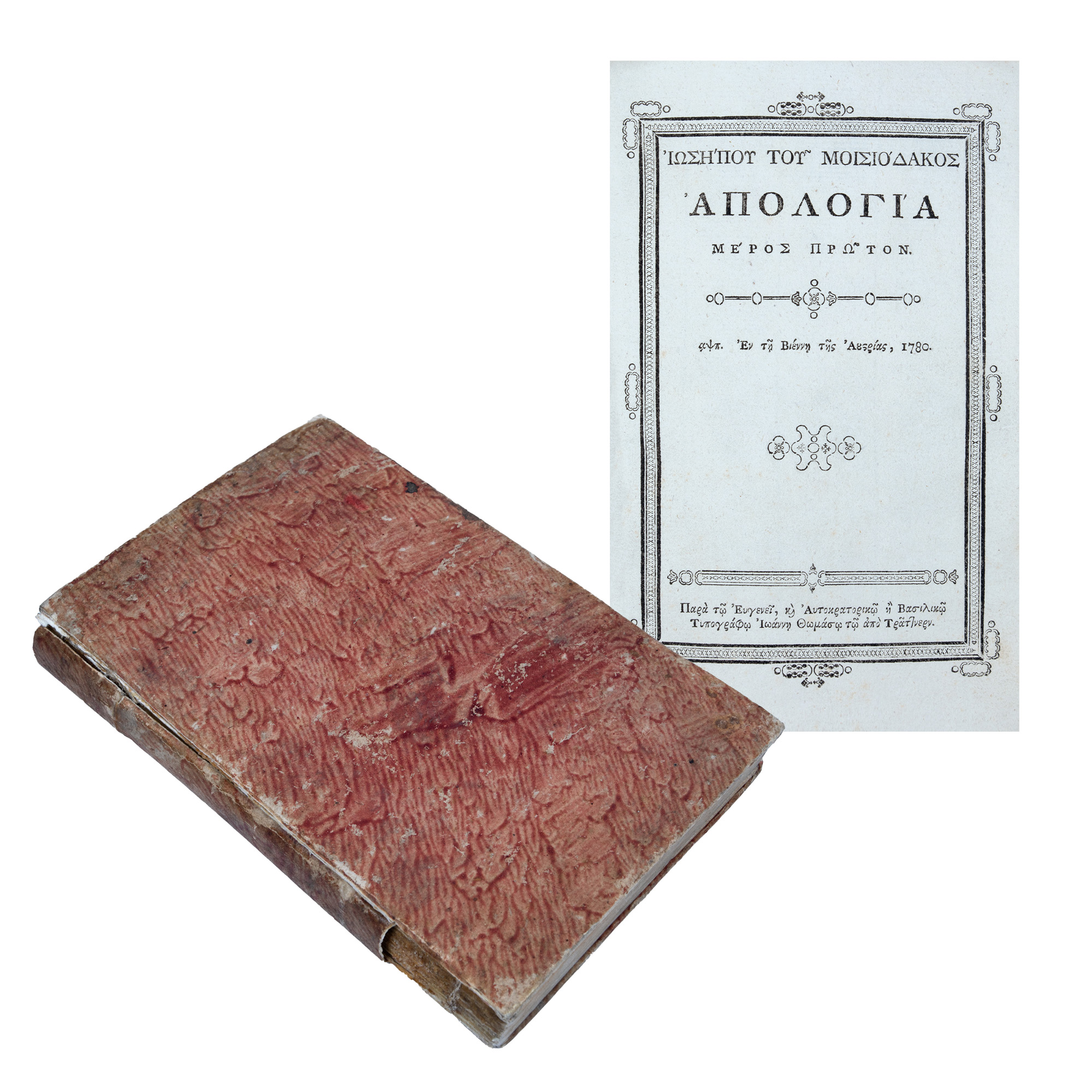 101. "Apologia", de Iossipos Moissiodakas (din Cernavodă), director al Academiei Domnești de la Iași, greacă, partea I, Viena, 1780, provine din colecția criticului literar Șerban Cioculescu