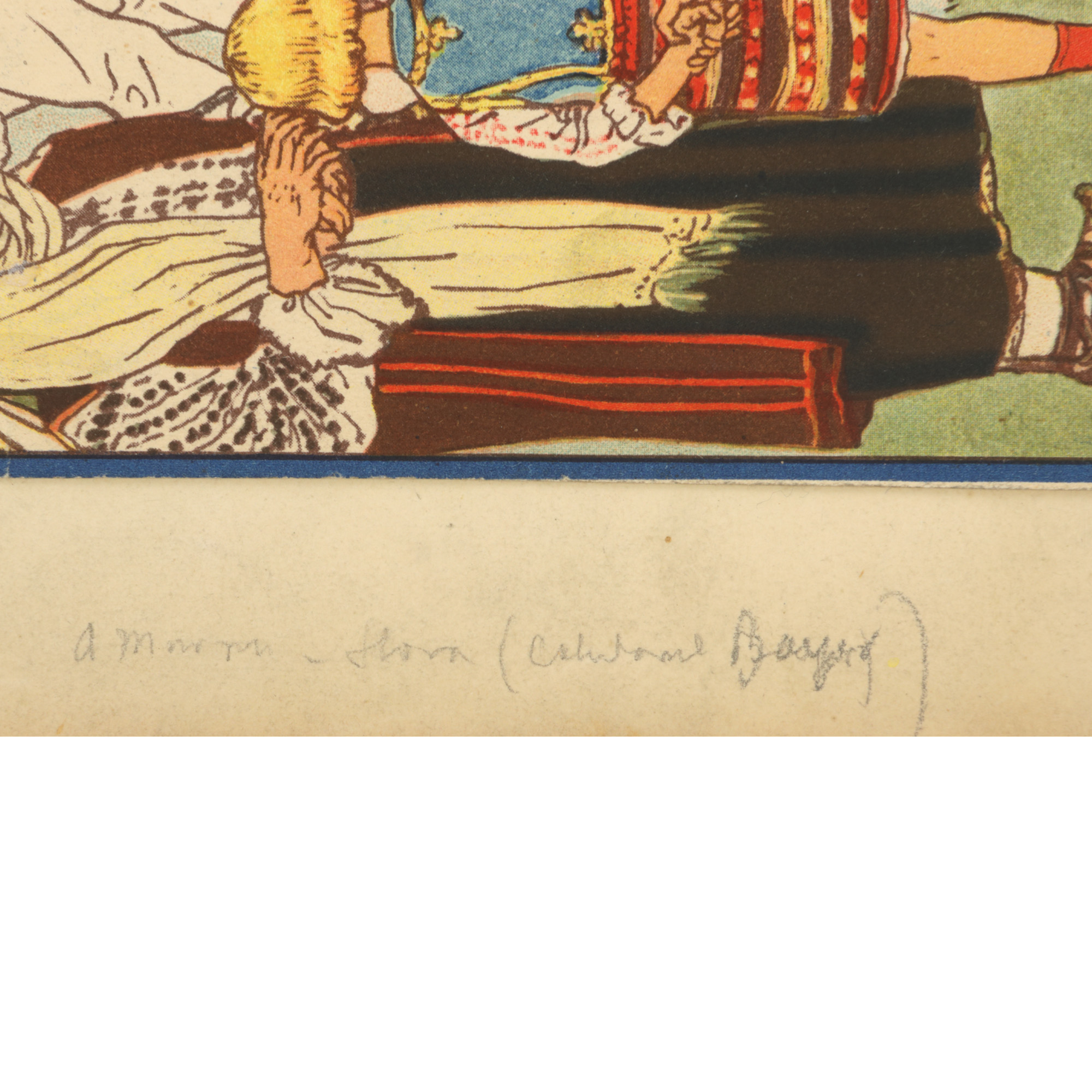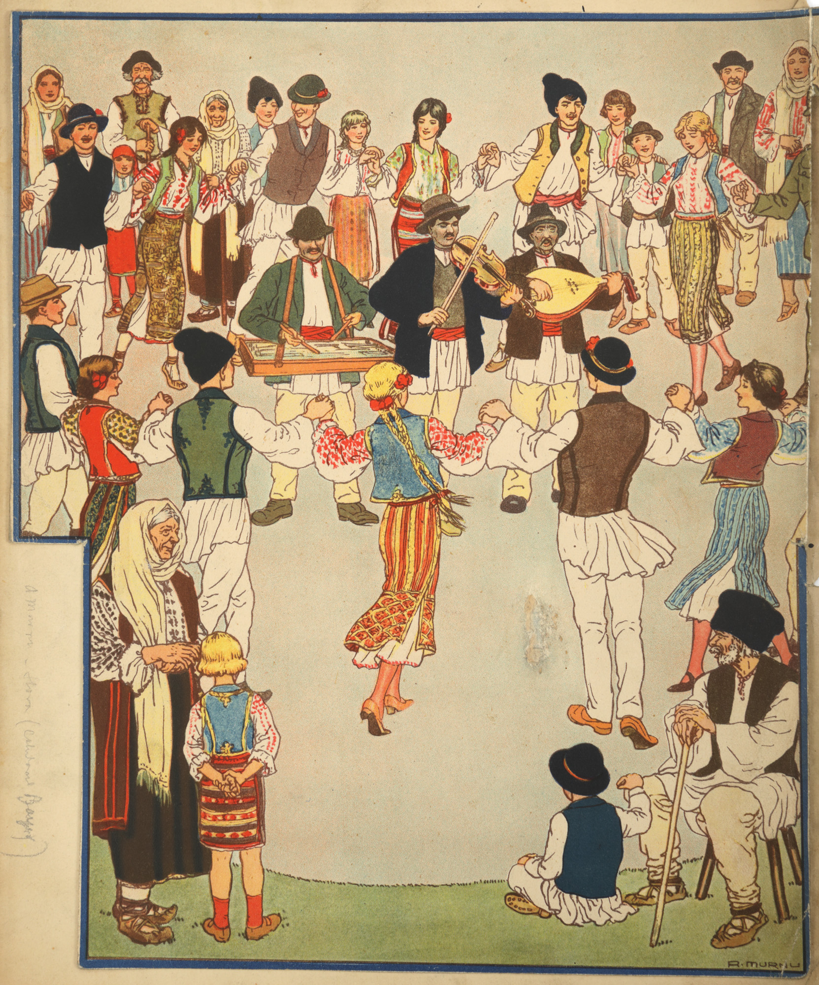 128. Coperta unui calendar, probă de tipar, cromolitografie ilustrând țărani la horă, semnată în tipar de Ary Murnu, cca. 1930, provine din colecția familiei de artiști Murnu