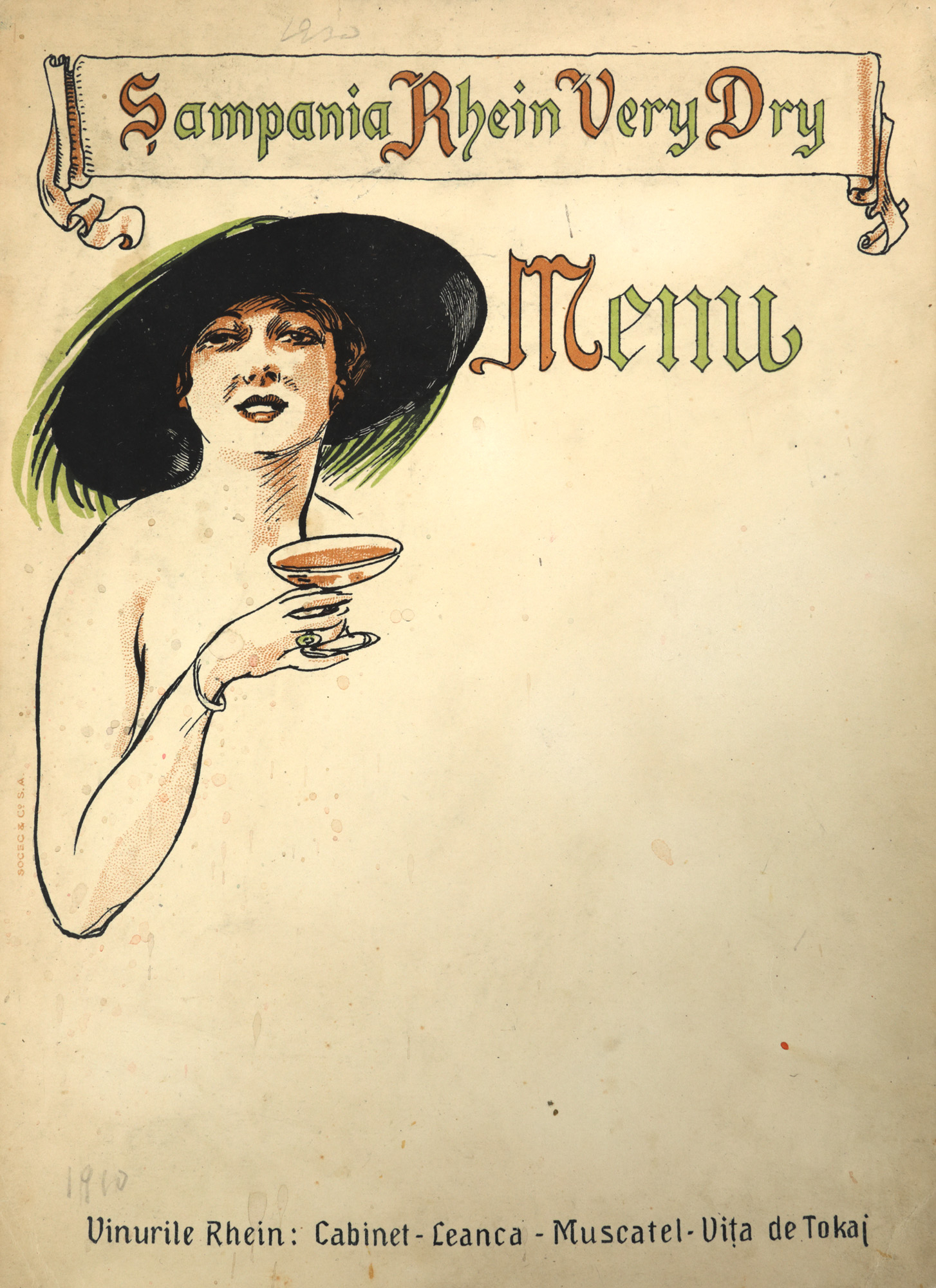 157. Cromolitografie Meniu "Șampania Rhein Very Dry", ilustrat de Ary Murnu, cca. 1930, provine din colecția familiei de artiști Murnu
