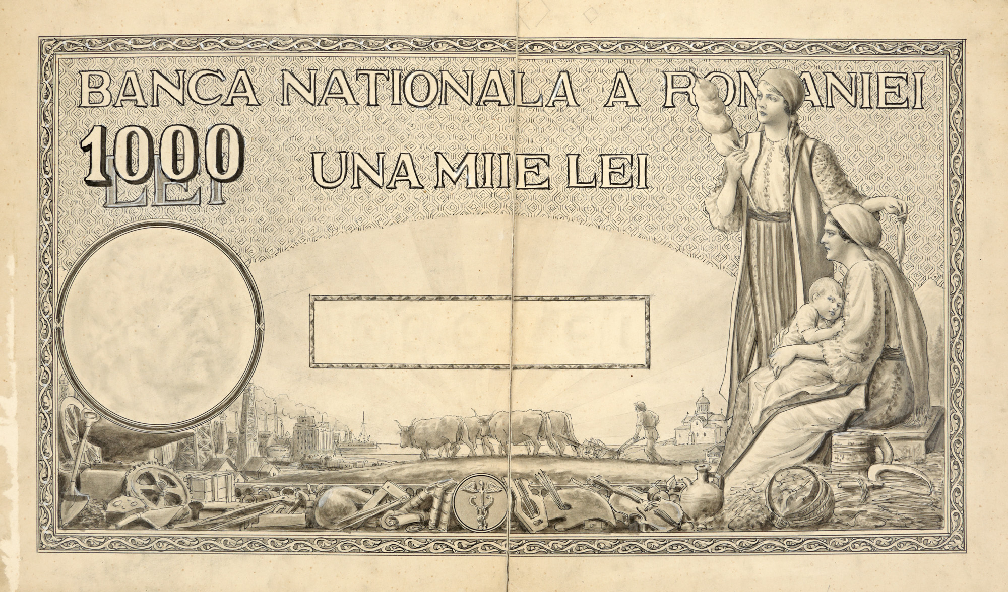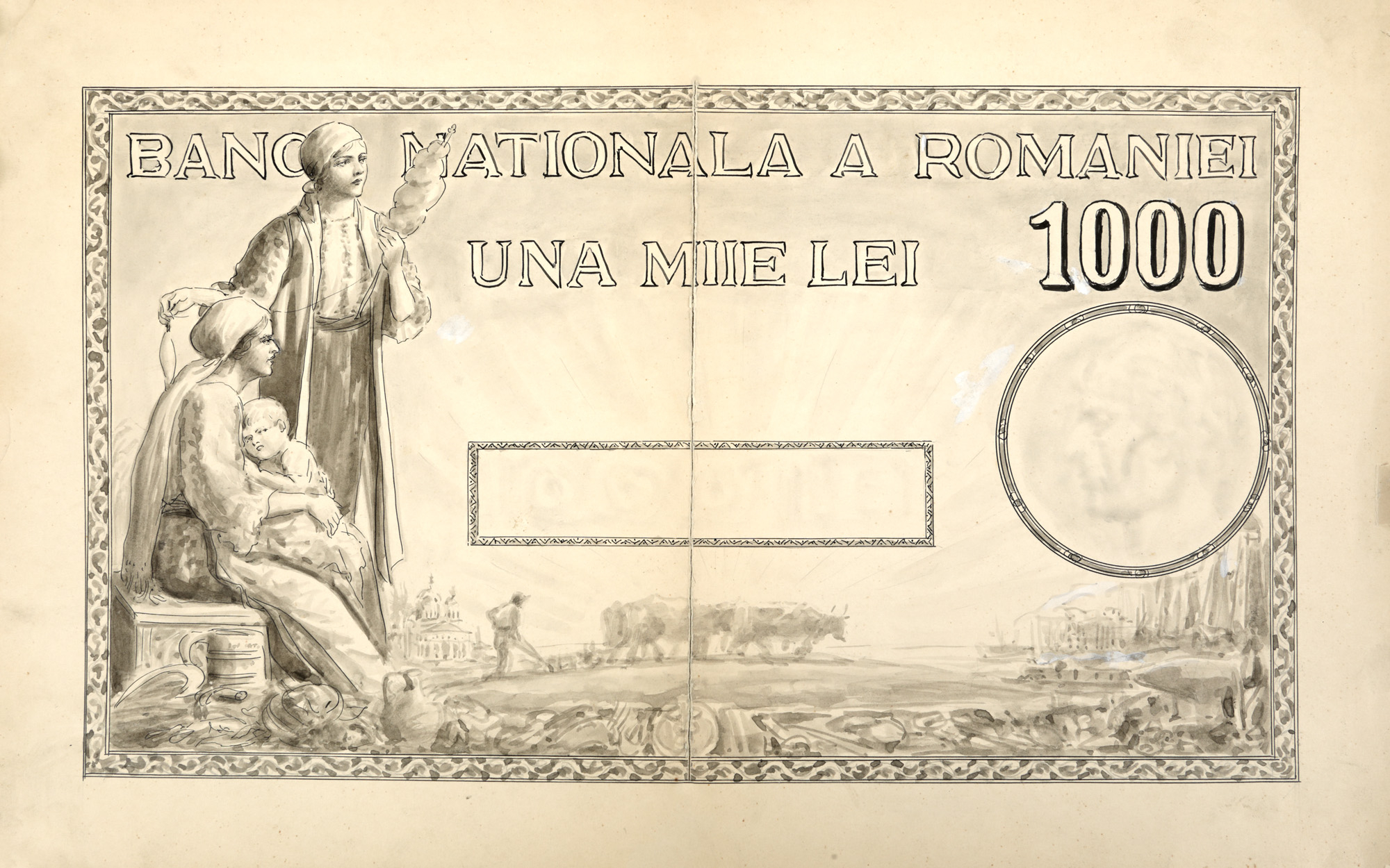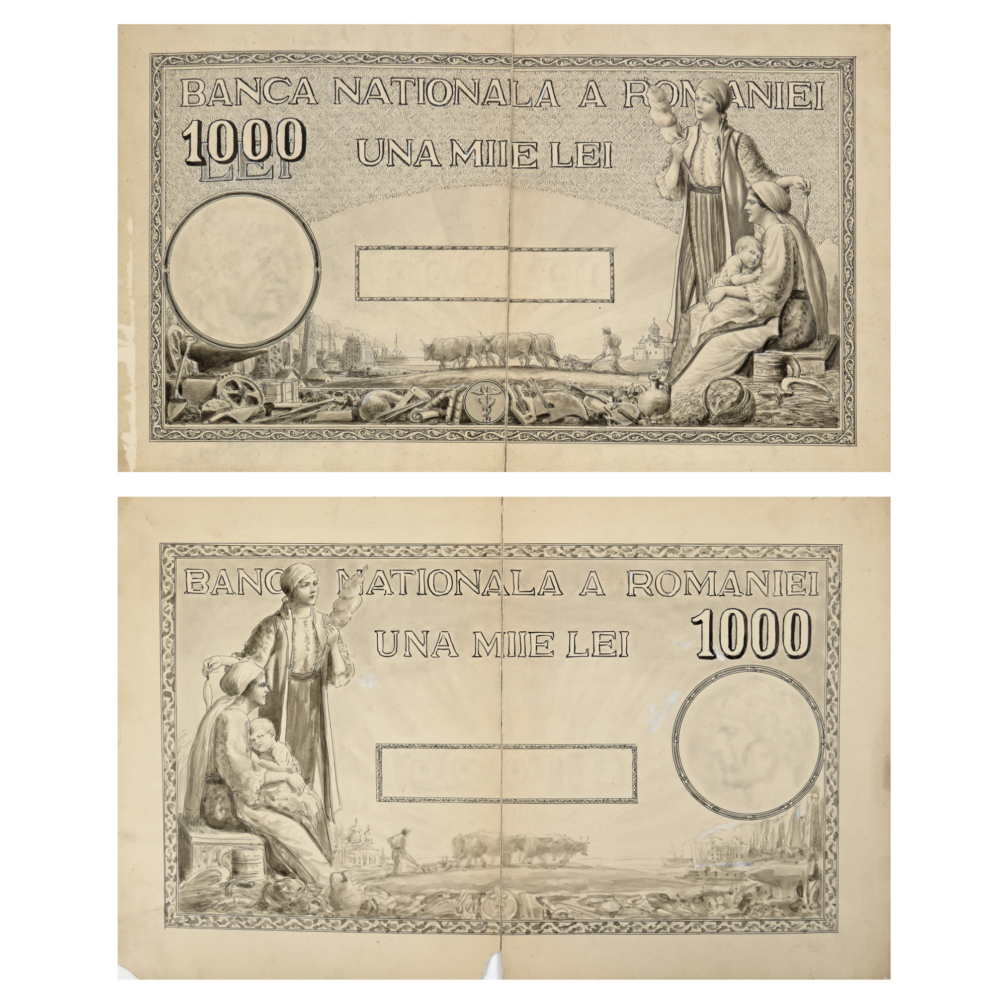 109. Două variante ale bancnotei de 1000 de lei, macheta originală realizată de Ary Murnu, 1934, piesă de colecție, provine din colecția familiei de artiști Murnu