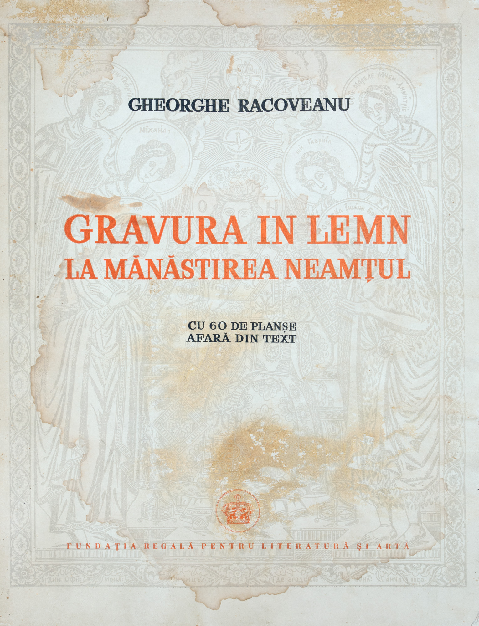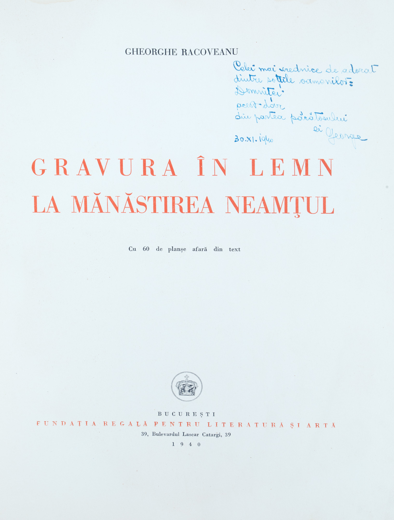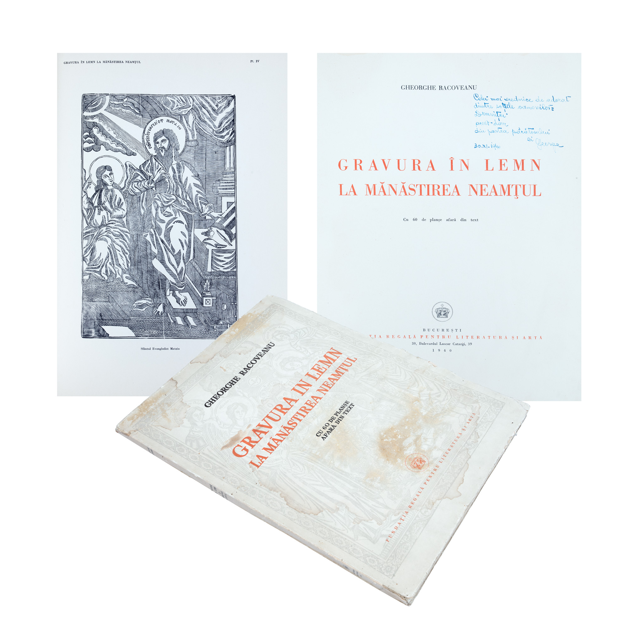89. ”Gravura în lemn la Mănăstirea Neamțul”, Gheorghe Racoveanu, București, 1940, cu dedicația olografă a autorului, provine din colecția scriitorului Vania Gherghinescu