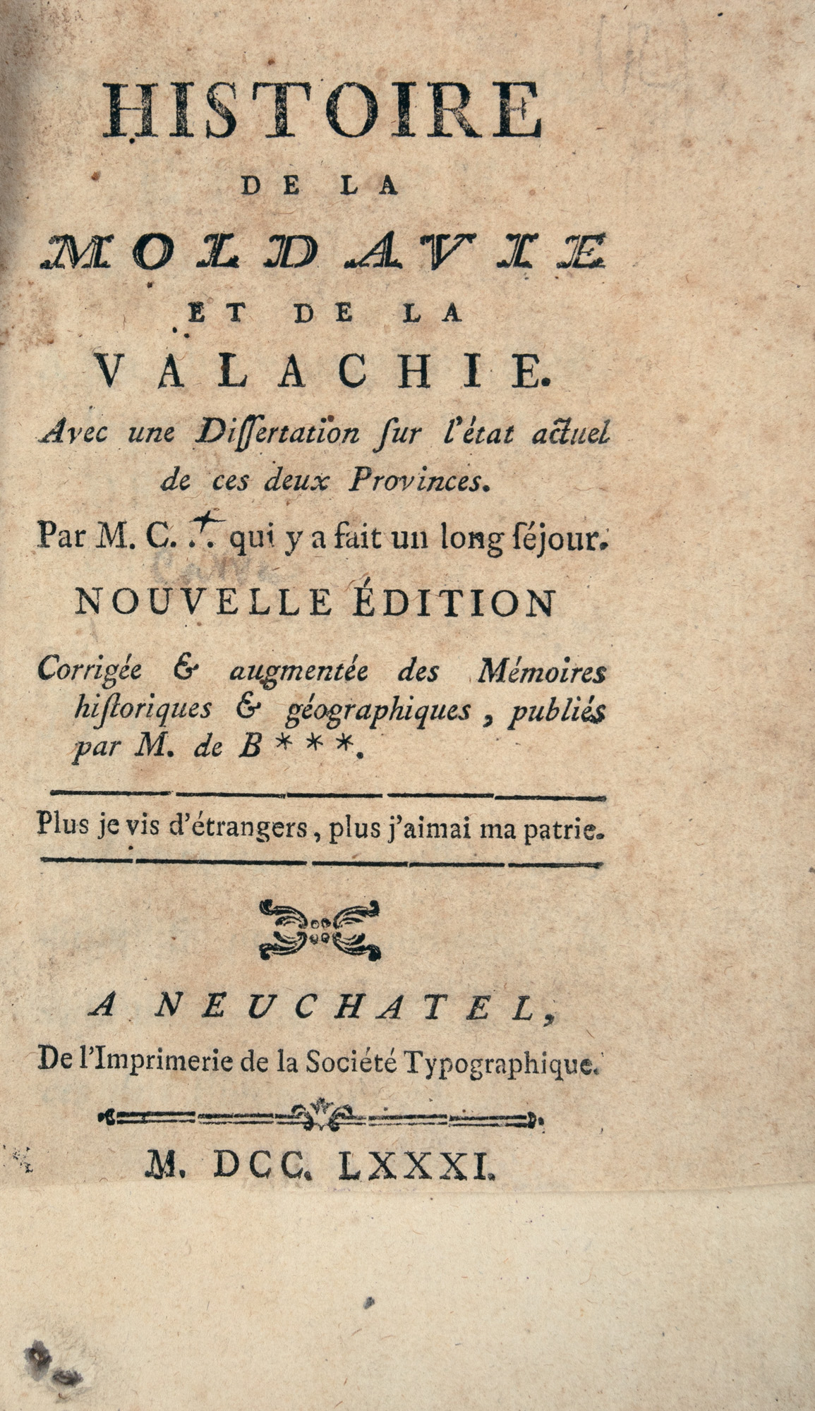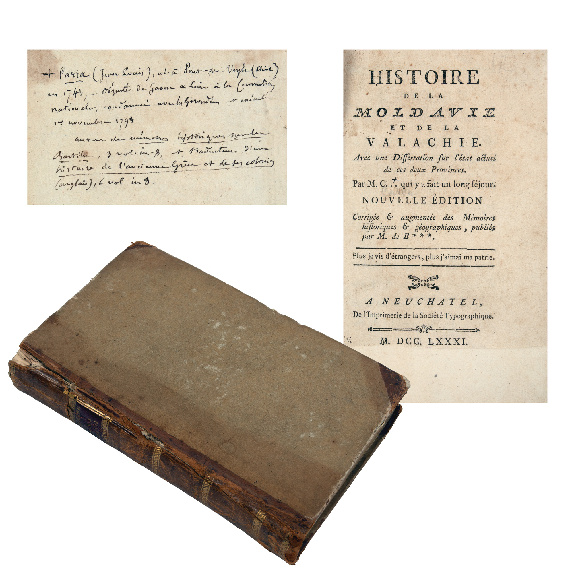 Din punct de vedere documentar, această operă cuprinde descrierea geografică a celor două provincii românești, o istorie a familiilor domnitoare (Cantemir, Ghika, Brâncoveanu etc.), statistici demografice, date despre comerț, justiție și armată, descrierea culturilor, plantelor și animalelor etc.. Avem o ediție nouă, format in 8º, publicată la Neuchâtel în anul 1781, apartinând lui Jean-Luis Carra și publicată de Friedrich Wilhelm von Bauer, cu 371 de pagini numerotate, oglinda textului de 11 x 6 cm și 27 de rânduri în plină pagină. Legătura este originală din piele maron lipită pe carton, cotorul decorat cu elemente florale și titlul ”Histoire de la Moldavie”. Stare de conservare este foarte bună, cu o însemnare olografă pe prima filă din 1837