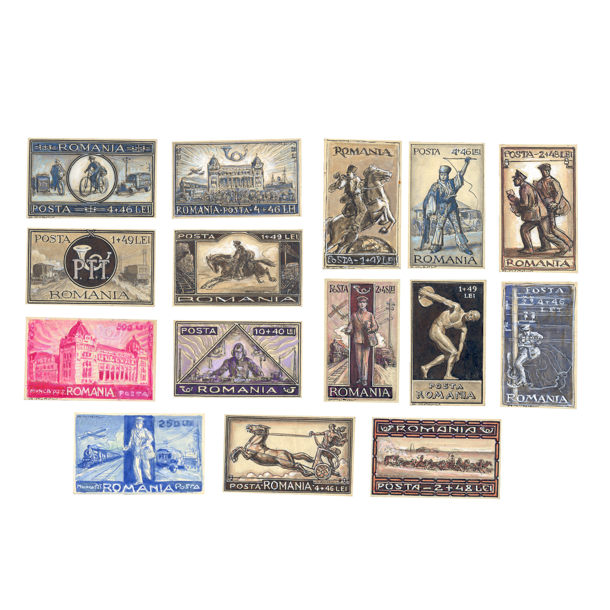 140. Lot format din 15 machete de timbre ”România” de Ary Murnu, valori poștale diferite, toate semnate olograf, piese deosebite, provine din colecția familiei de artiști Murnu