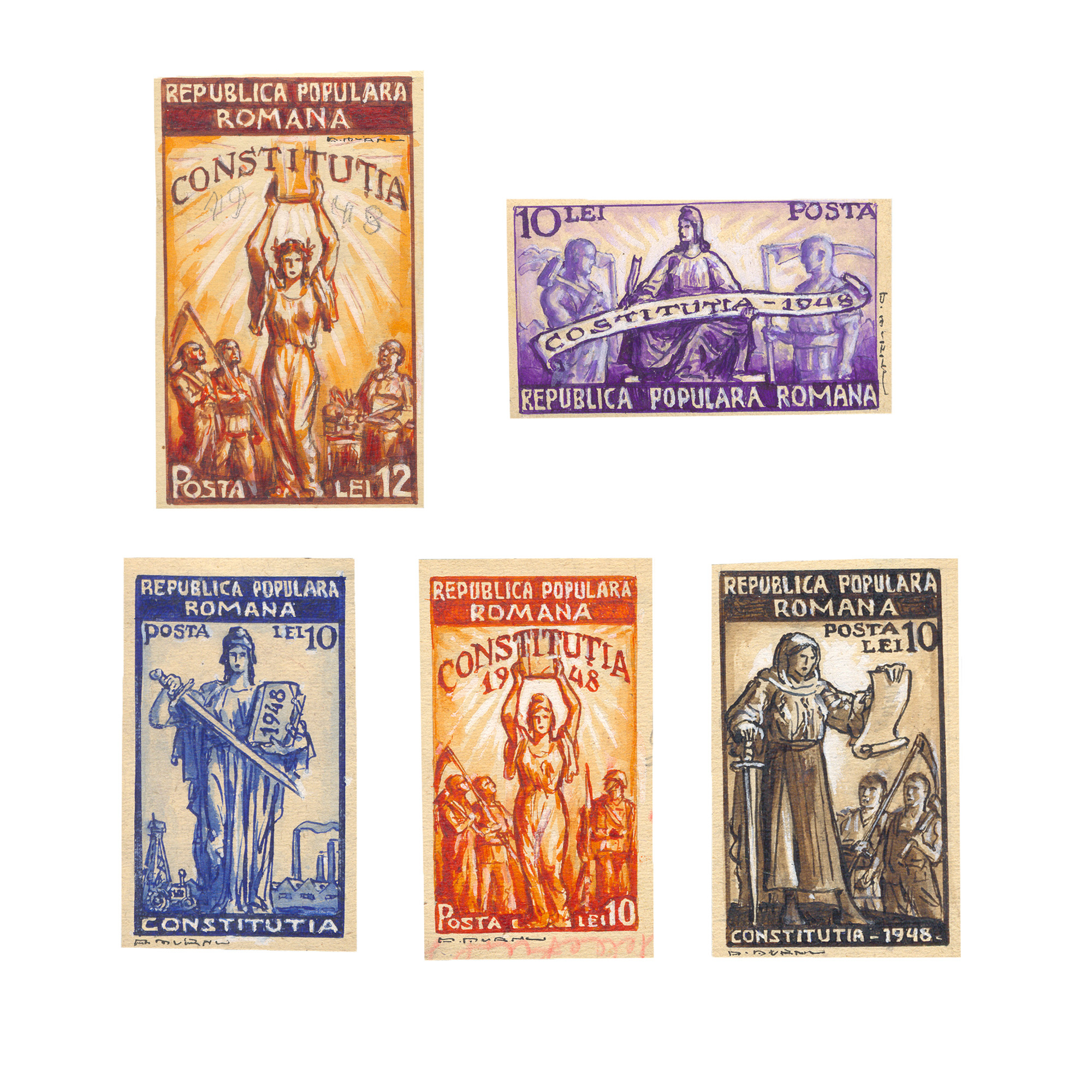 144. Lot format din cinci machete de timbre ”Constituția din 1948”, de Ary Murnu, valori poștale diferite, toate semnate olograf, piese de colecție, provine din colecția familiei de artiști Murnu