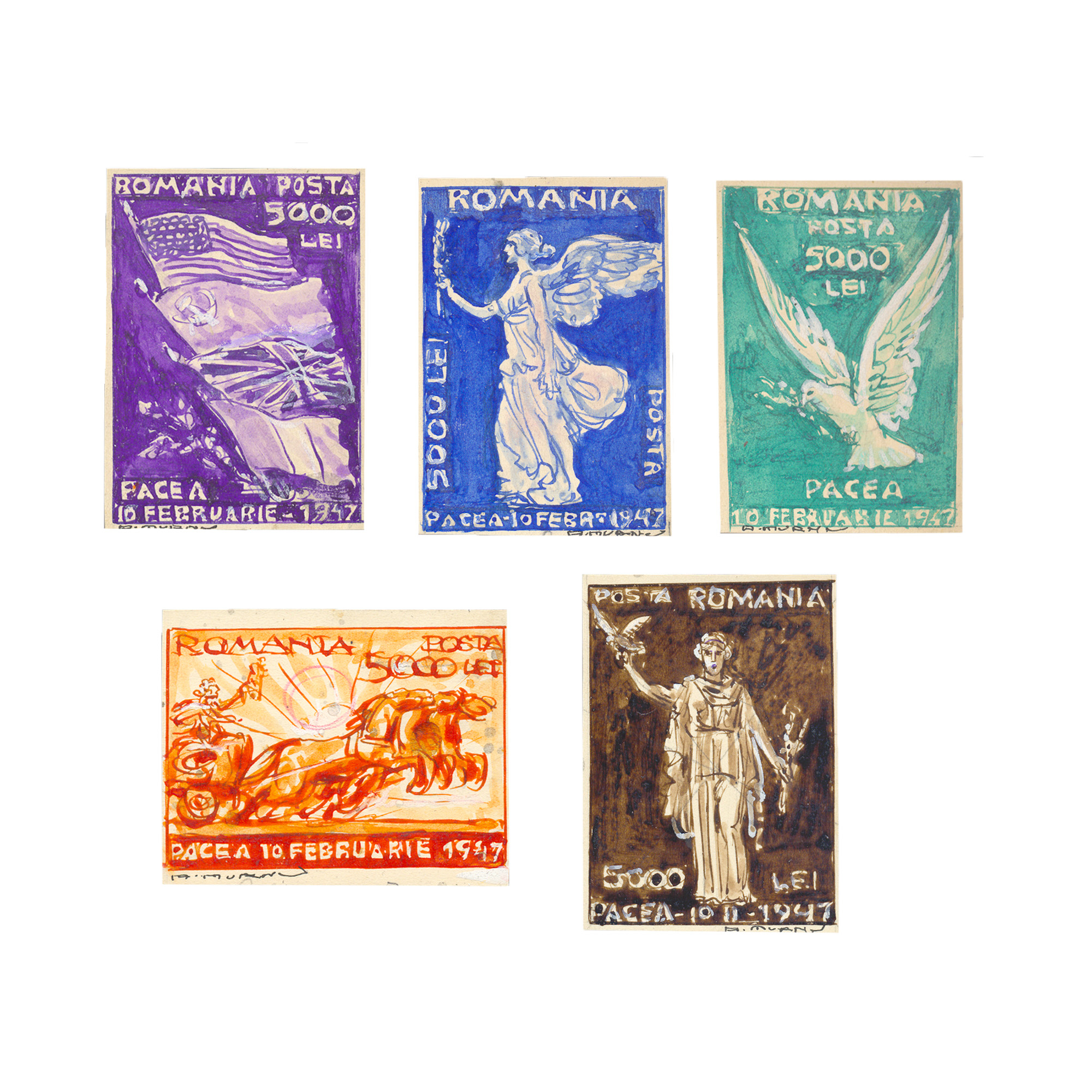 142. Lot format din cinci machete de timbre ”Pacea, 10 februarie 1947”, de Ary Murnu, valoare poștală 5000 de lei, toate semnate olograf, piese de colecție, provine din colecția familiei de artiști Murnu