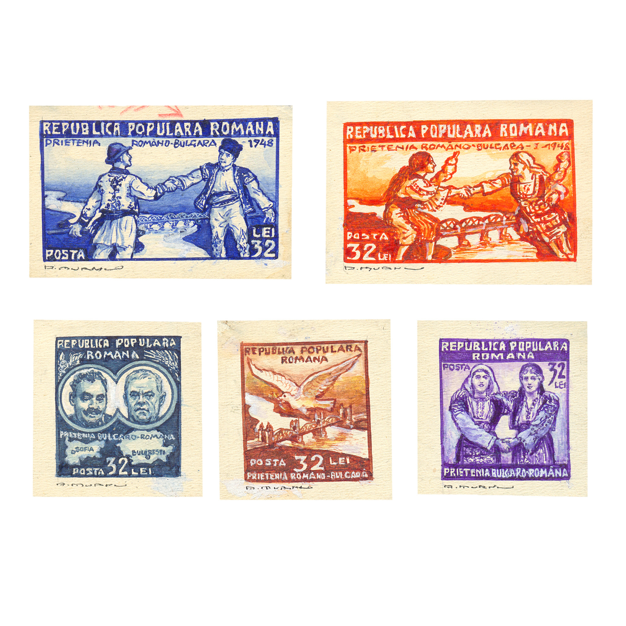 152. Lot format din cinci machete de timbre ”Prietenia Româno-Bulgară”, de Ary Murnu, valoare poștală 32 lei, toate semnate olograf, provine din colecția familiei de artiști Murnu