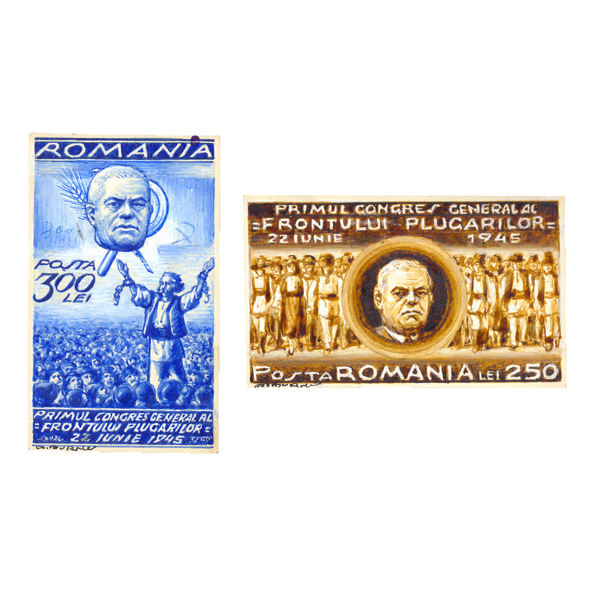 146. Lot format din două machete de timbre ”Primul Congres General al Frontului Plugarilor, 22 iunie 1945”, de Ary Murnu, valori poștale diferite, ambele semnate olograf, provine din colecția familiei de artiști Murnu