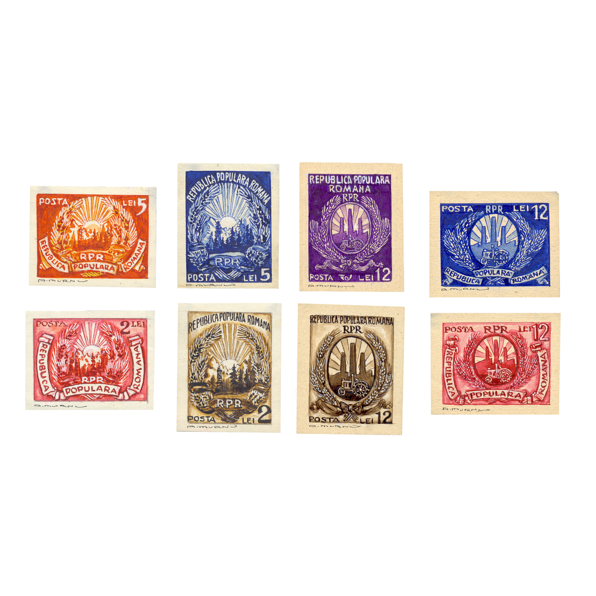 143. Lot format din opt machete de timbre ”Republica Populară Română”, de Ary Murnu, valori poștale diferite, toate semnate olograf, piese spendide, de colecție, provine din colecția familiei de artiști Murnu