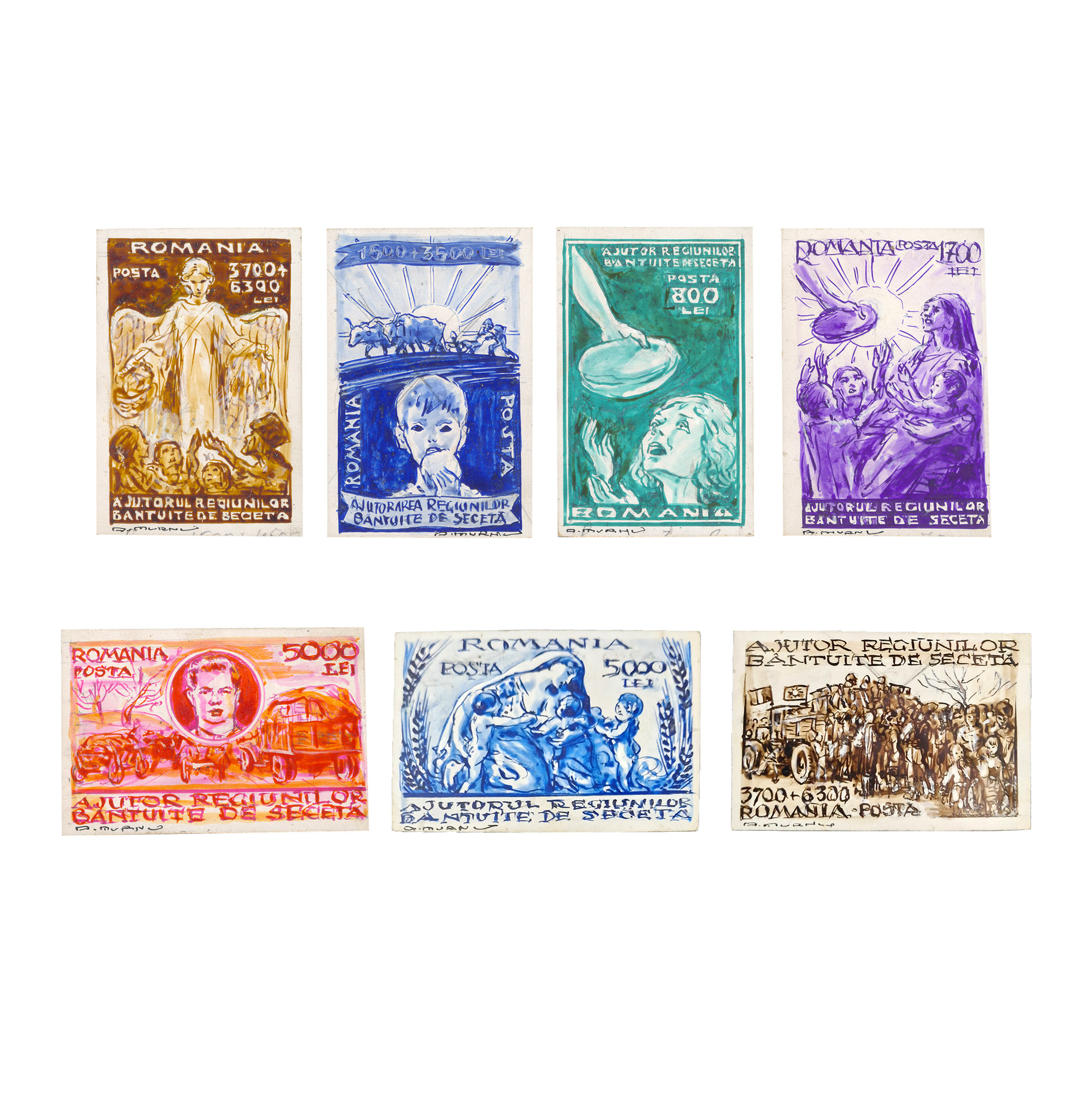 145. Lot format din șapte machete de timbre ”Ajutorul Regiunilor Bântuite de Secetă”, de Ary Murnu, valori poștale diferite, toate semnate olograf, piese splendide, de colecție, provine din colecția familiei de artiști Murnu