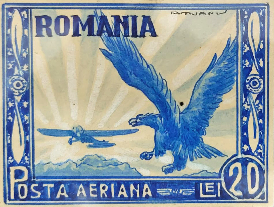 133. Machetă timbru de Ary Murnu, ”Poșta aeriană”, valoare poștală 20 de lei, cu semnătură olografă, provine din colecția familiei de artiști Murnu