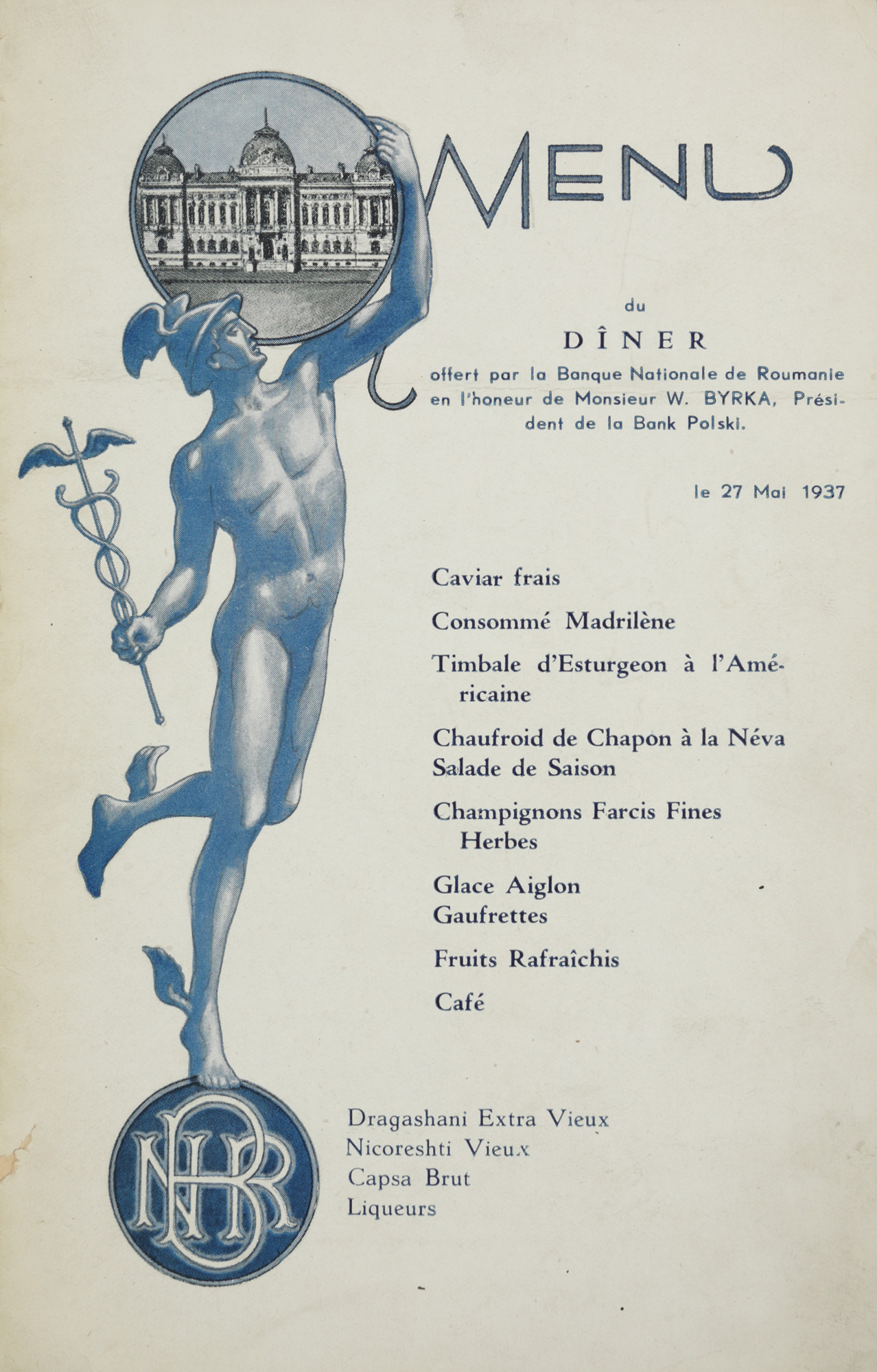 156. Meniul cinei oferite de Banca Națională a României în onoarea președintele Băncii Naționale a Poloniei, Władysław Byrka, ilustrat de Ary Murnu, 1937, provine din colecția familiei de artiști Murnu