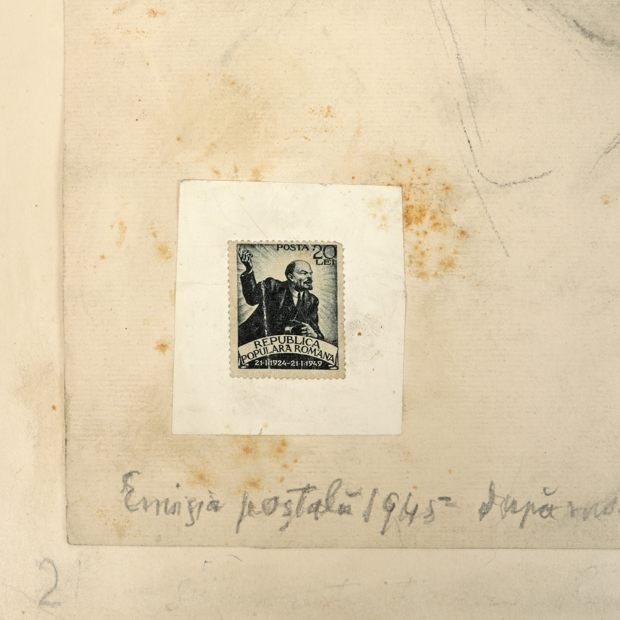 Piesa reprezintă portretul care a figurat pe macheta originală realizată în cărbune de Ary Murnu a emisiunii filatelice apărute în 1947, dedicată liderului revoluției bolșevice Vladimir Ilici Lenin.