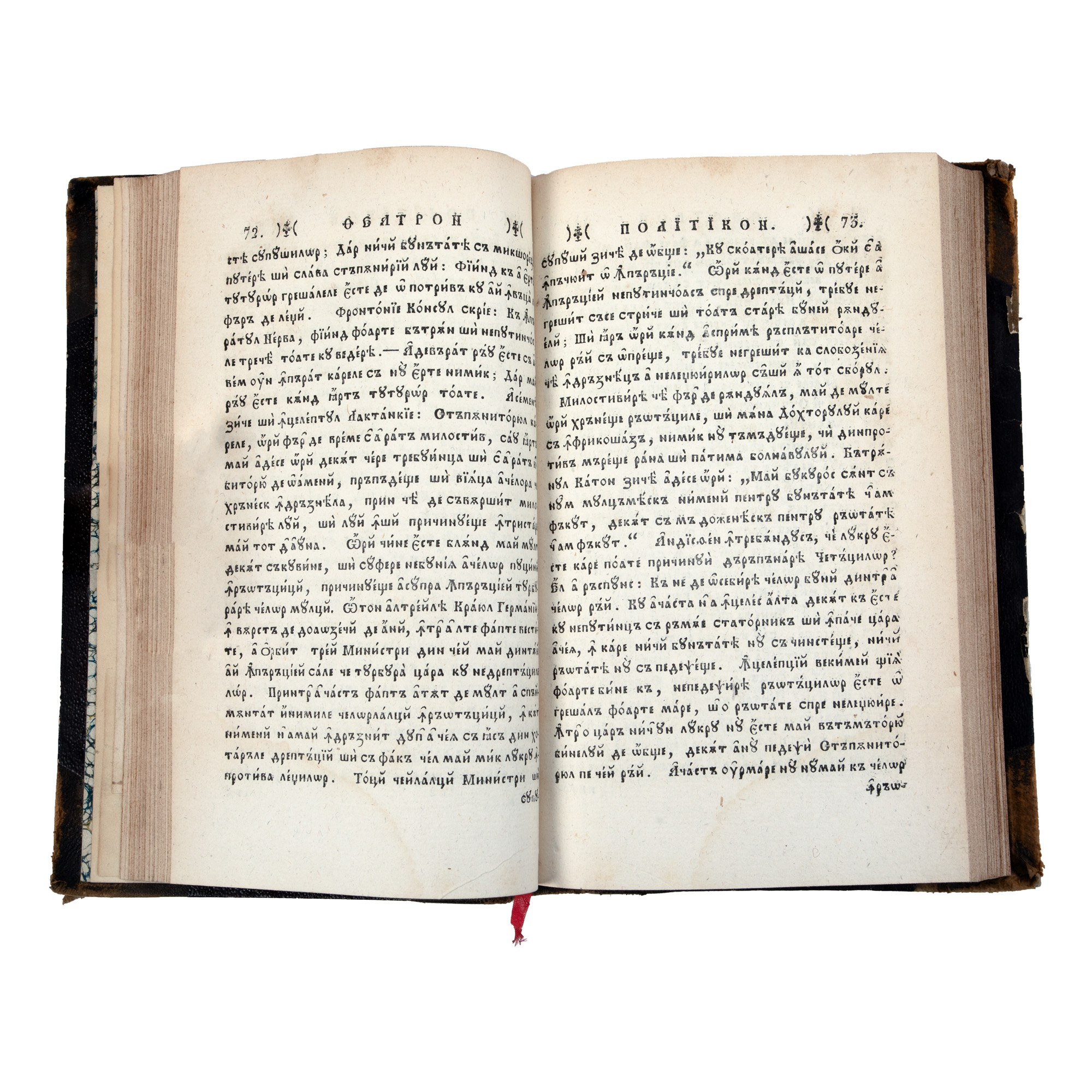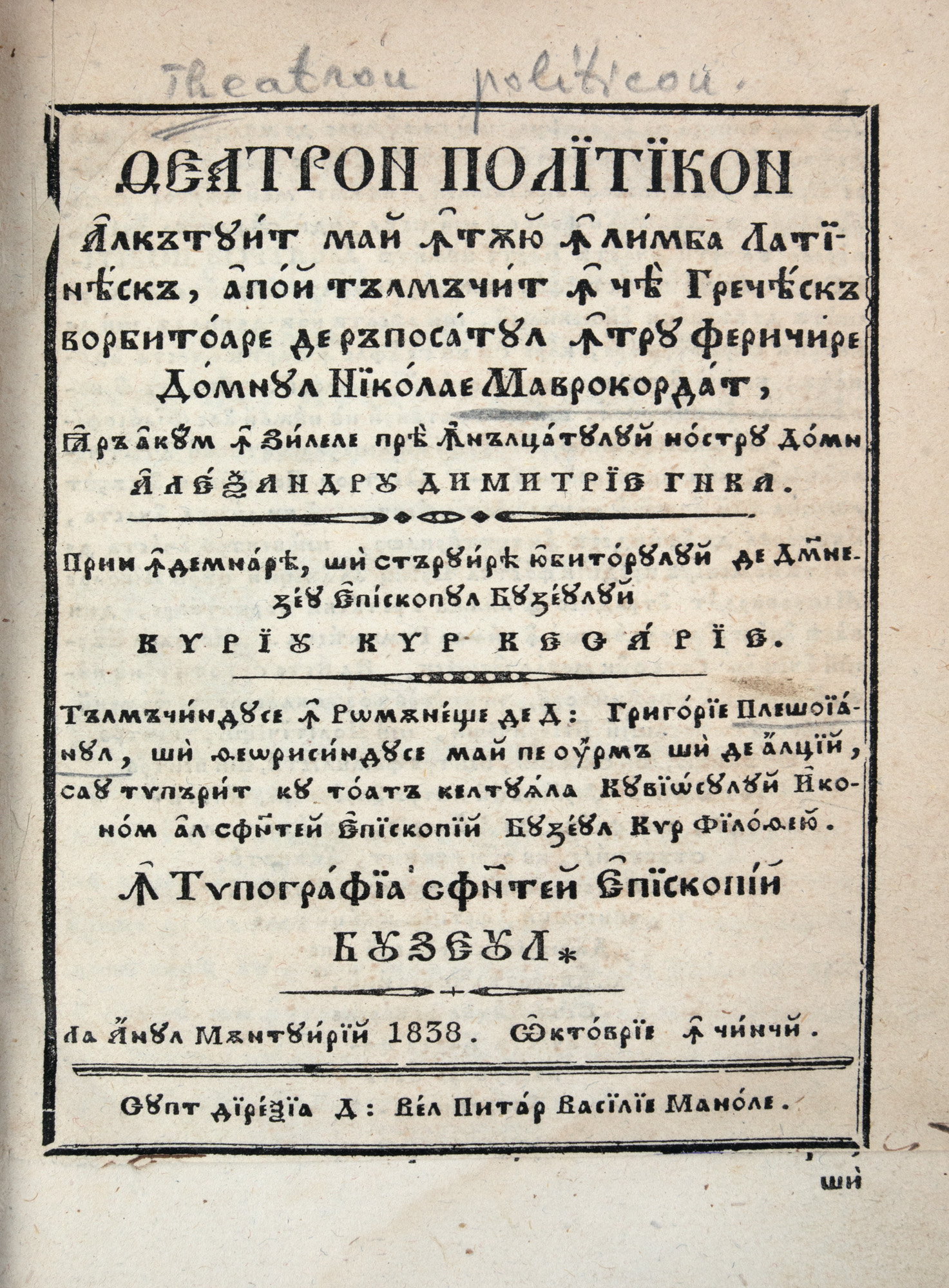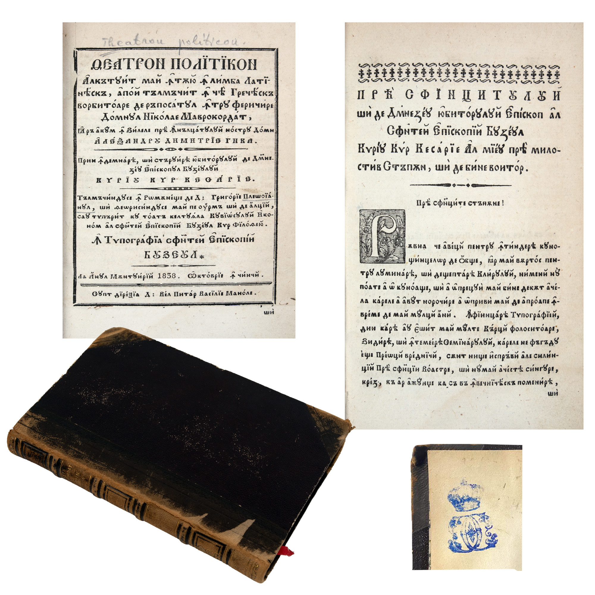 105. ”Teatron politicon”, de Ambrosius Marlianus, tradusă de Nicolae Mavrocordat, trei volume, Buzău, 1838, cu ex-libris Carol I